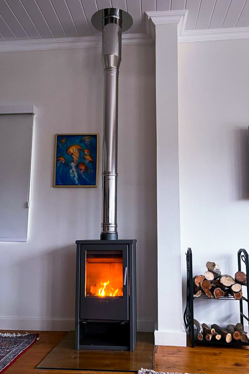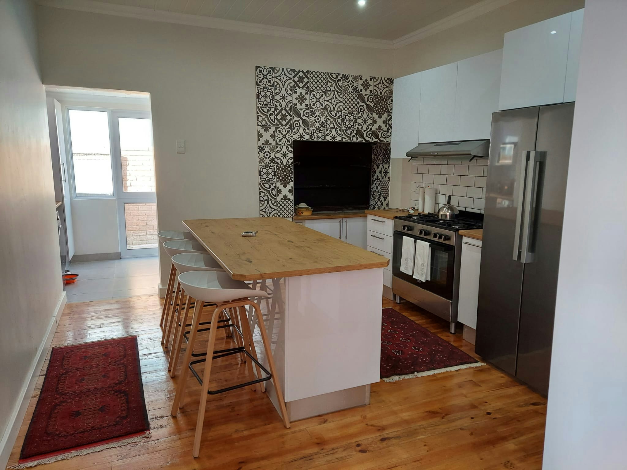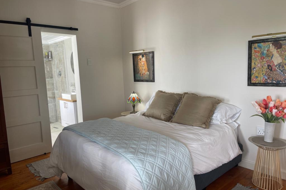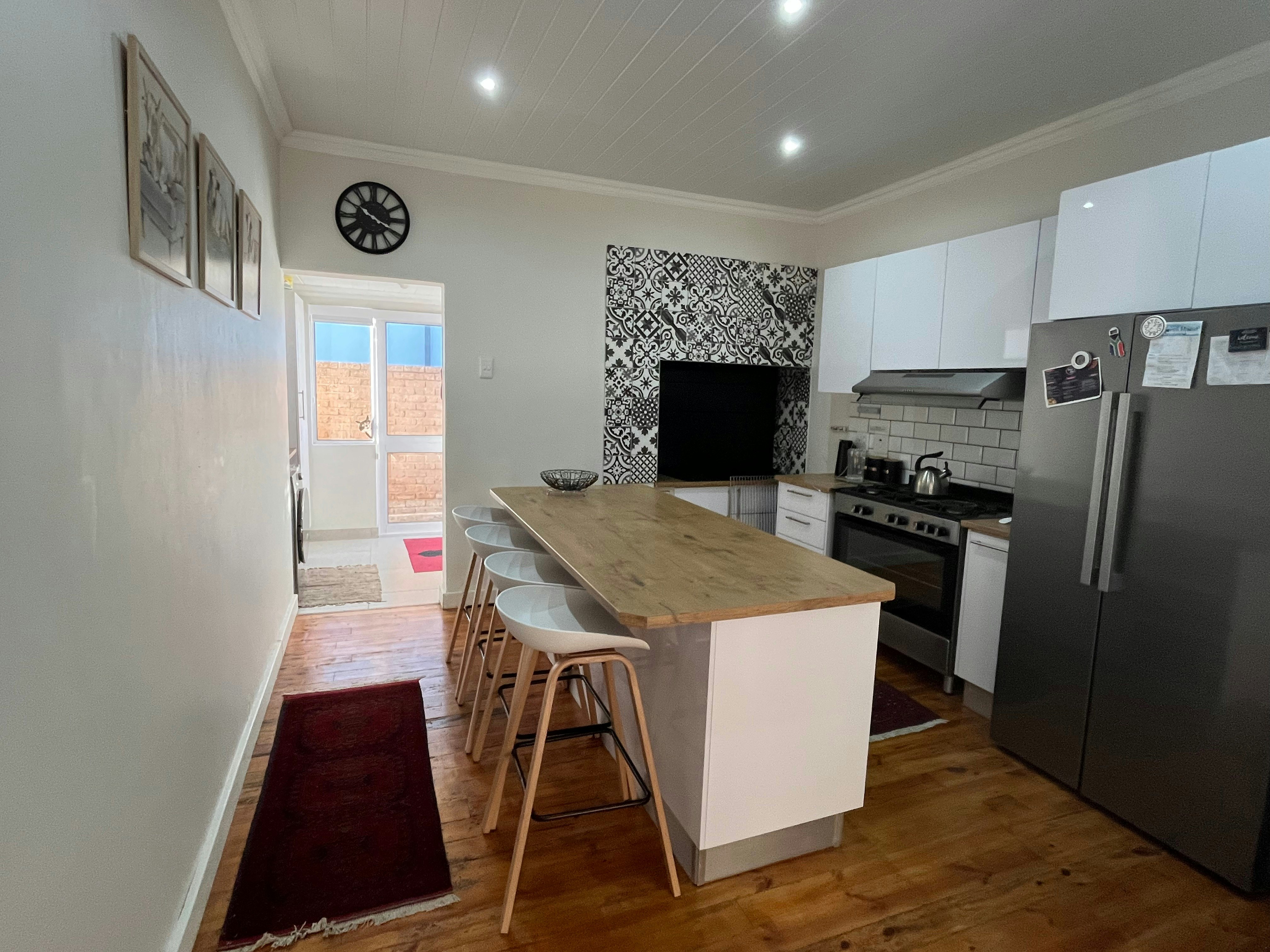 The living area offers comfortable couches, windows and doors that open up to a patio. The kitchen has a gas stove, oven, fridge-freezer, basic crockery and cutlery, tea and coffee-making facilities, and a centrally located breakfast island. Guests can also enjoy the convenience of a dishwasher and washing machine. There are indoor braai facilities in the kitchen, and the lounge has a fireplace that can be enjoyed during the brisk weather.