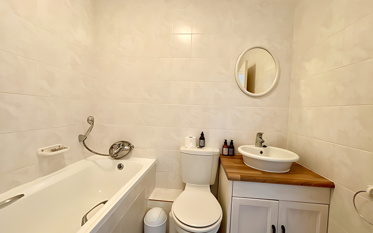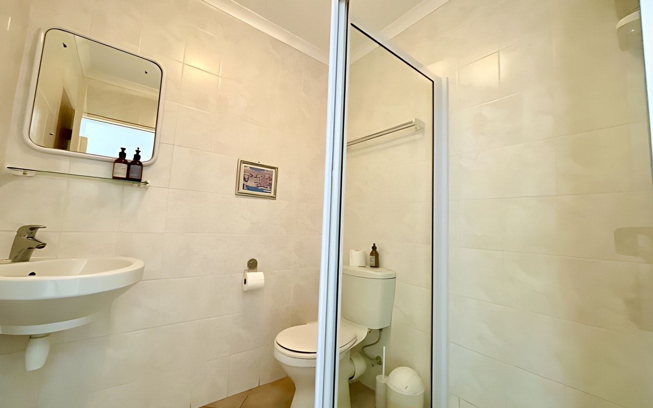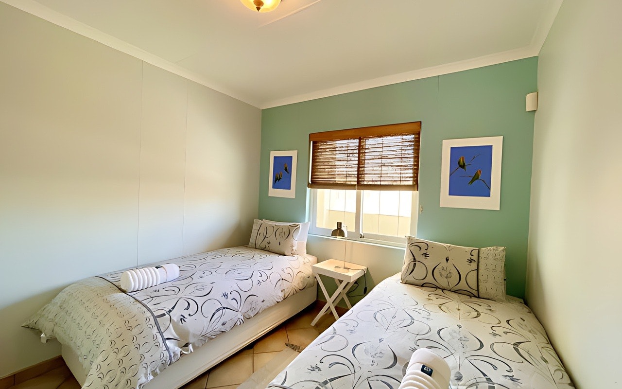 Die hoofslaapkamer is ingerig met 'n koningingrootte bed, en die tweede slaapkamer is ingerig met 2 enkelbeddens. Die eerste badkamer is toegerus met 'n bad, toilet en wasbak, en die tweede badkamer is toegerus met 'n stort, toilet en wasbak.