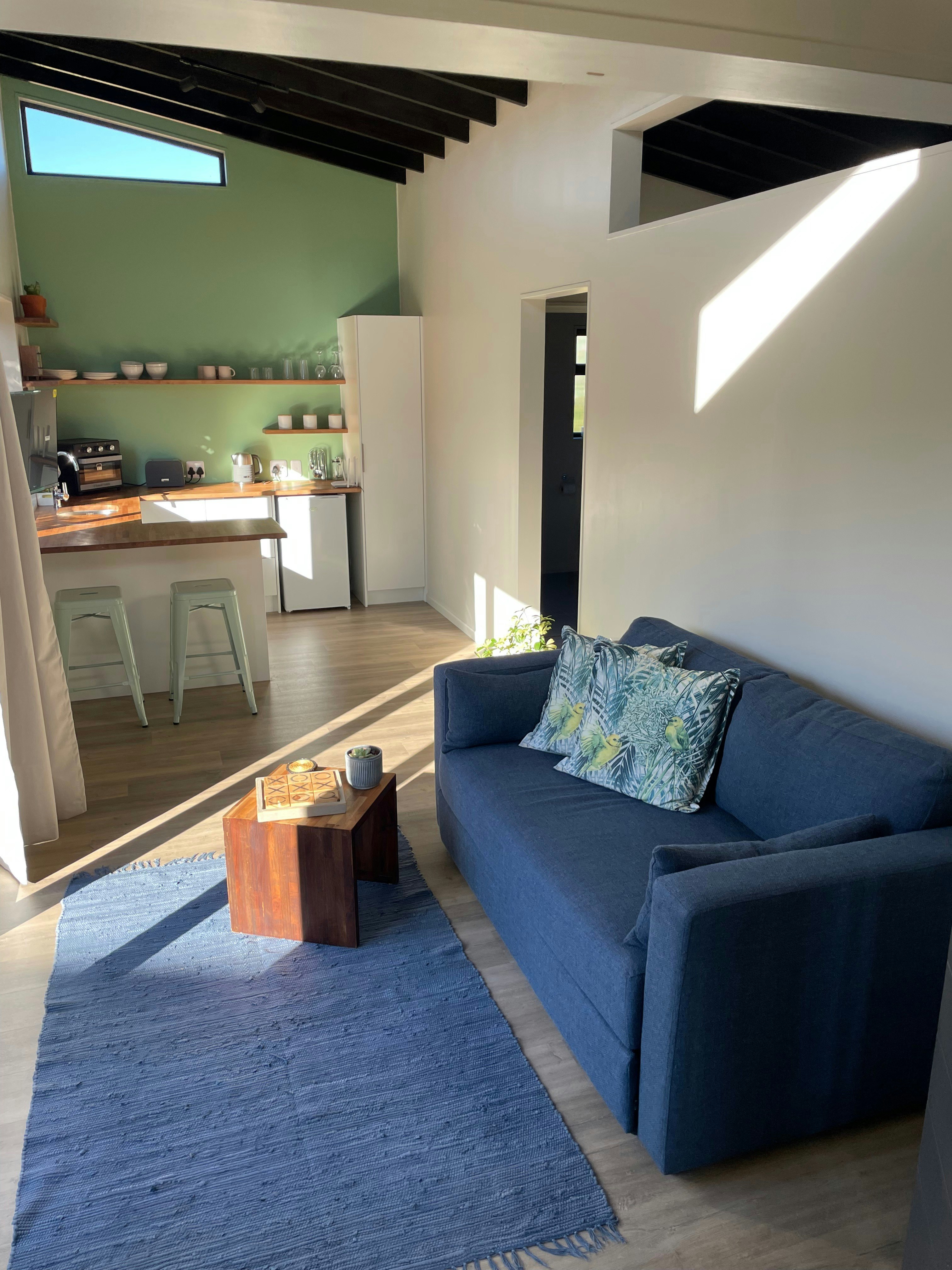 The living space features a lounge with a TV with Netflix and a comfortable couch. The kitchen is equipped with a bar fridge, air fryer, and toaster, as well as tea-and-coffee-making facilities.