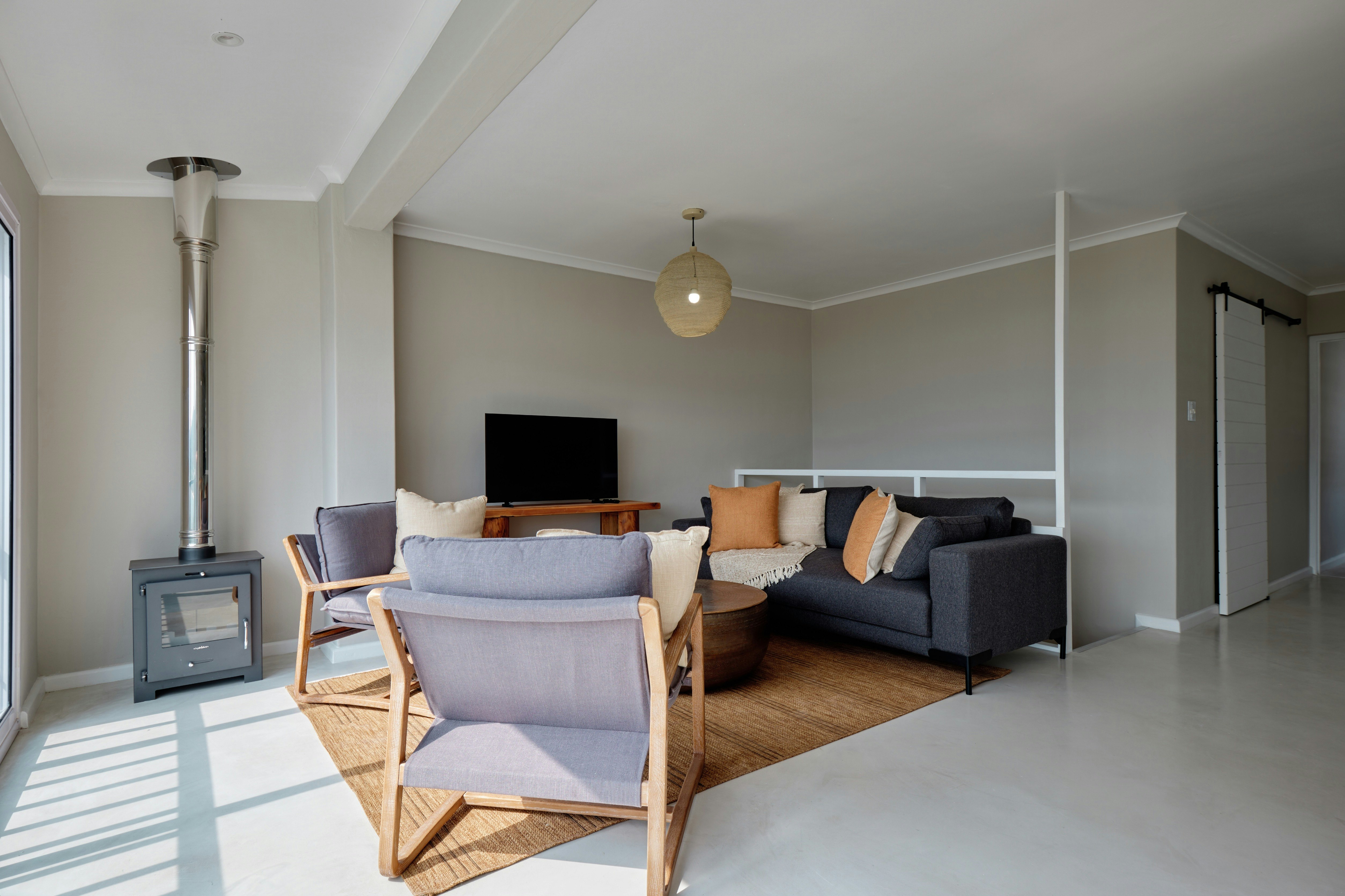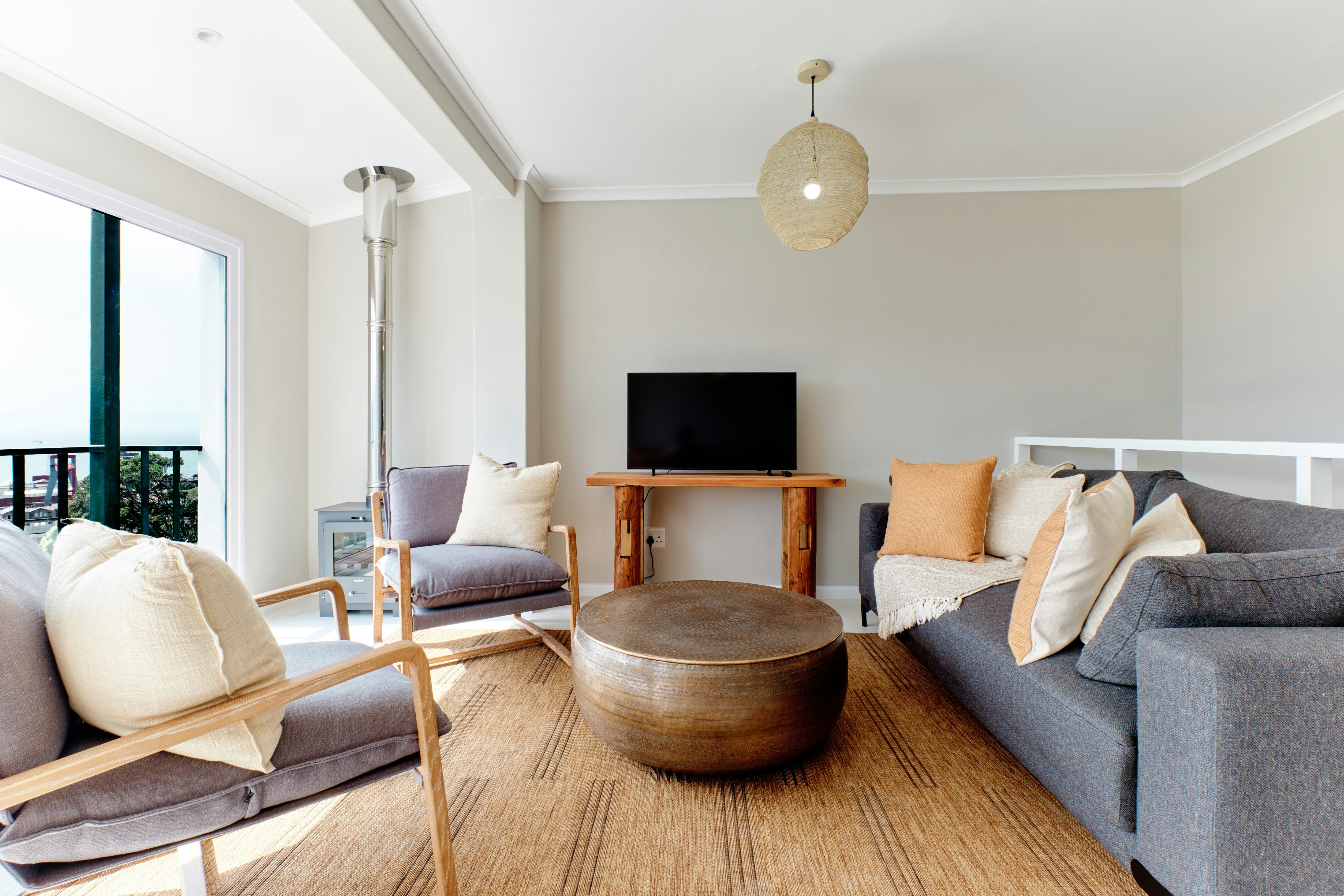 Die oopplan-leefarea spog met gemaklike sitplek, 'n TV, 'n knus kaggel, 'n eetkamertafel en 'n volledig toegeruste kombuis met 'n yskas-vrieskas, stoof, oond, mikrogolfoond, skottelgoedwasser en koffie- en teemaakgeriewe. Gaste kan na die balkon stap om asemrowende see-uitsigte te geniet, perfek vir oggendkoffie of aandsonsondergange.