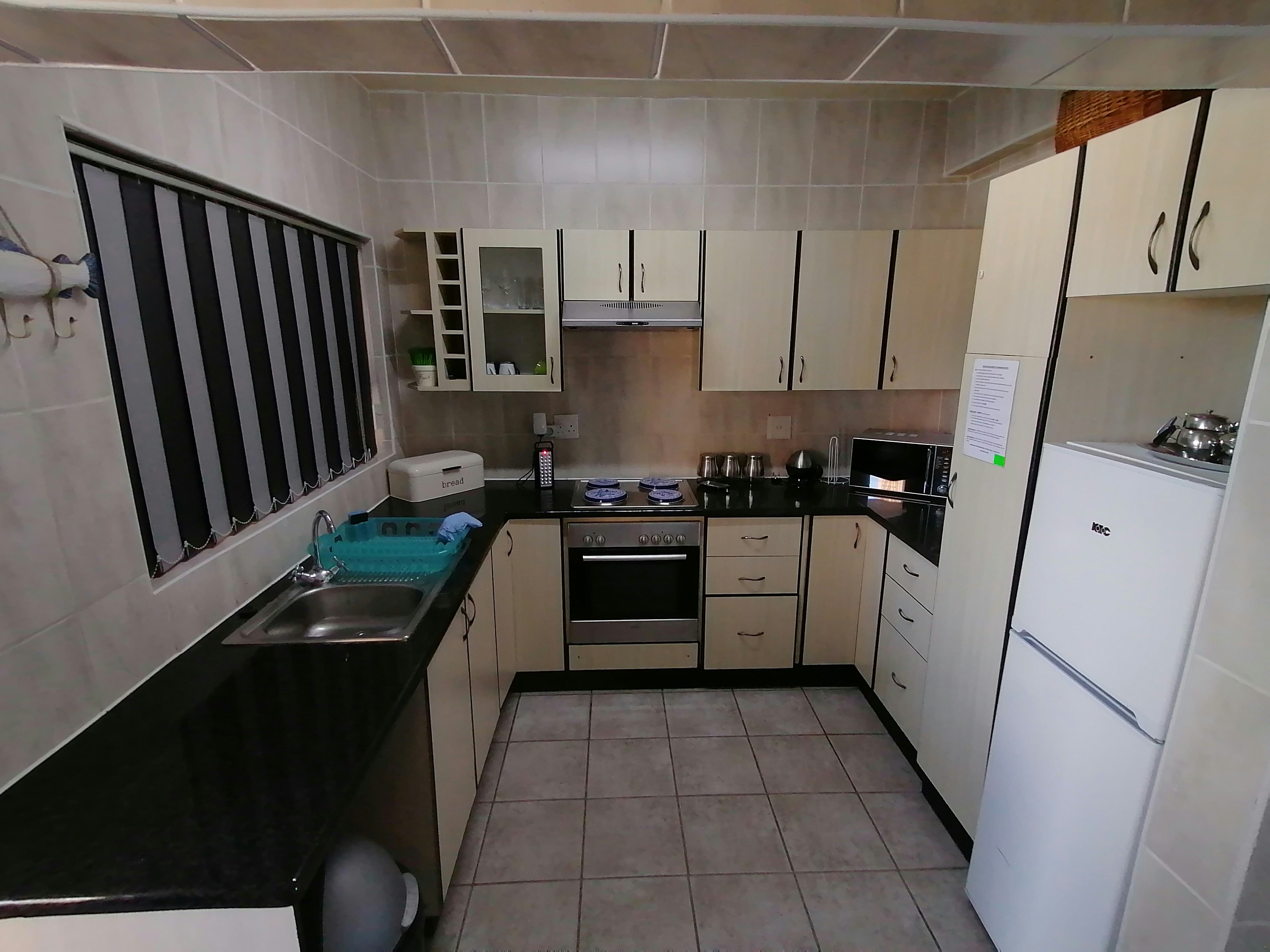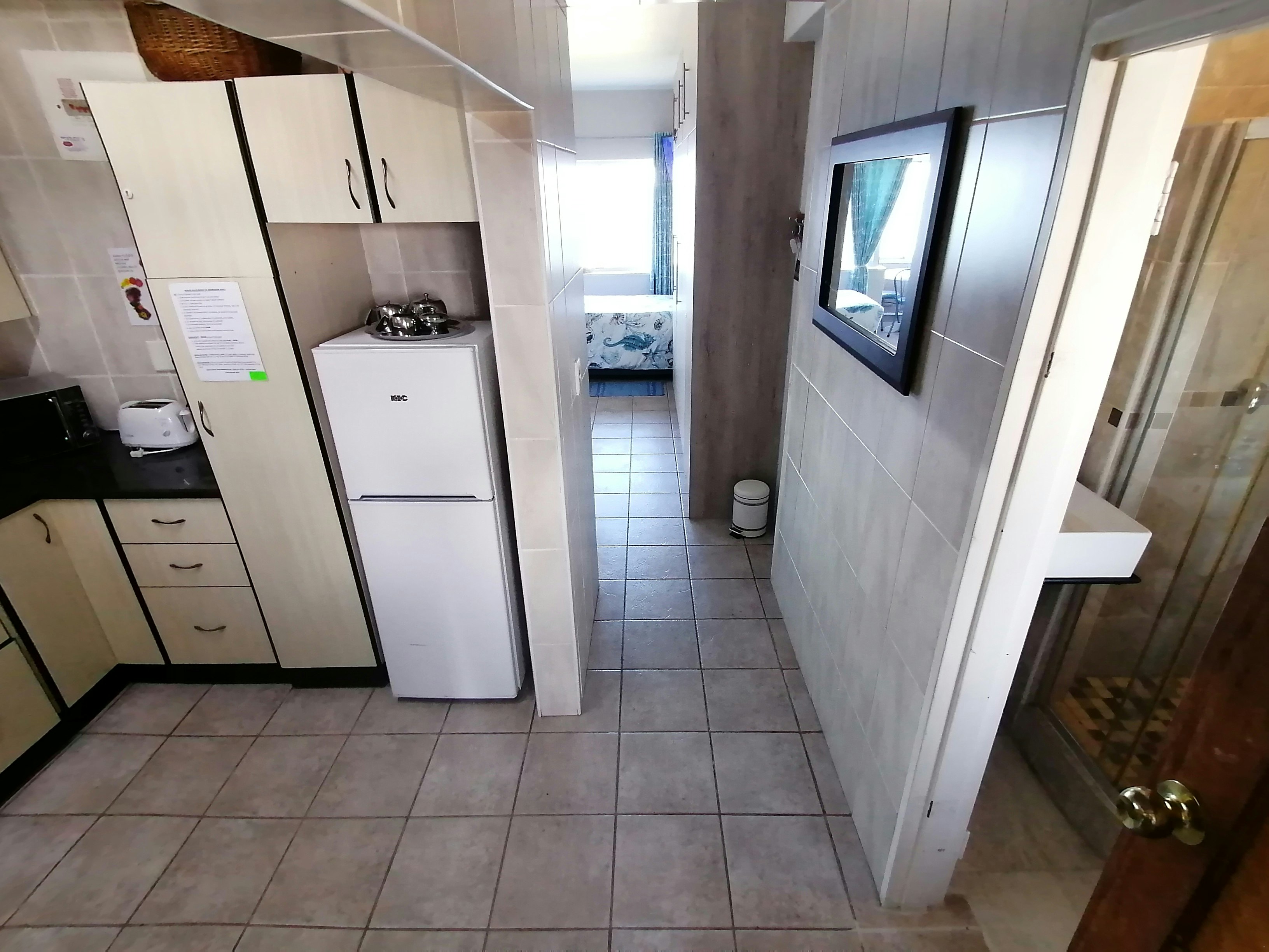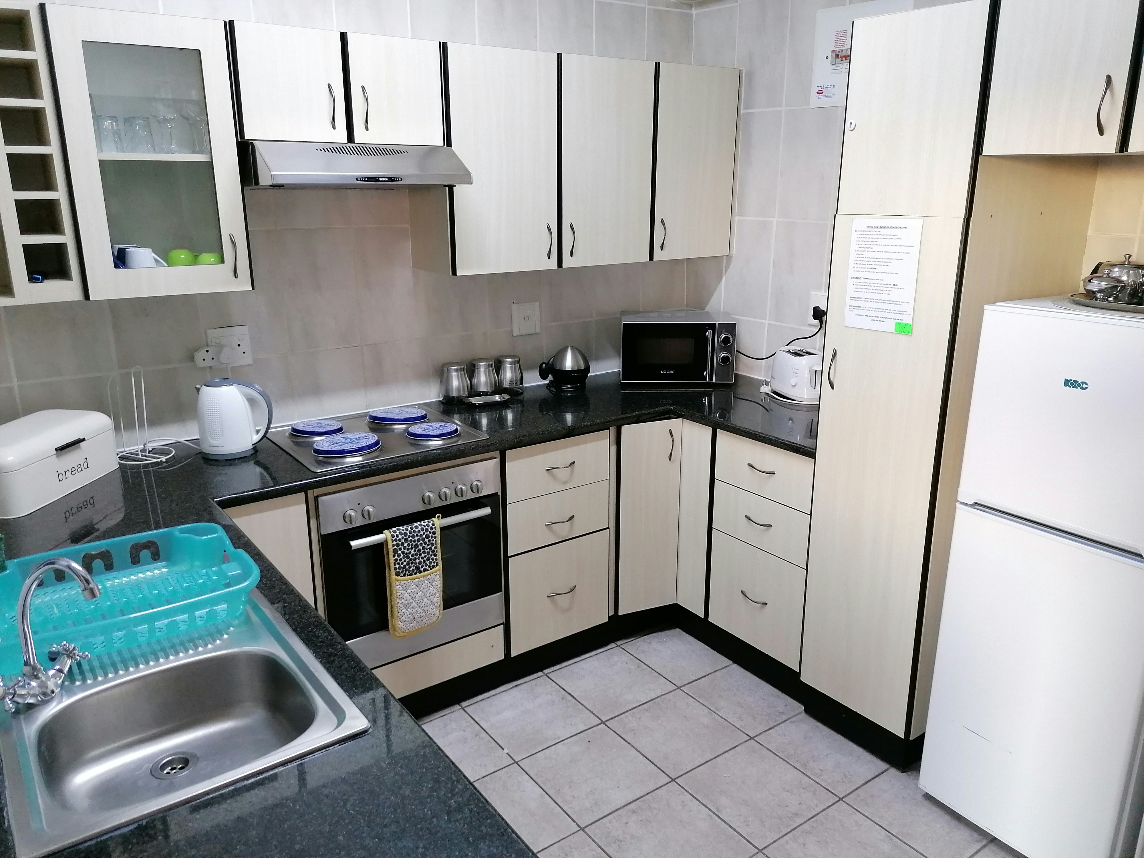 Die kombuis is met 'n stoof, oond, suigwaaier, mikrogolfoond, yskas en 'n ketel toegerus. Daar is ook 'n etenstafel in die leefarea wat ook 'n TV en gratis hoëspoed-WiFi het.