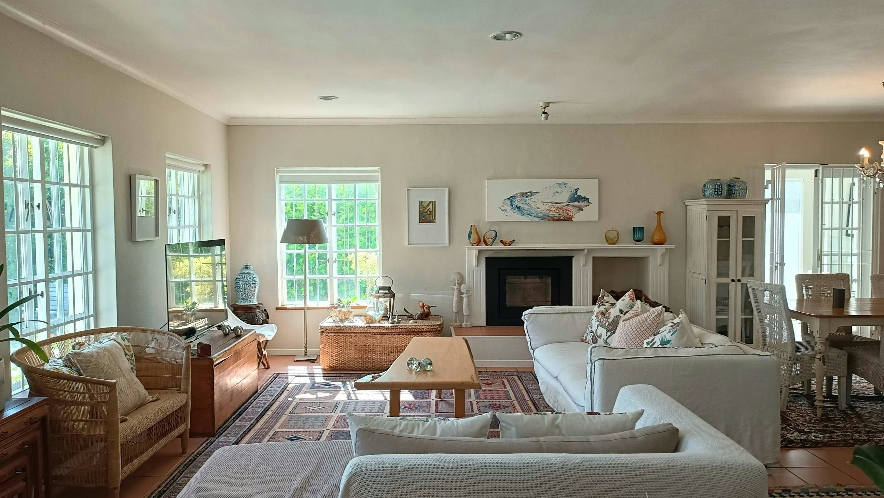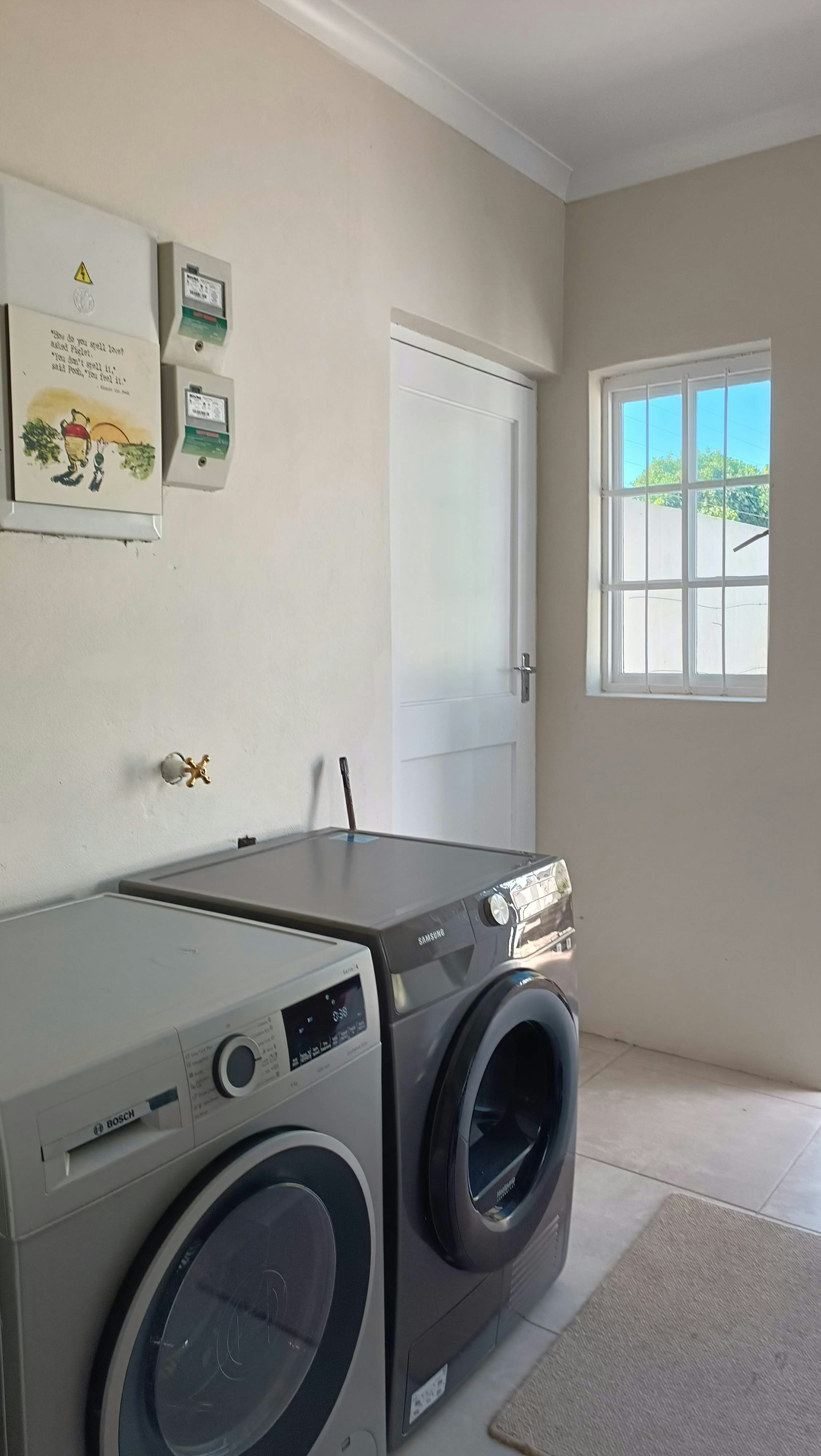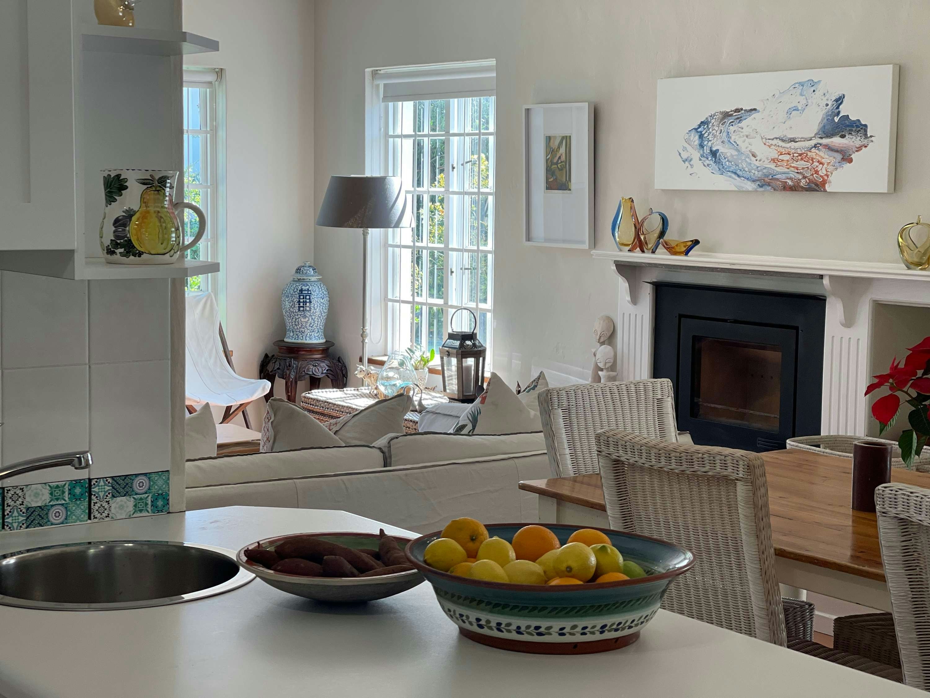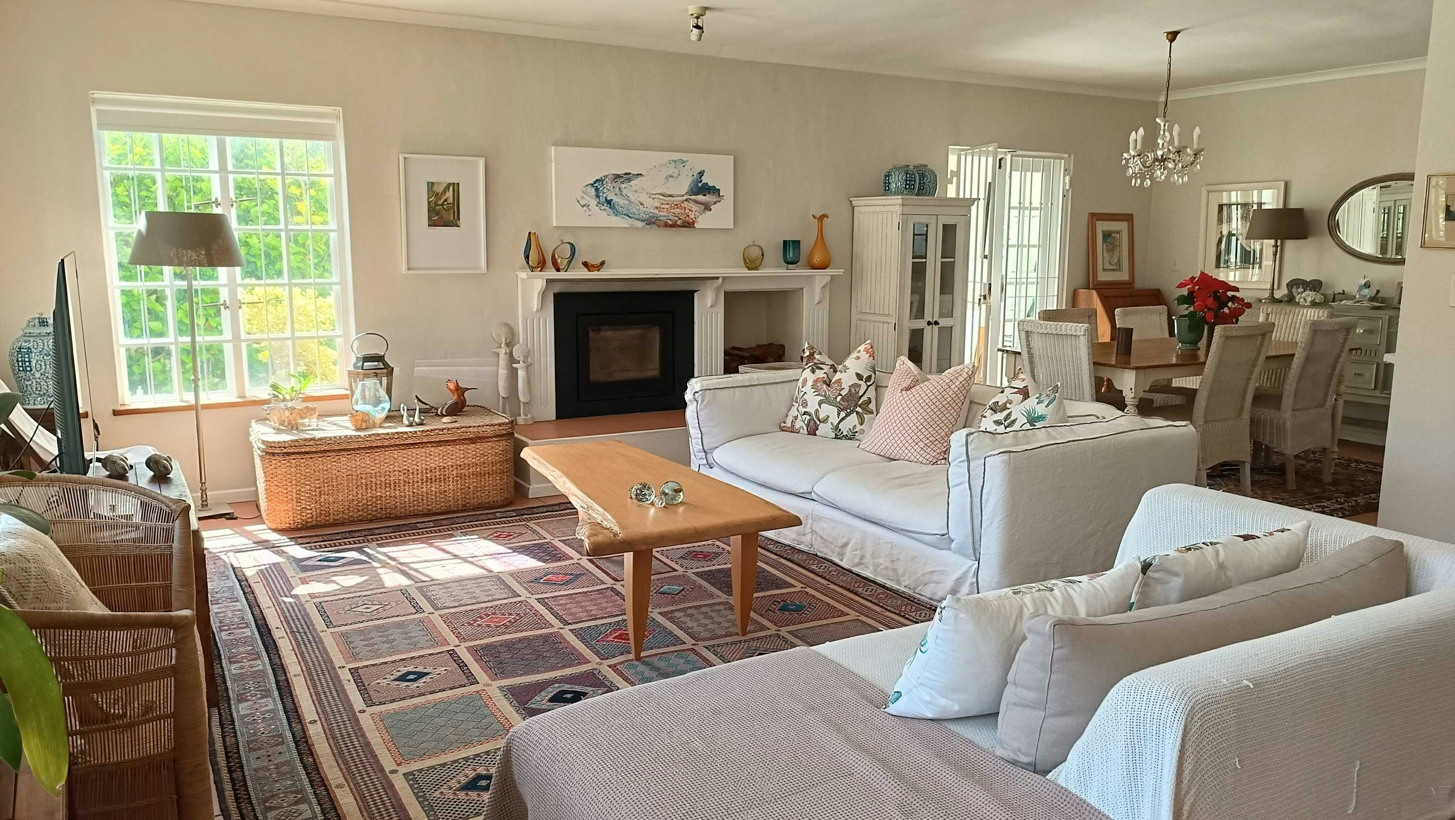 The kitchen is equipped with a fridge-freezer, gas stove, oven, microwave, dishwasher, cutlery and crockery and tea- and coffee-making facilities. A washing machine and tumble dryer is available for the guests’ convenience. The living area is furnished with comfortable couches, a TV with DStv and Netflix, a fireplace and a dining table.