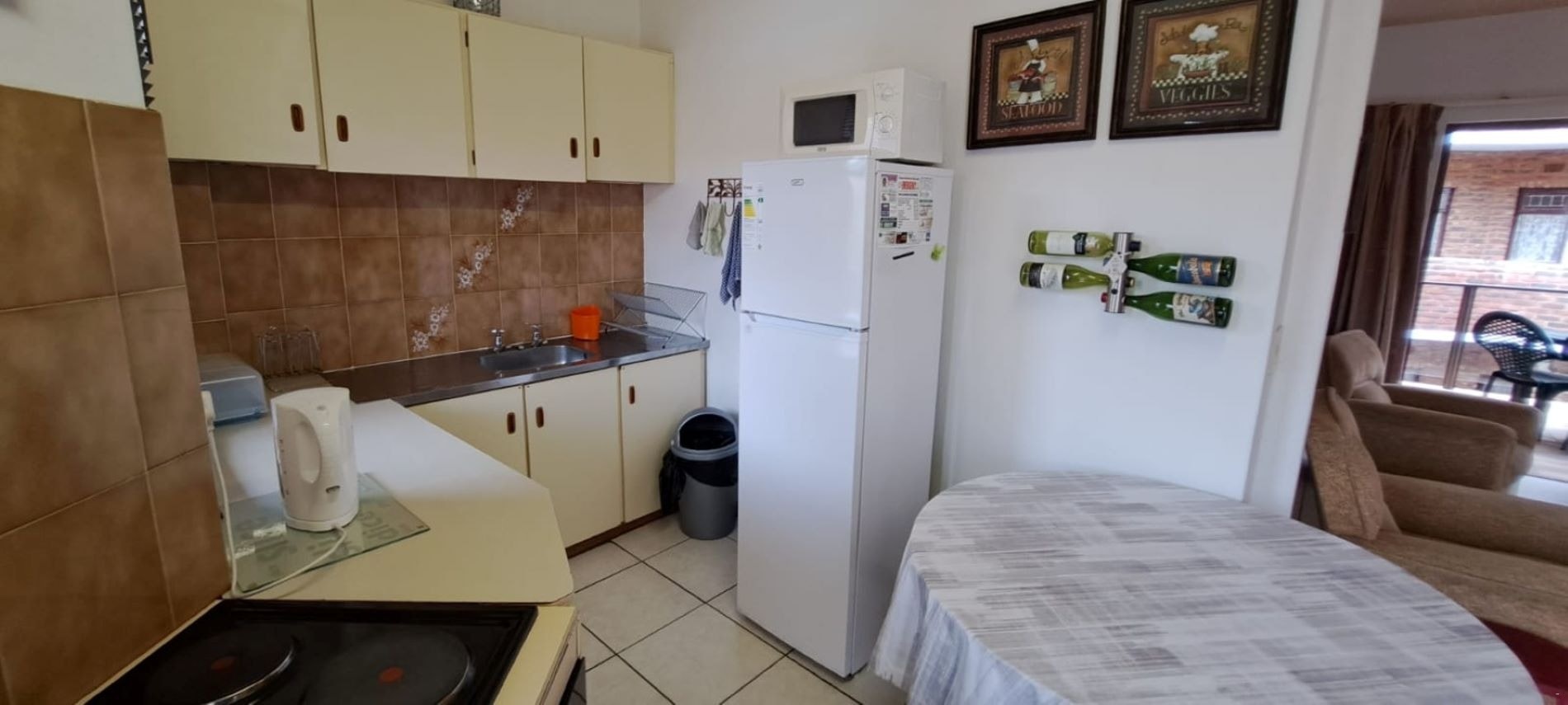 Die leefarea het 'n sitarea en 'n kombuis. Die kombuis is met 'n stoof, oond, mikrogolfoond, yskas-vrieskas, tee- en koffiemaakgeriewe, eetgerei en breekware toegerus. Daar is 'n gemaklike sitkamerstel en 'n TV in die sitarea.