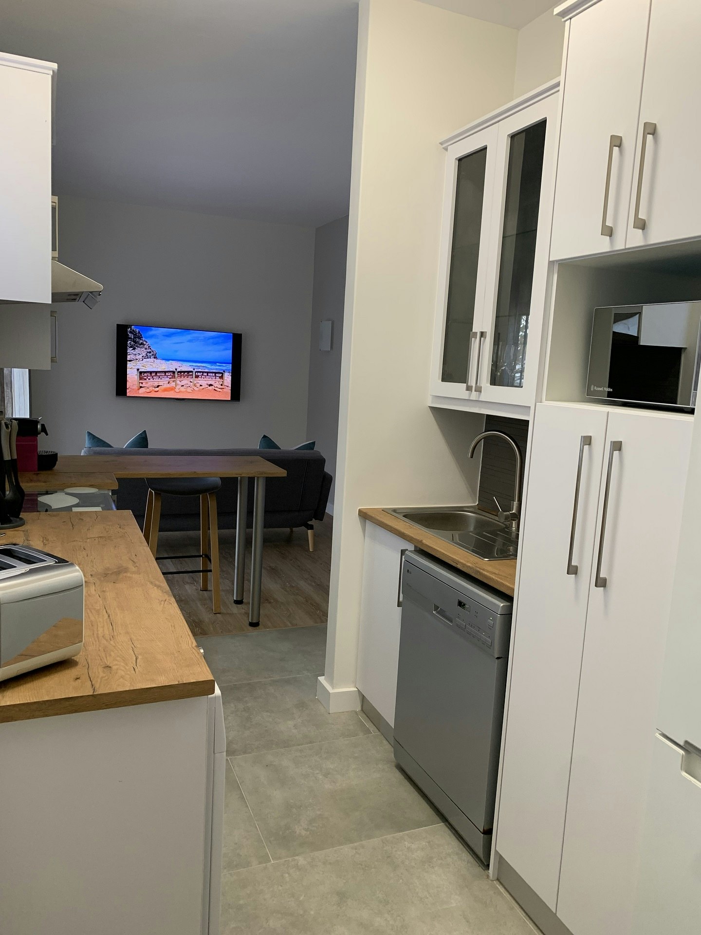 The main living area features an open-plan design with a kitchen and a lounge. The kitchen is fully equipped with a gas stove, electric oven, microwave, fridge-freezer, Nespresso machine, cutlery and crockery as well as a 3-seater breakfast bar. A dishwasher and a washing machine are available.