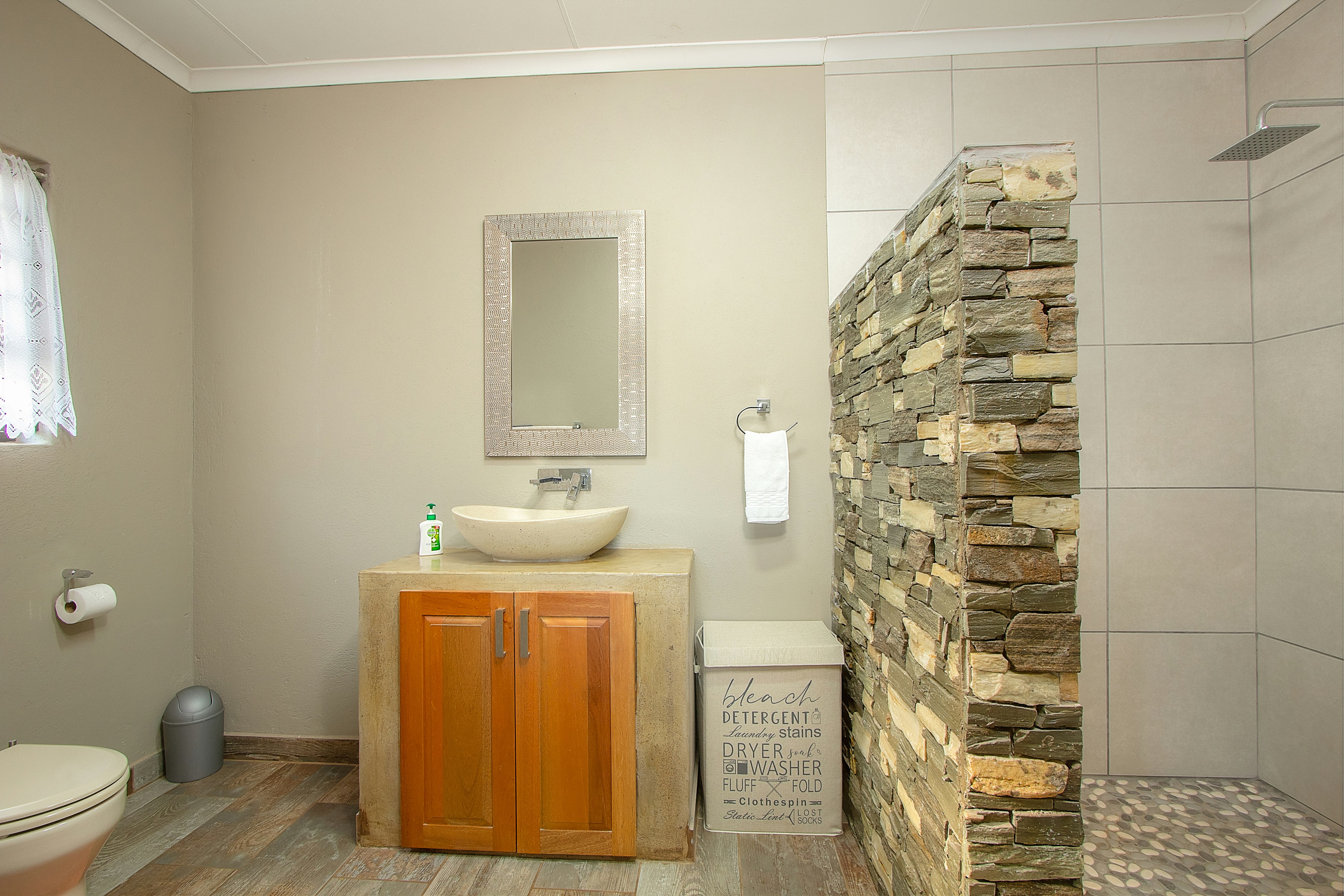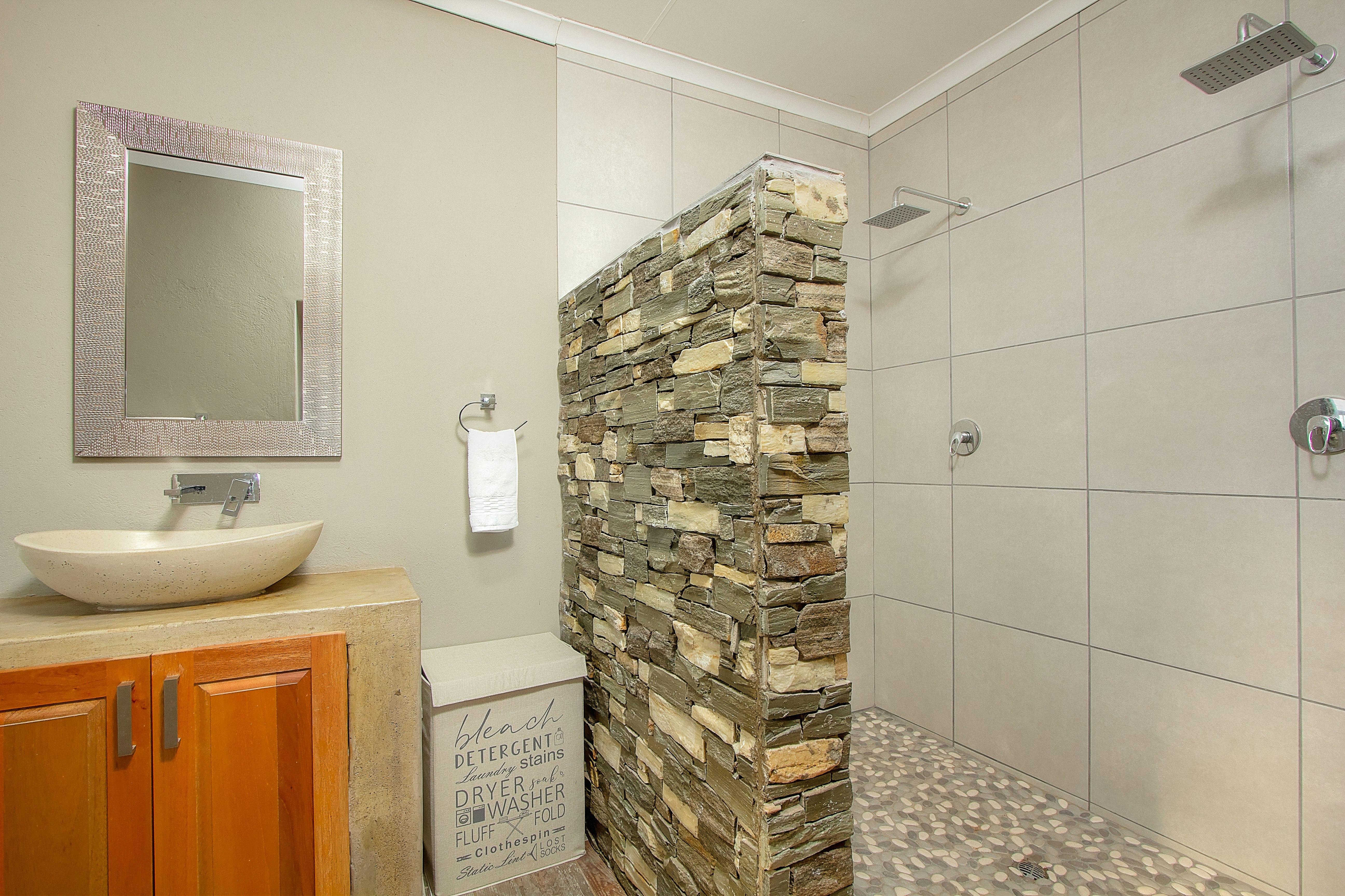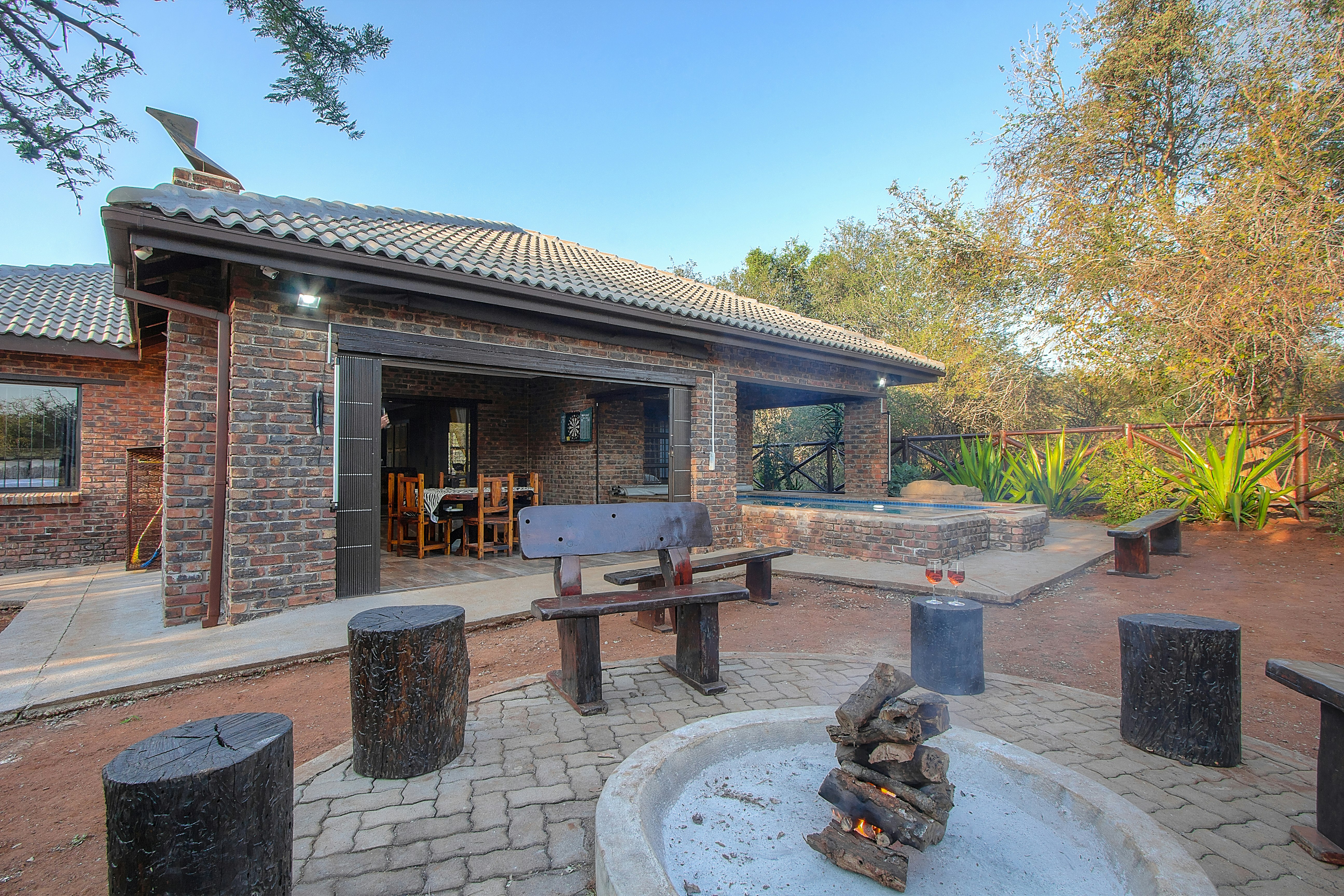 Skuifdeure lei na 'n toegeboude stoep met 'n etenstafel met 6 stoele en ingeboude braaigeriewe. Hierdie stoep lei direk na 'n sprankelende swembad. Daar is ook 'n vuurput waar gaste lekker saam kan kuier.