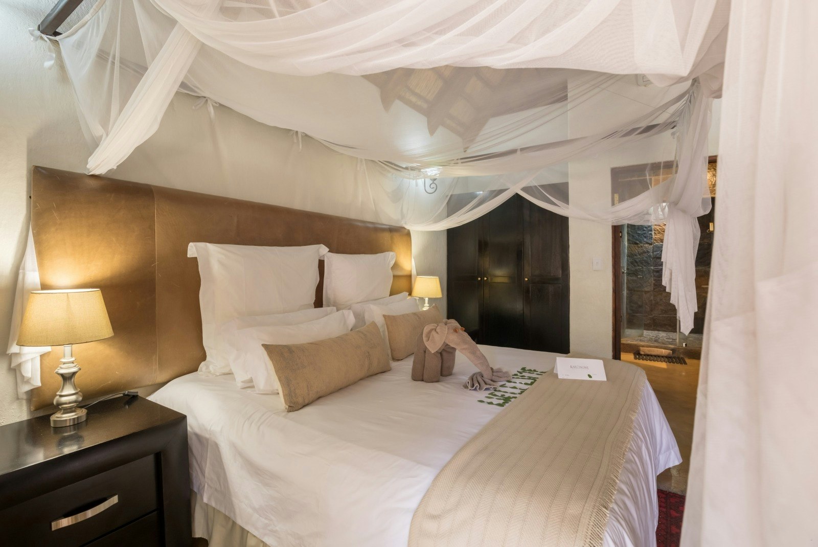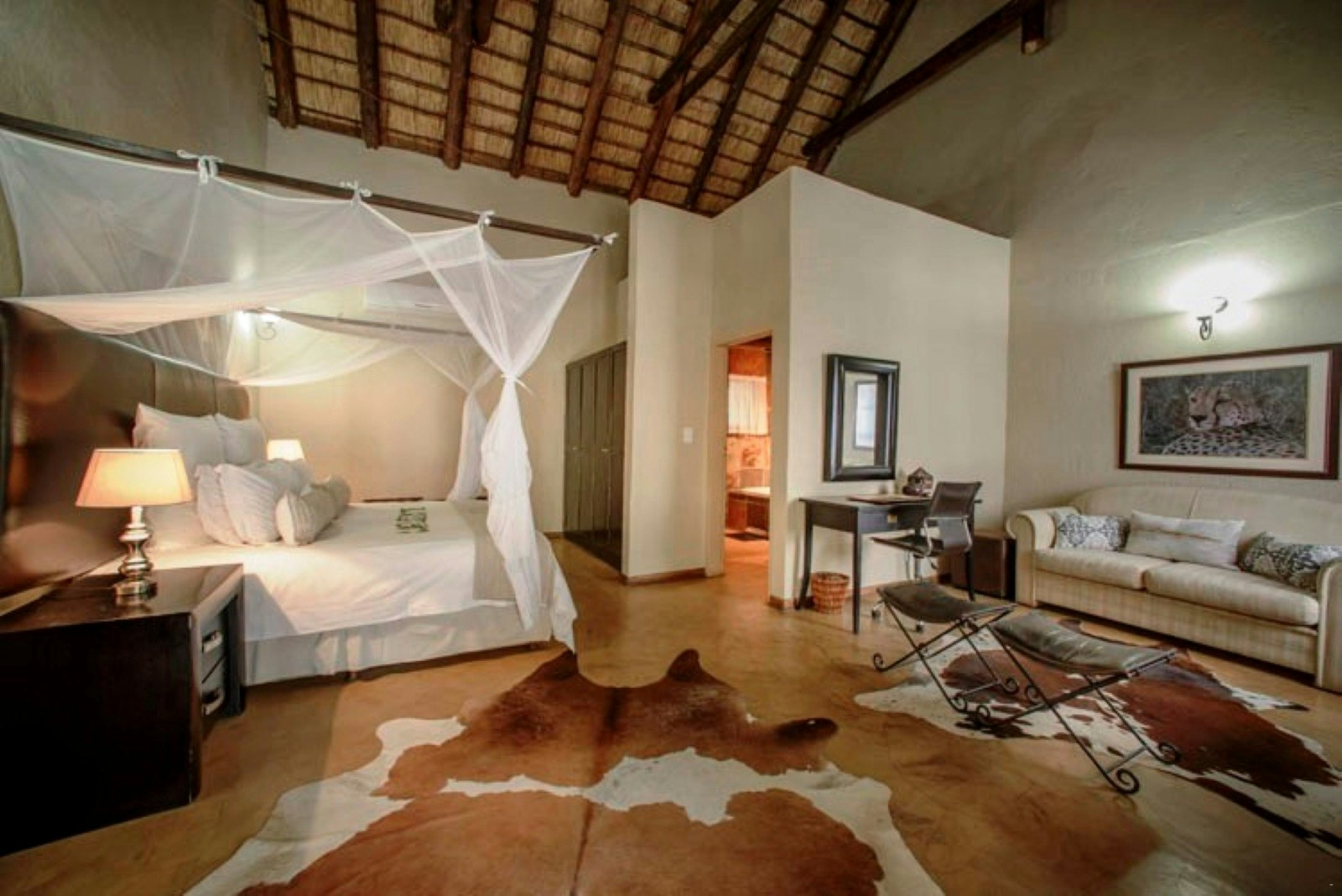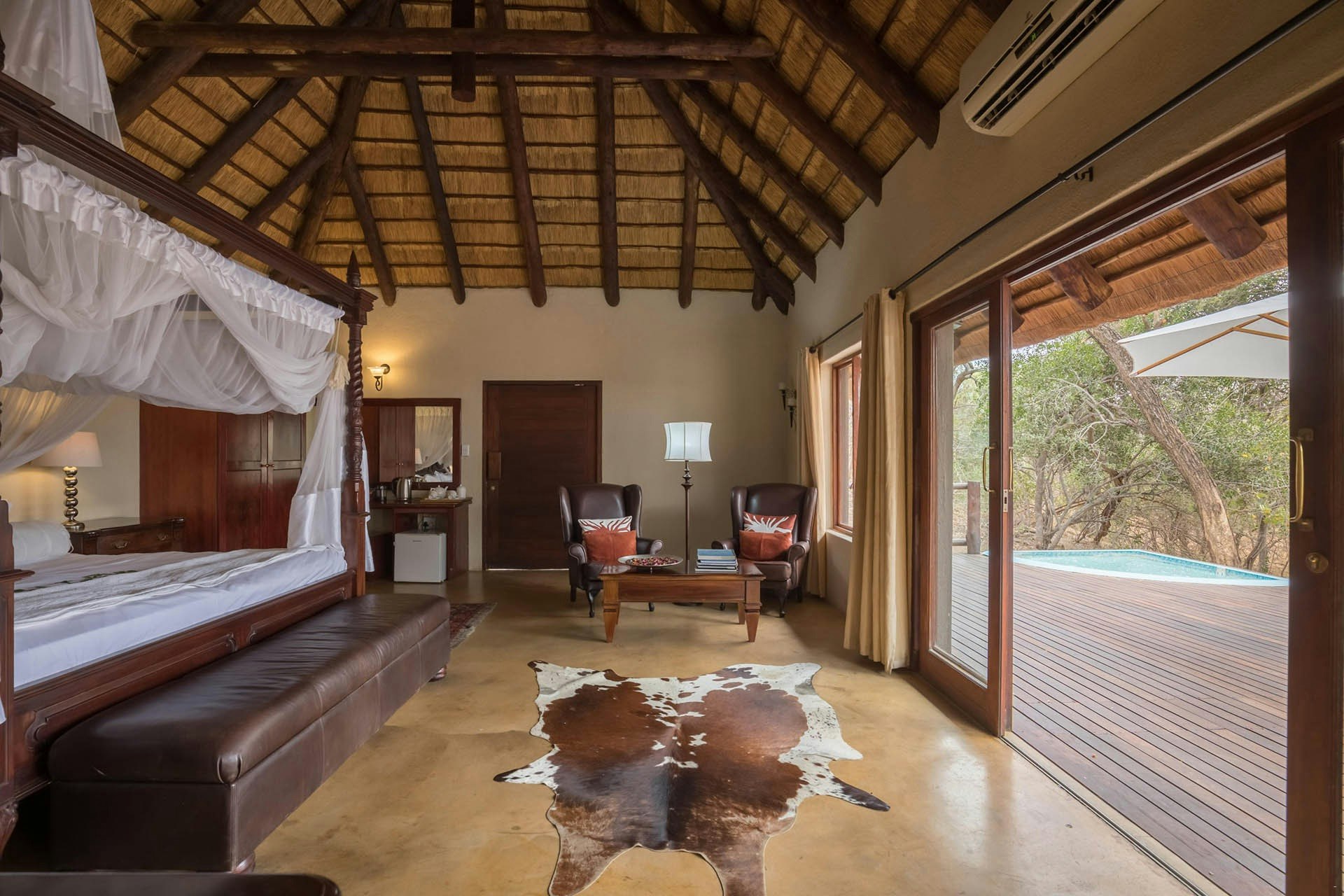The lodge’s thatched suites are spacious, with a variety of room options to choose from. Each unit is furnished with comfortable beds and en-suite bathrooms fitted with either a shower, bath, or shower only, along with a toilet.