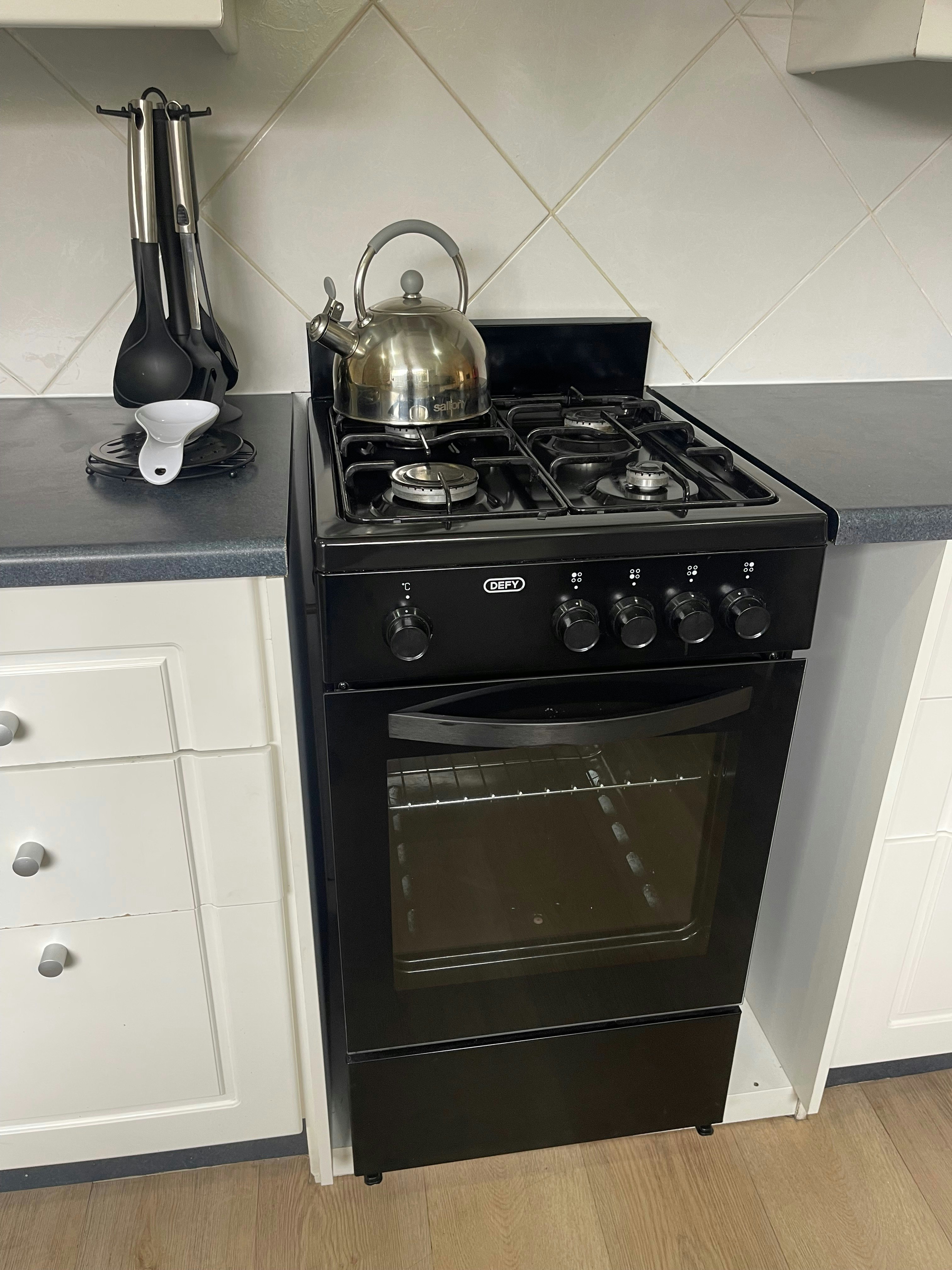 Die kombuis is toegerus met 'n yskas-vrieskas, gasstoof en oond, mikrogolfoond, broodrooster, basiese eetgerei en breekware, plus tee- en koffiemaakgeriewe. Die oopplan-leefarea beskik oor 'n eetkamertafel, slaapbank, ekstra sitplek en 'n platskerm-TV.