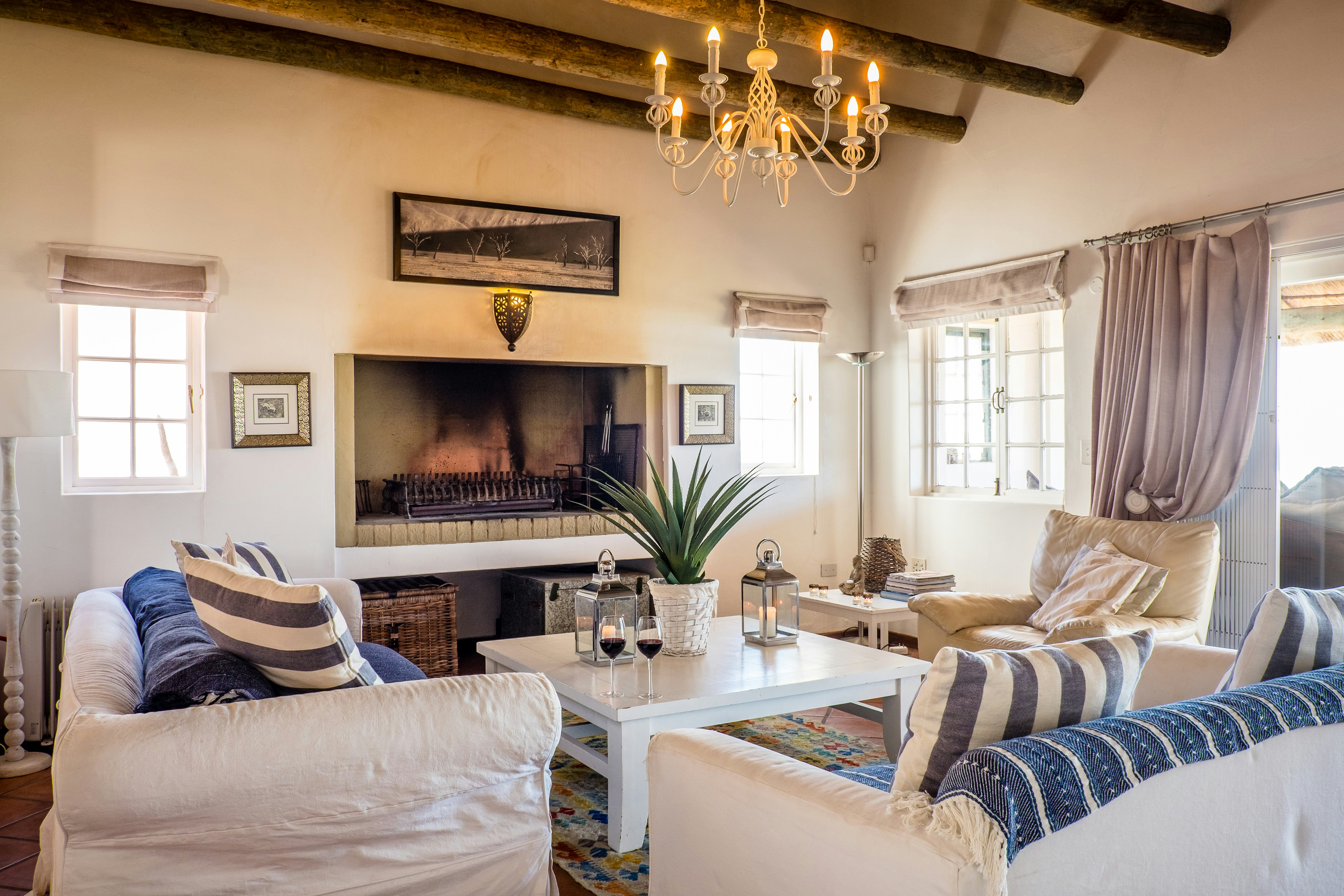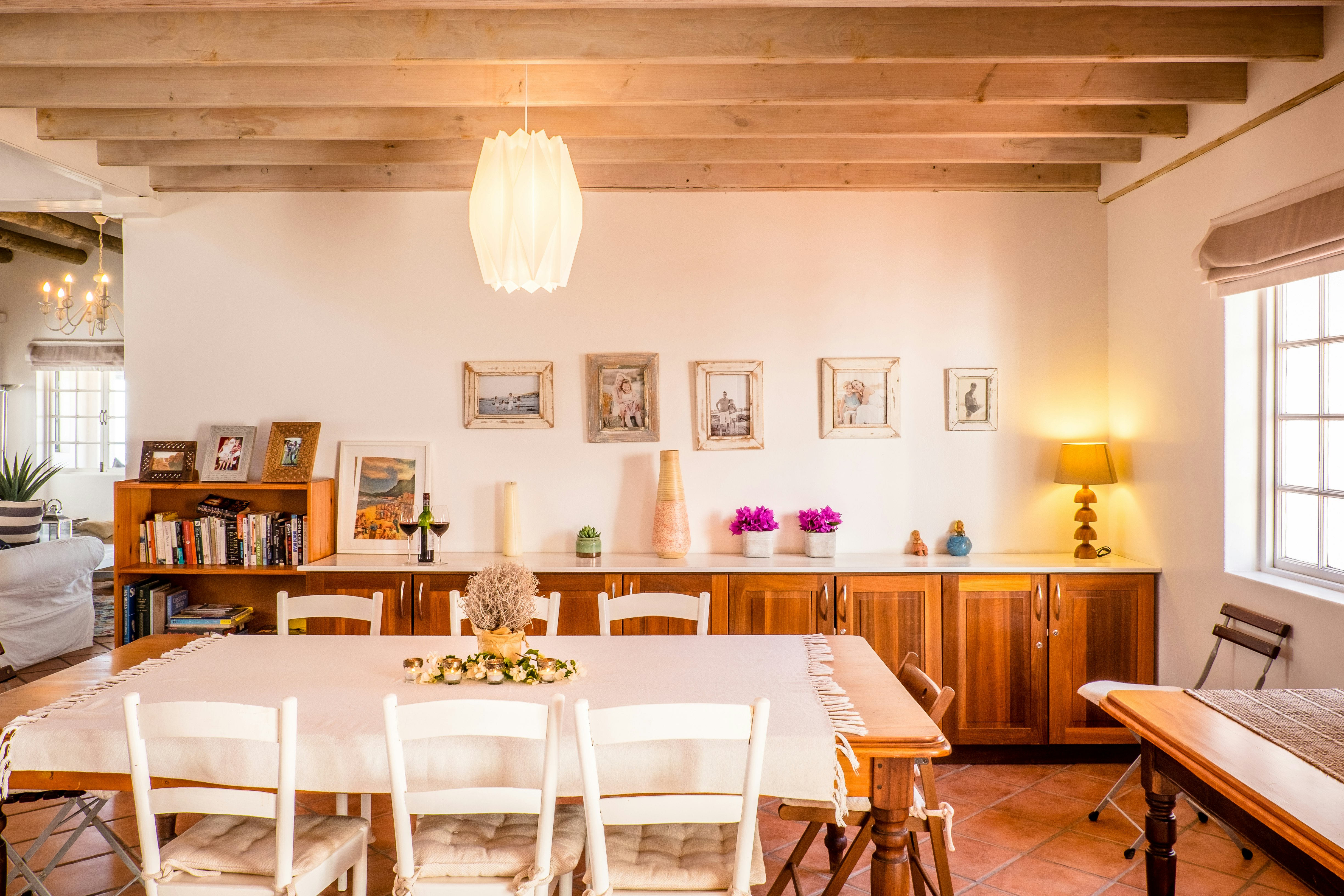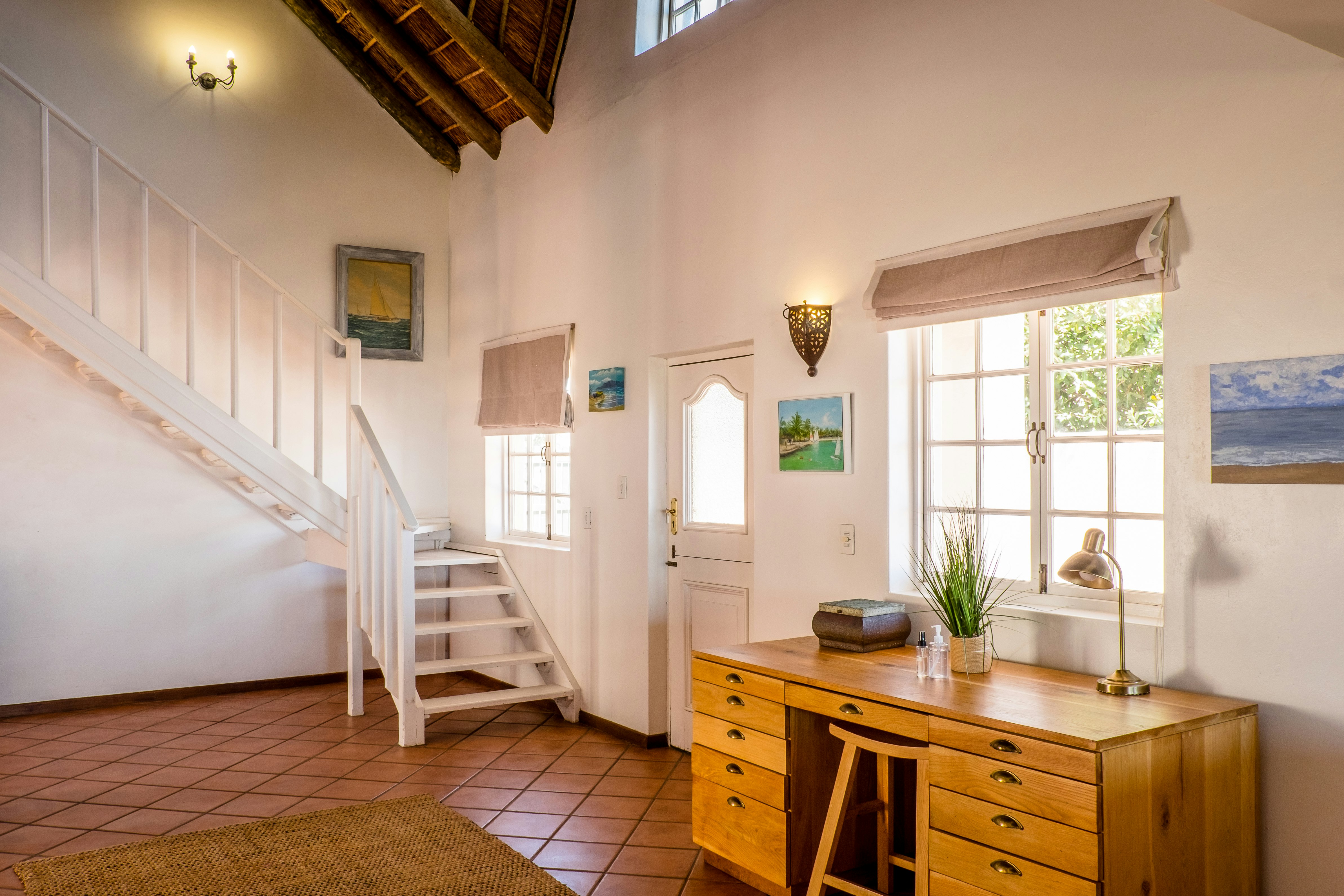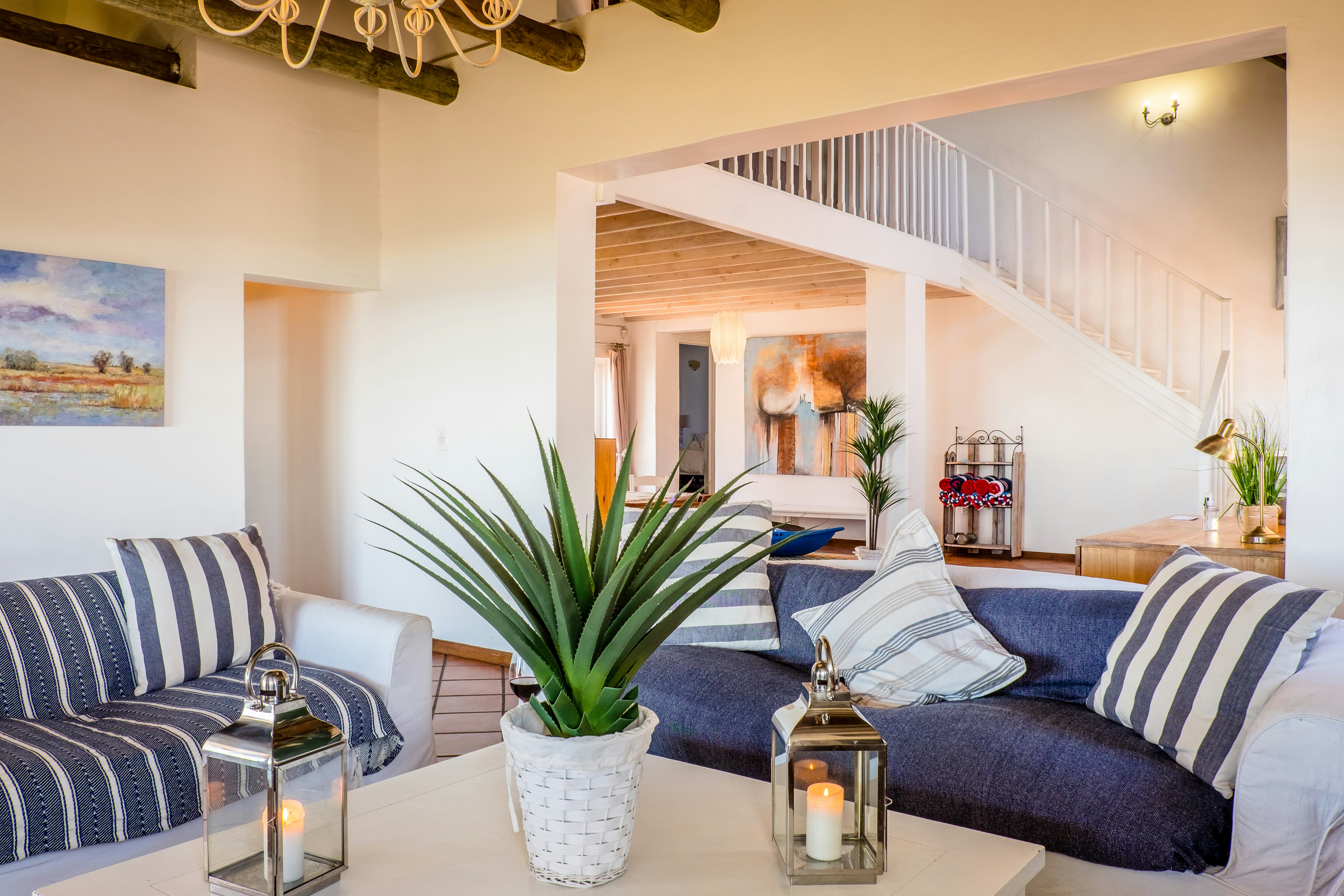 This tastefully designed house can accommodate 10 guests and comprises 4 bedrooms and 2 bathrooms. The main bedroom is furnished with a queen-size bed and features an en-suite bathroom fitted with a bath, shower, toilet, and washbasin. The second and fourth bedrooms are each furnished with a double bed, whereas the third bedroom is furnished with a double bed and 2 single beds. These bedrooms make use of a shared bathroom fitted with a shower, toilet, and washbasin. Quality linen and bath towels are provided; however, guests are required to bring their own beach towels.