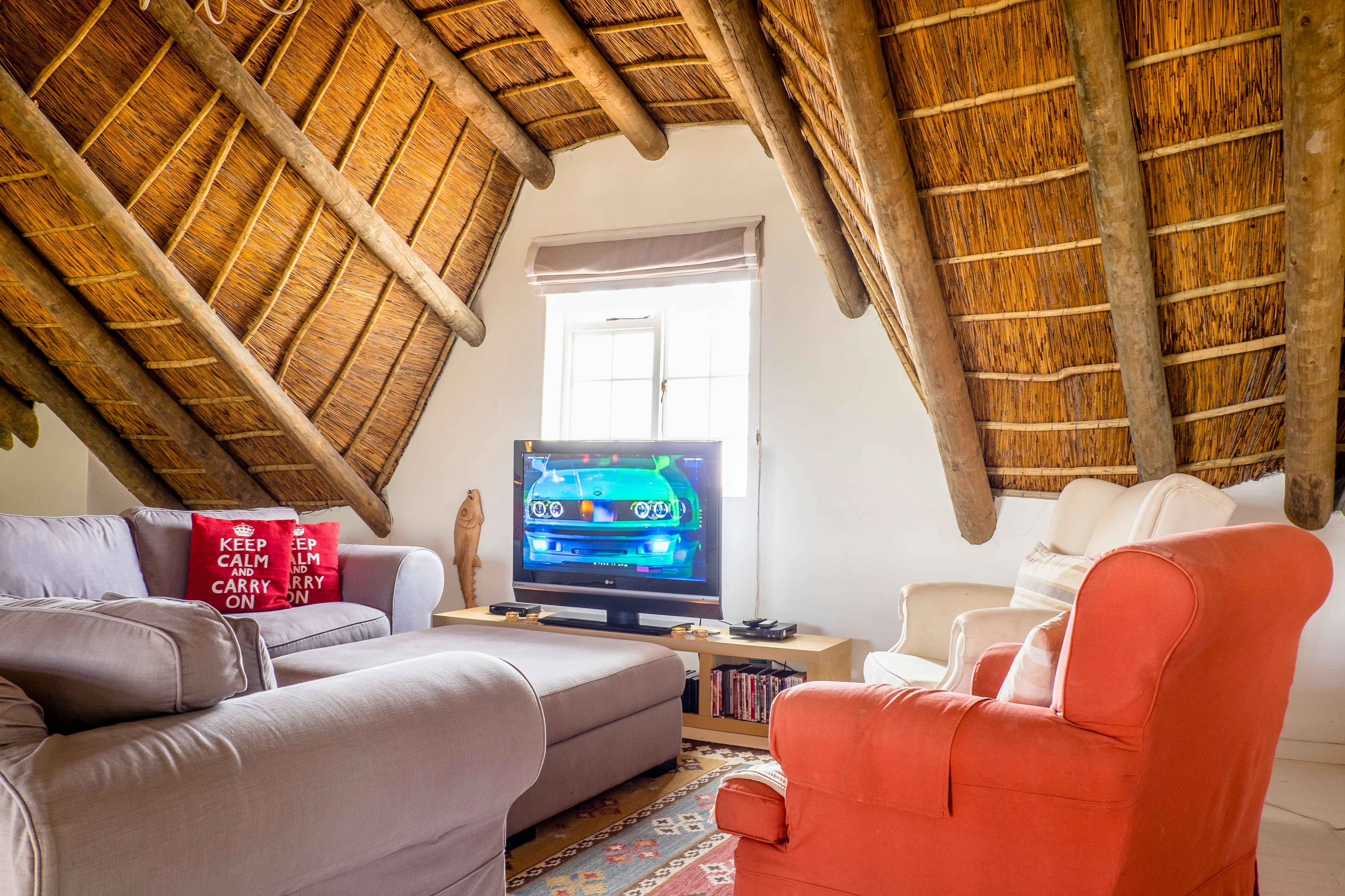 The open-plan living area features a lounge, a dining area, and a kitchen. The kitchen is equipped with a stove, oven, microwave, fridge-freezer, tea- and coffee-making facilities, and cutlery and crockery. The kitchen also has a breakfast bar with 3 stools. The lounge is furnished with comfortable seating, a coffee table, and a TV with DStv. The dining area is furnished with a dining table suitable for 8 guests. The property has solar power in case of power outages.