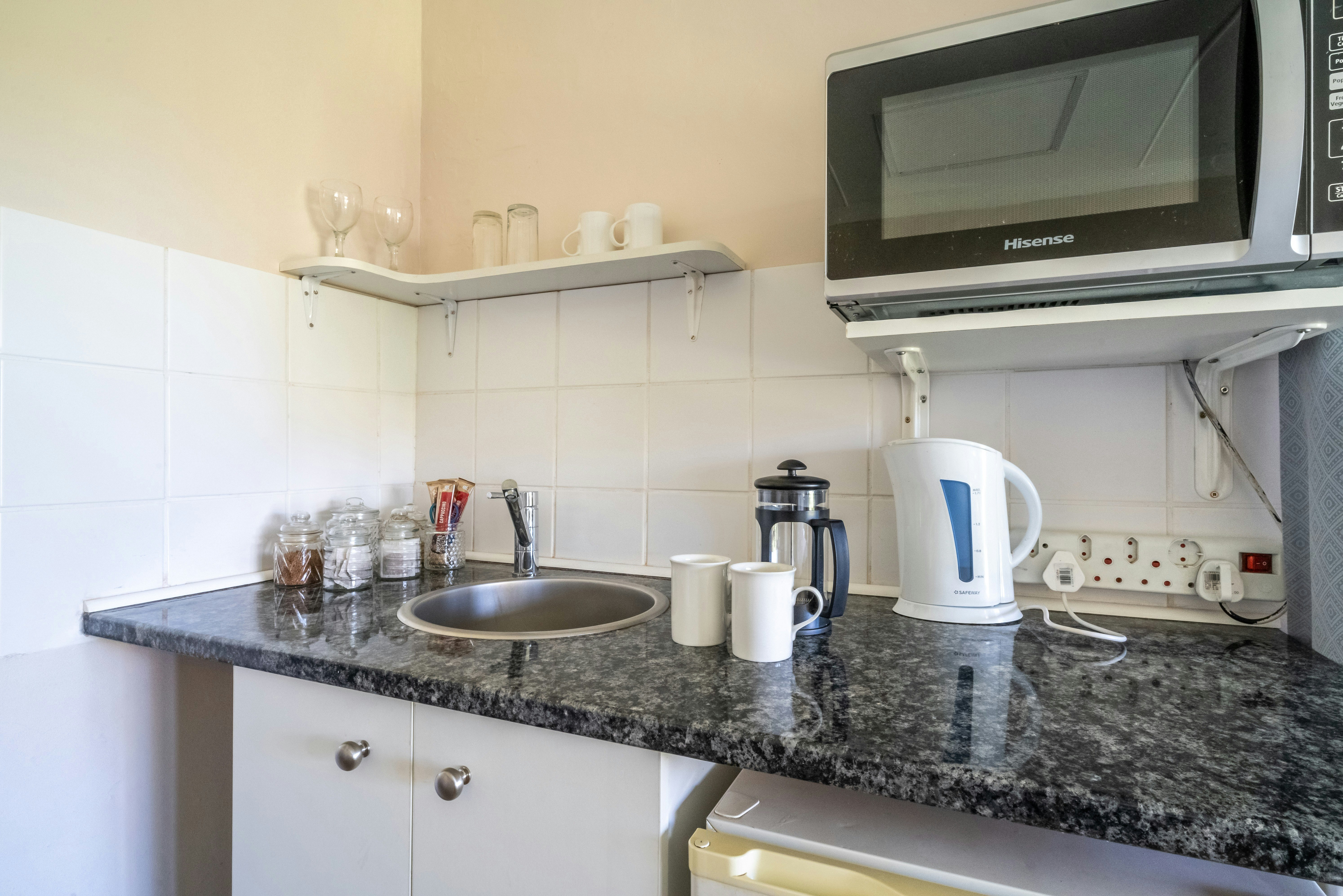 The living area features a kitchenette equipped with a microwave, bar fridge, kettle, cutlery, and crockery.