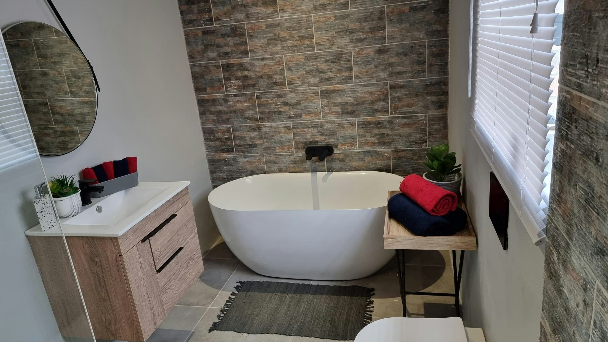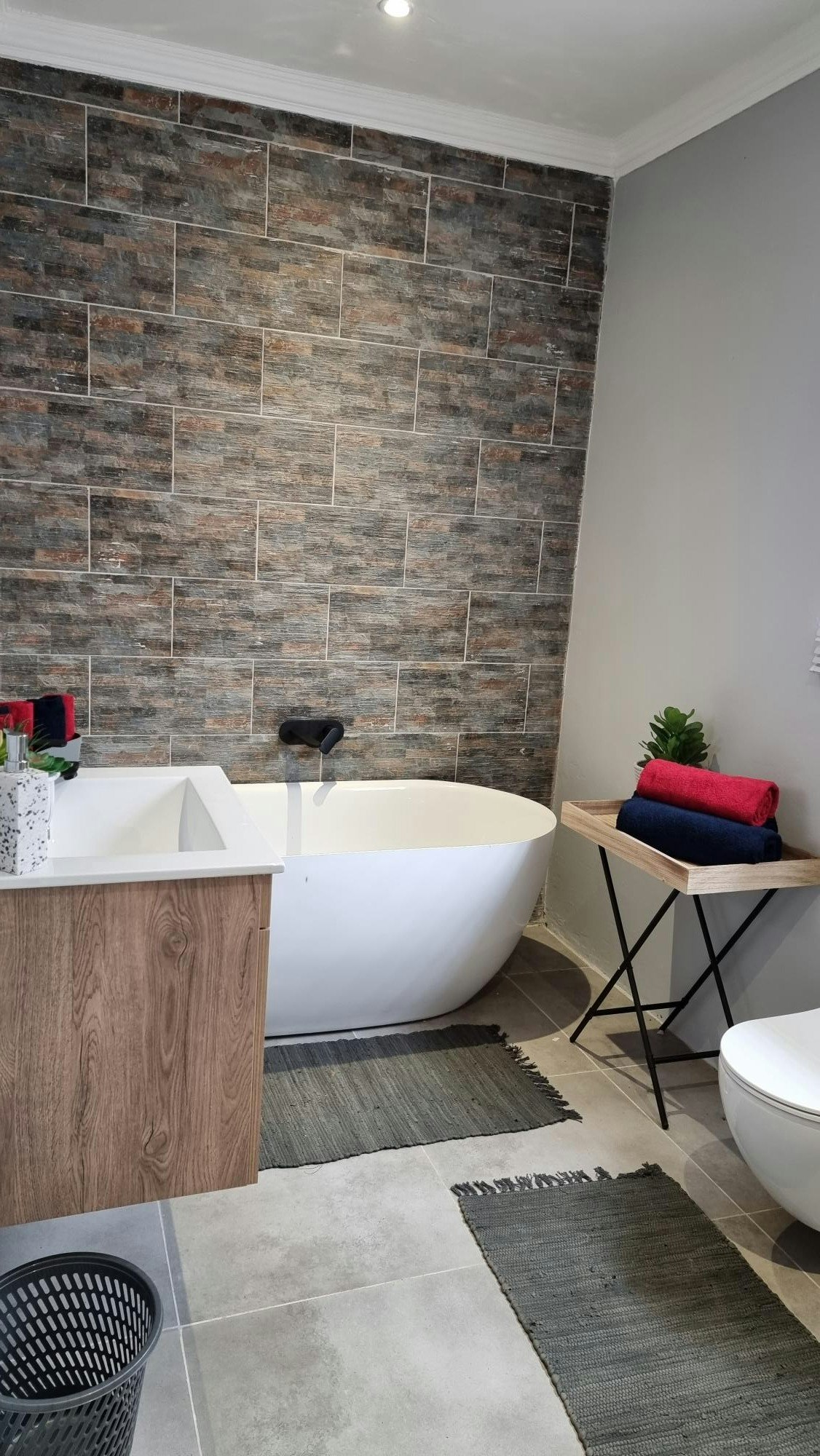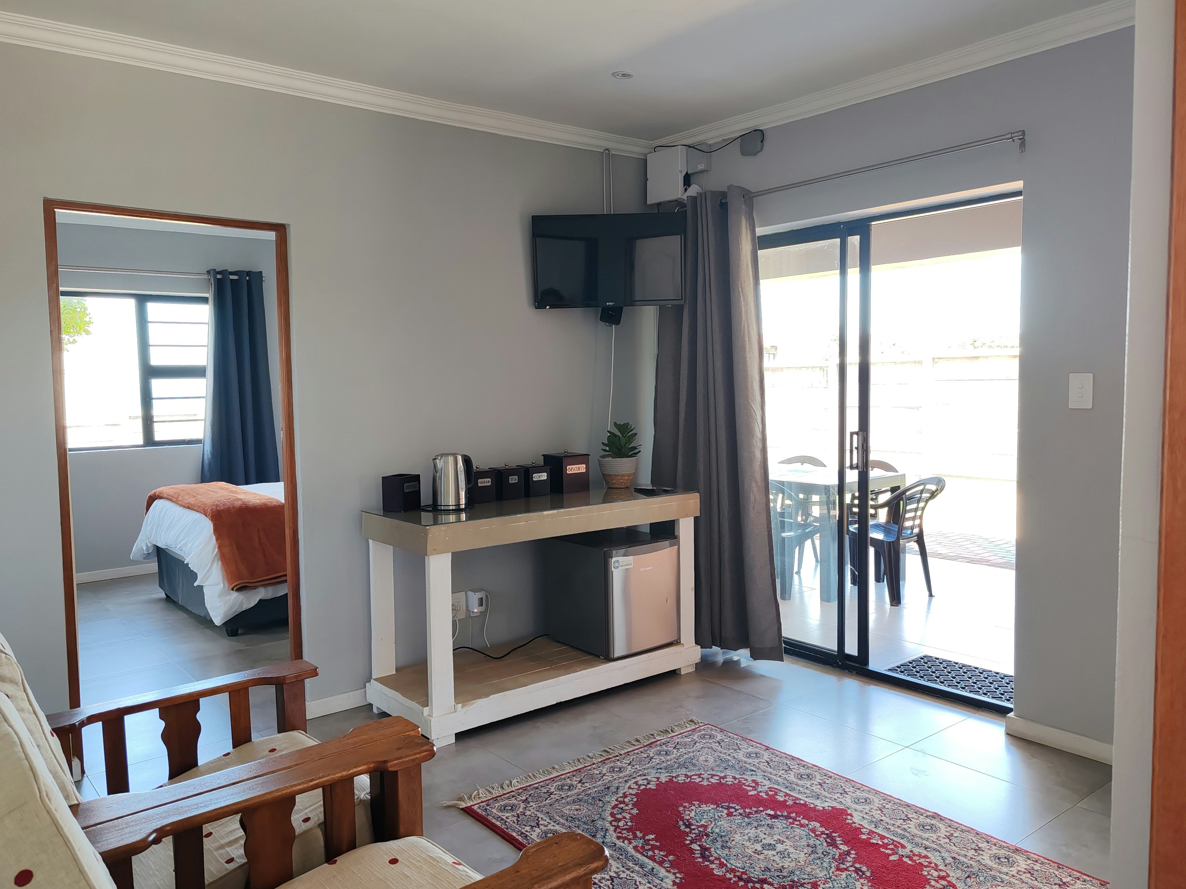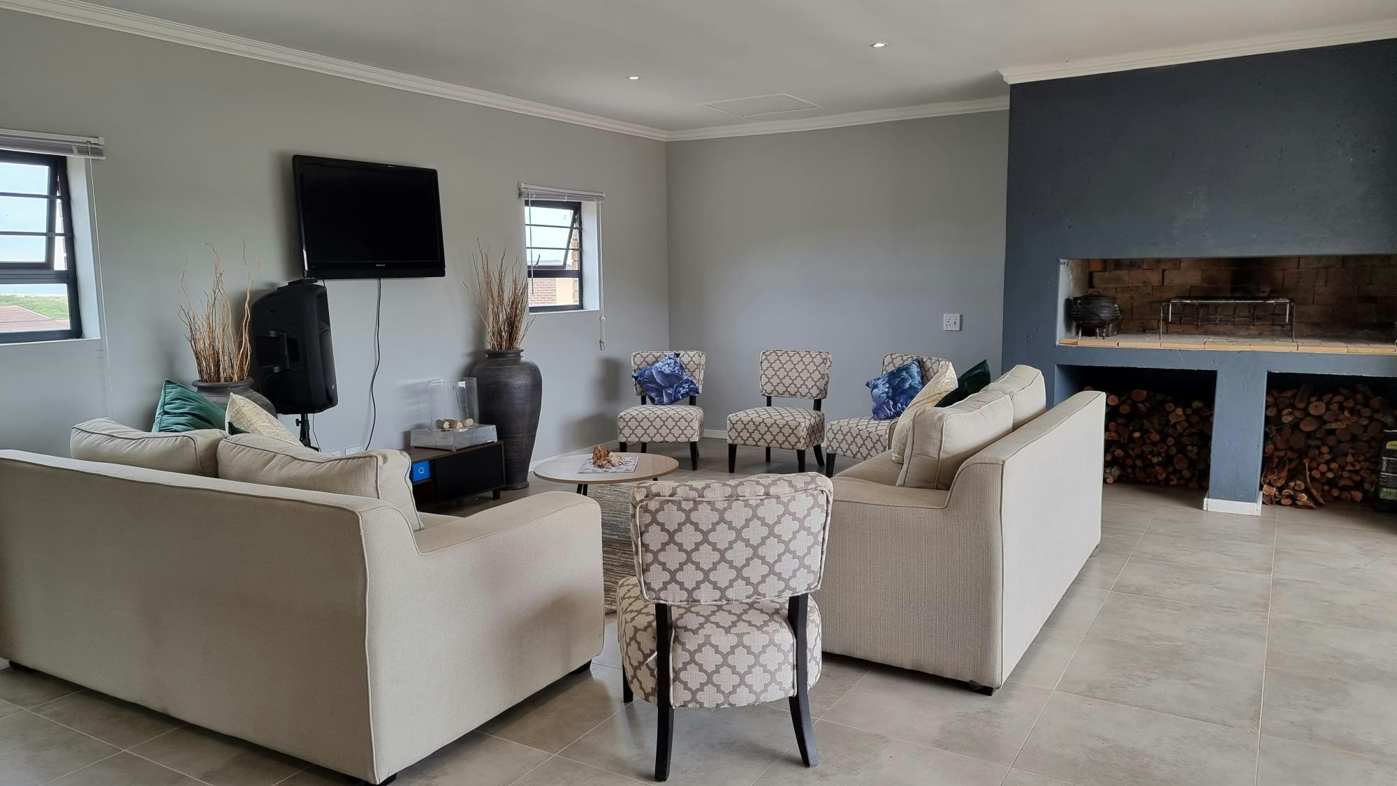The kitchen is fully equipped for self-catering and contains a stove, oven, fridge-freezer, microwave, cutlery, and crockery. The living area features a dining table, comfortable seating, a braai area, and a smart TV. Wi-Fi access is provided.