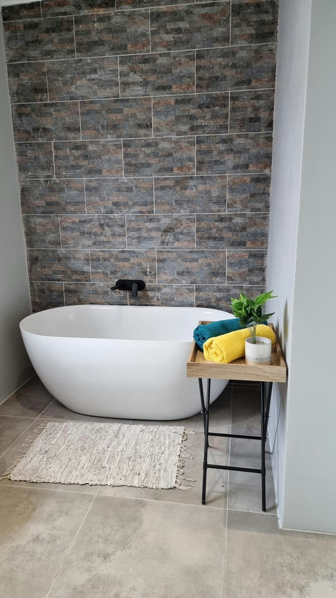 The house features 3 bedrooms and 2 bathrooms. The main bedroom is furnished with a double bed and offers an en-suite bathroom fitted with a shower, a bath, a toilet, and a basin. The second bedroom also has a double bed, while the remaining bedroom has a double bed and a bunk bed for children. The second bathroom is also fitted with a shower, a bath, a toilet, and a basin.