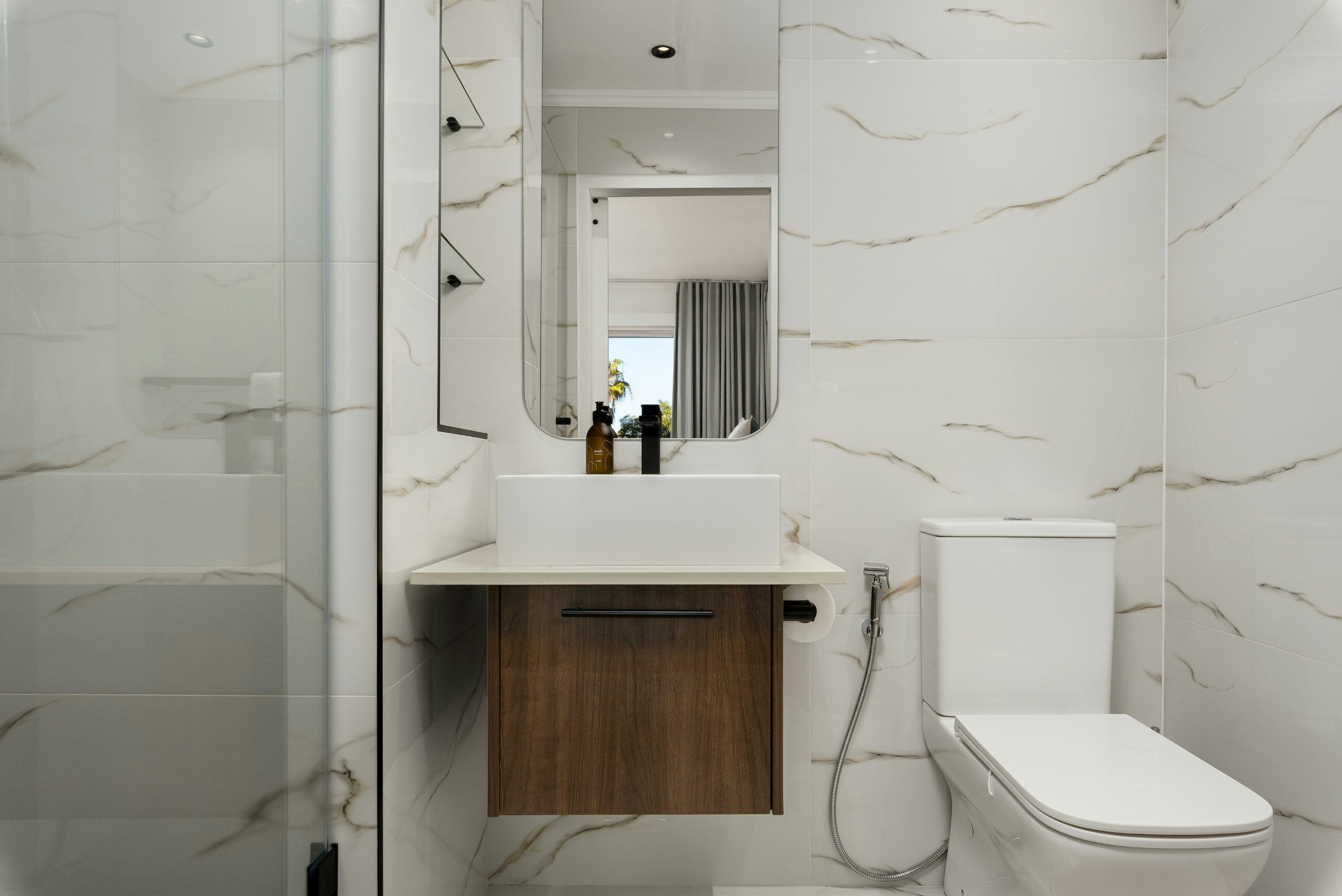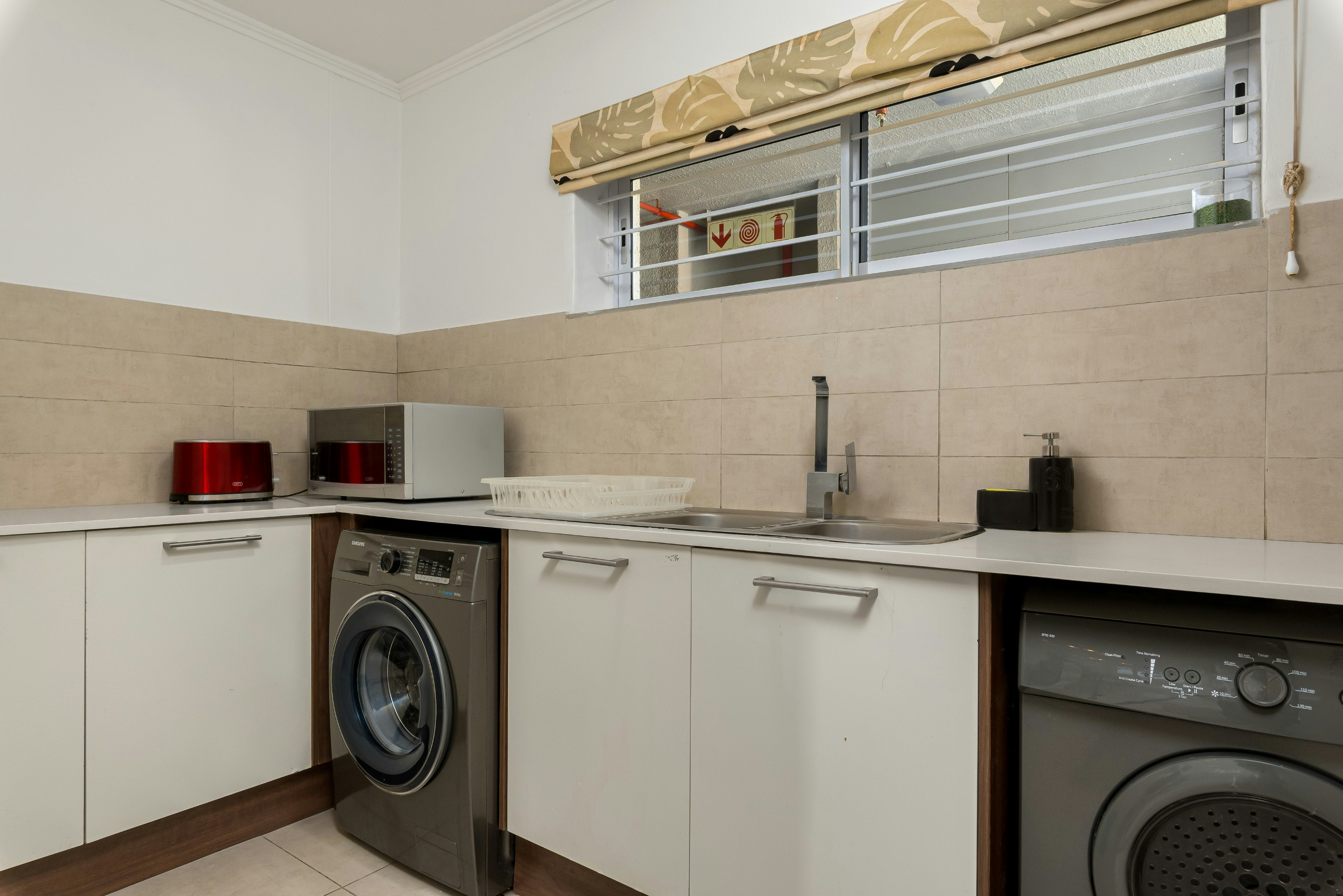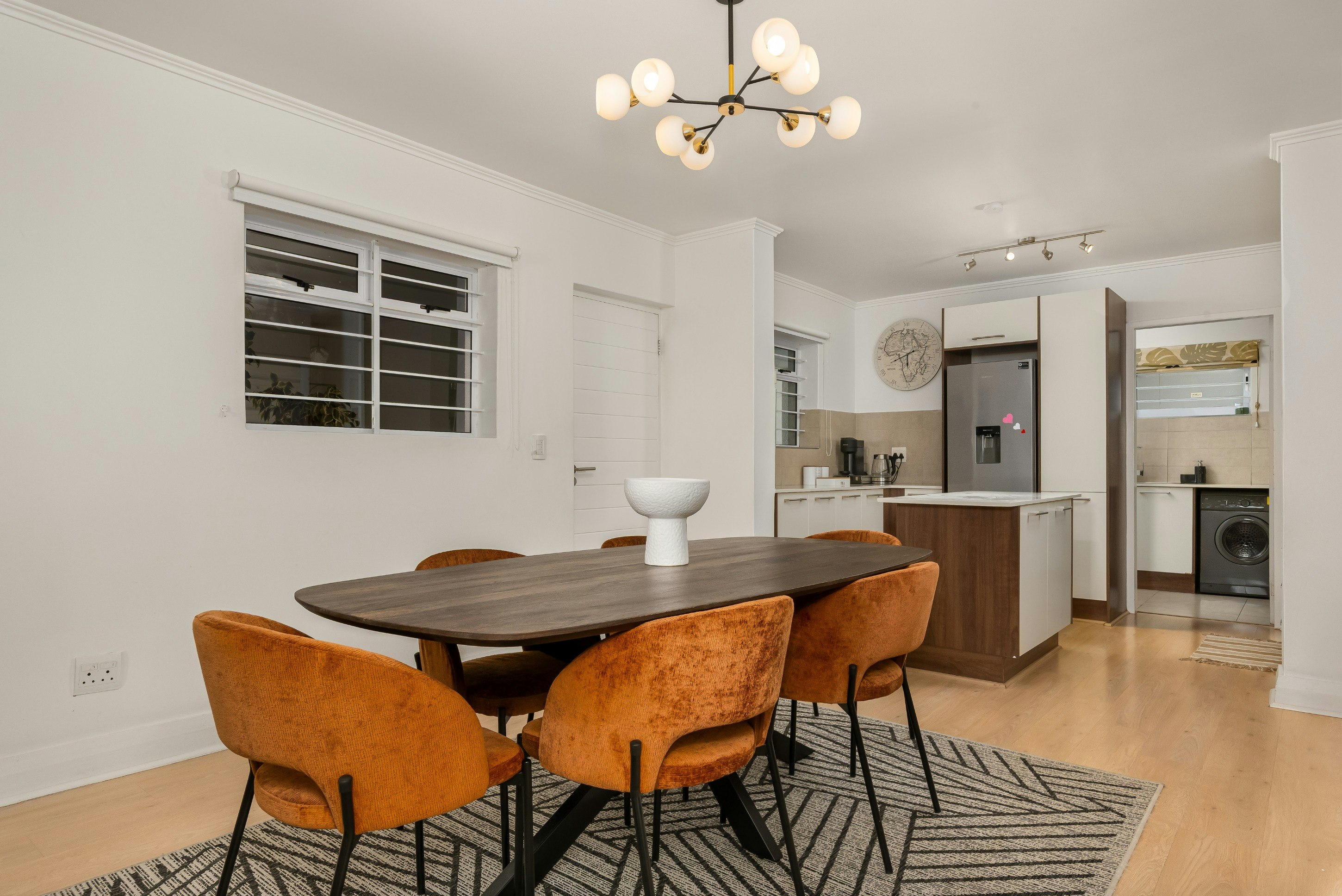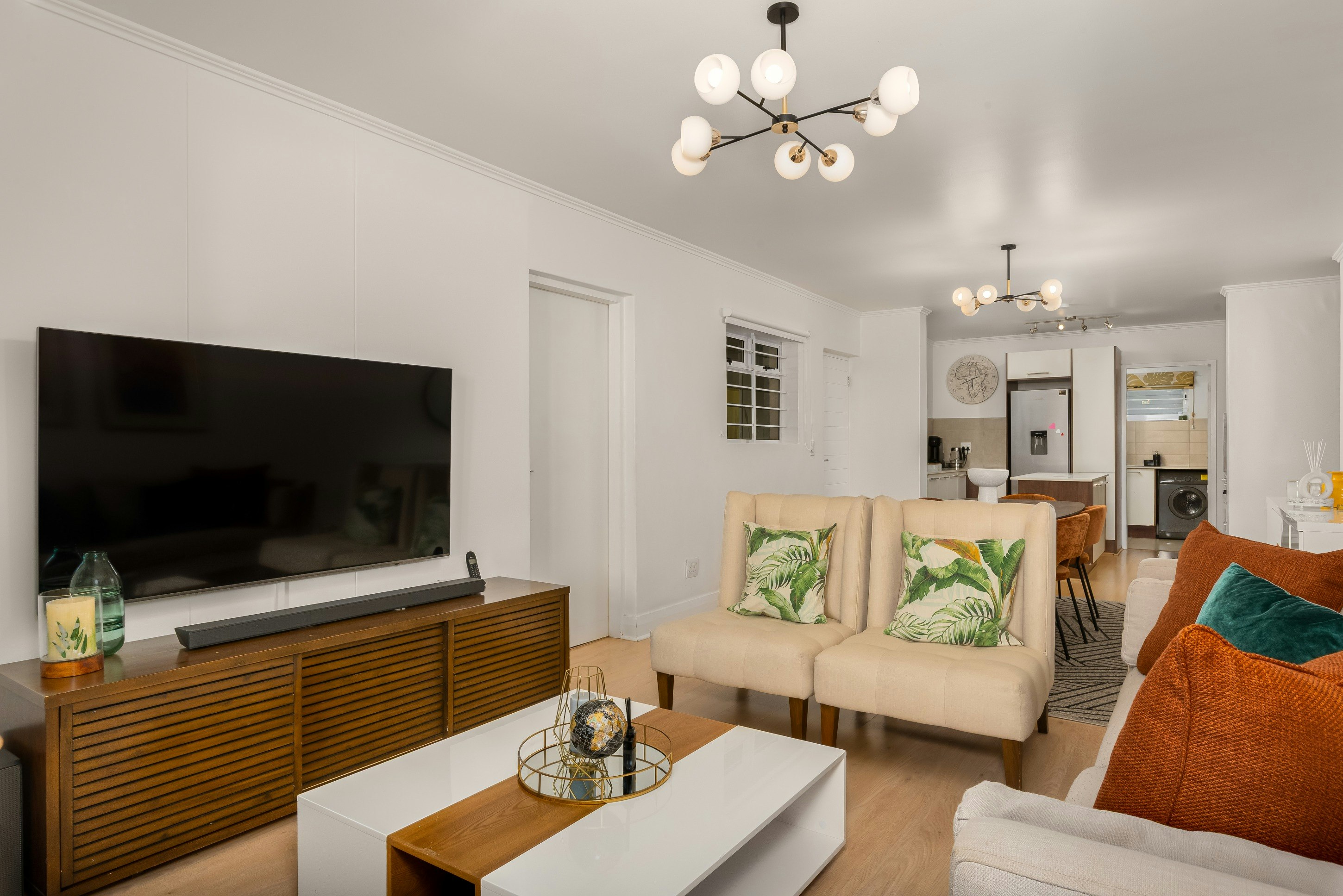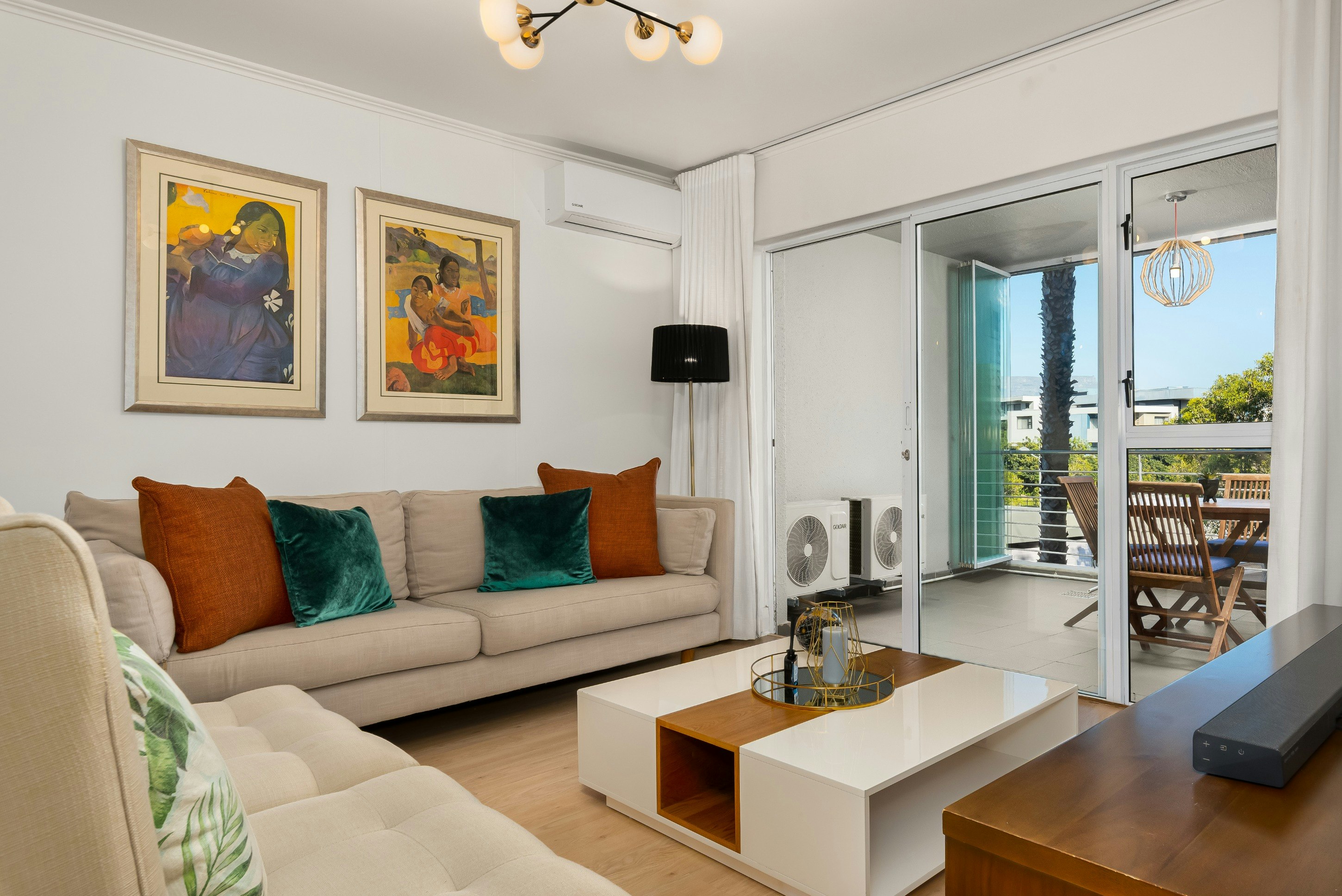 Die oopplan-leefarea sluit 'n gemaklike sitkamer met 'n slim-TV, 'n eetarea en 'n volledig toegeruste kombuis met 'n yskas-vrieskas, stoof, oond, mikrogolfoond, wasmasjien, tuimeldroër, en koffie- en teemaakgeriewe in. Die leefarea lei na 'n privaat balkon met 'n buite-eettafel, perfek vir oggendkoffie of ontspanne aandetes. Gaste kan toegang tot die gemeenskaplike swembad geniet, terwyl die landgoed 24-uur bemande sekuriteit en beheerde toegang bied vir gemoedsrus.