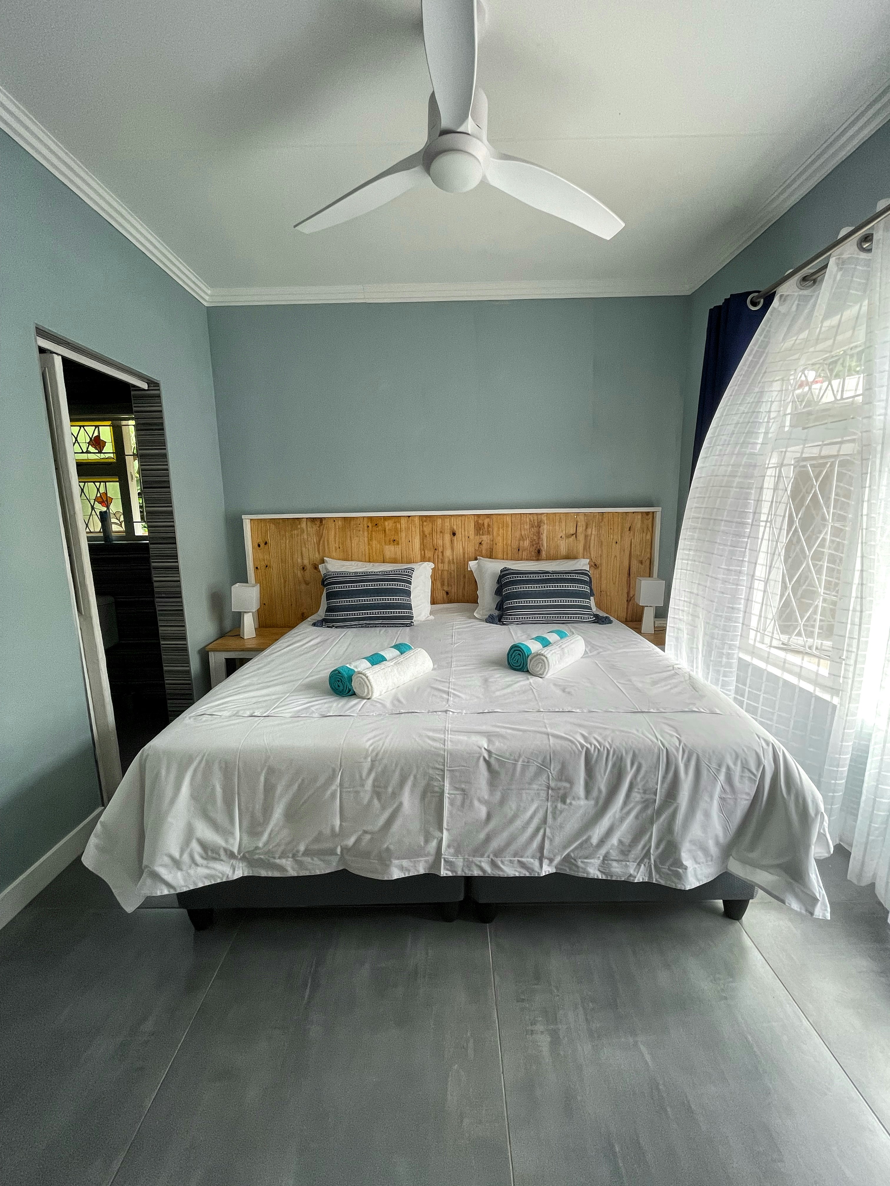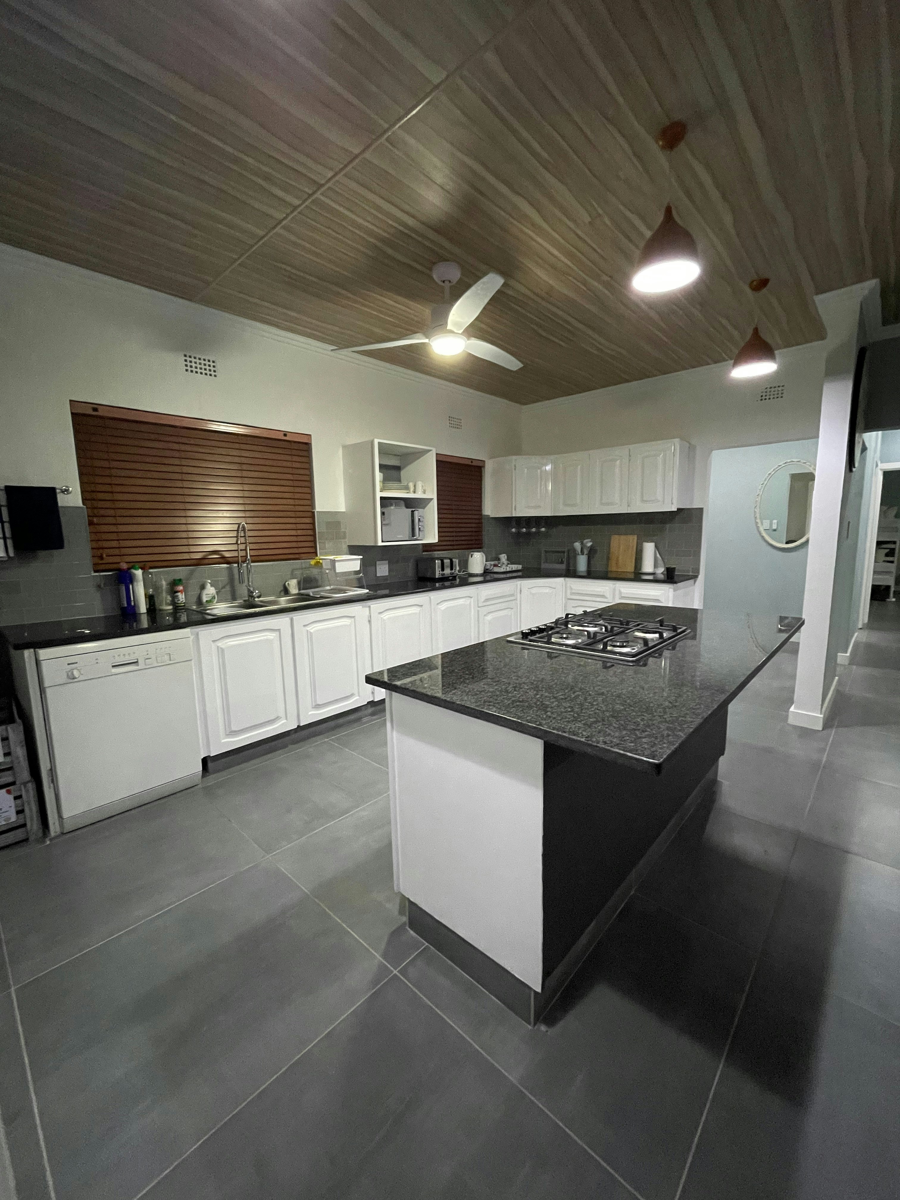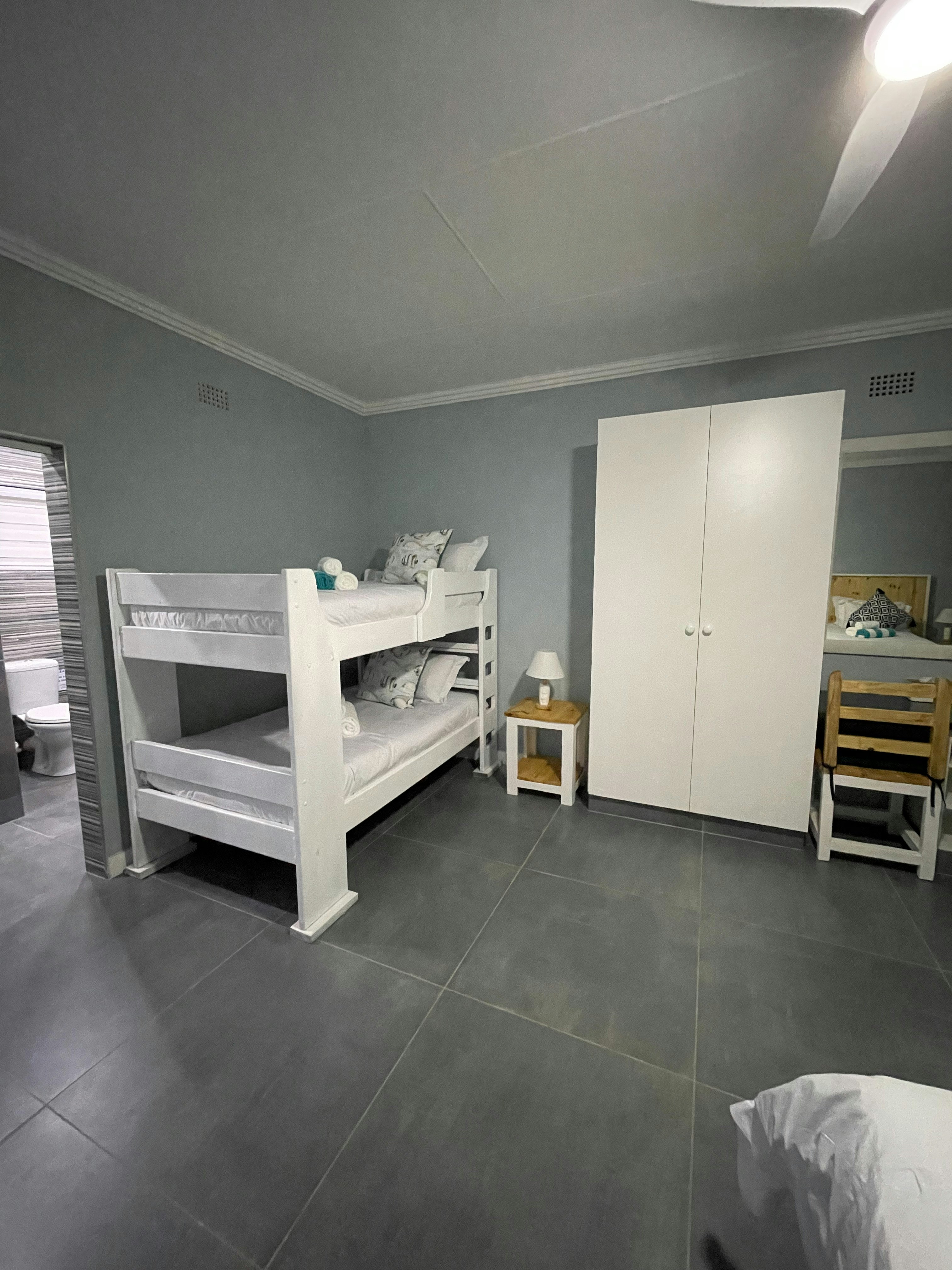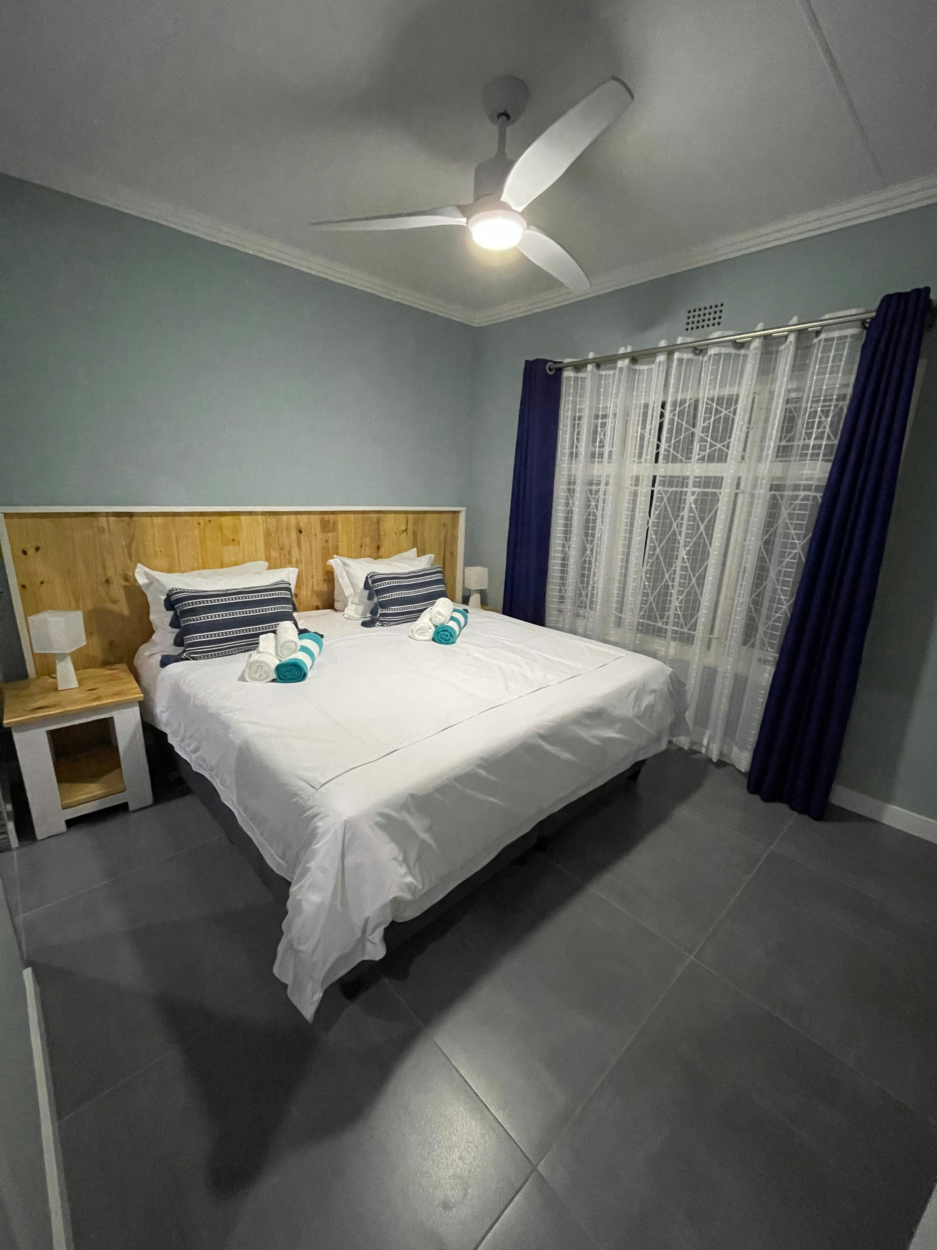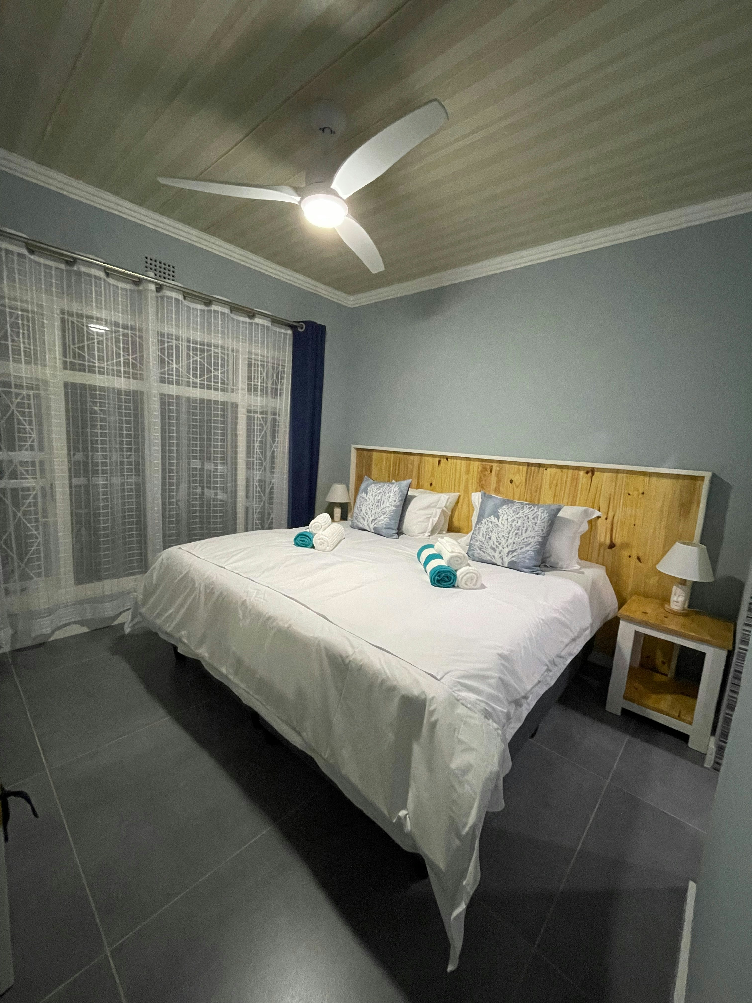 The home accommodates 9 adults and 2 children and comprises 4 bedrooms and 4 bathrooms, 3 of which are en-suite. The first bedroom and second bedroom are en-suite and are furnished with a king-size bed each that can be converted into 2 single beds on request. The bathrooms are fitted with a shower. The third bedroom has a tri-bunk bed and makes use of a separate bathroom fitted with a bath and a shower. The fourth bedroom contains a king-size bed and a child-only bunk-bed and has an en-suite bathroom fitted with a bath and a shower. The bedrooms have remote-controlled ceiling fans and ample cupboard space. All linen, bath and beach towels are provided.