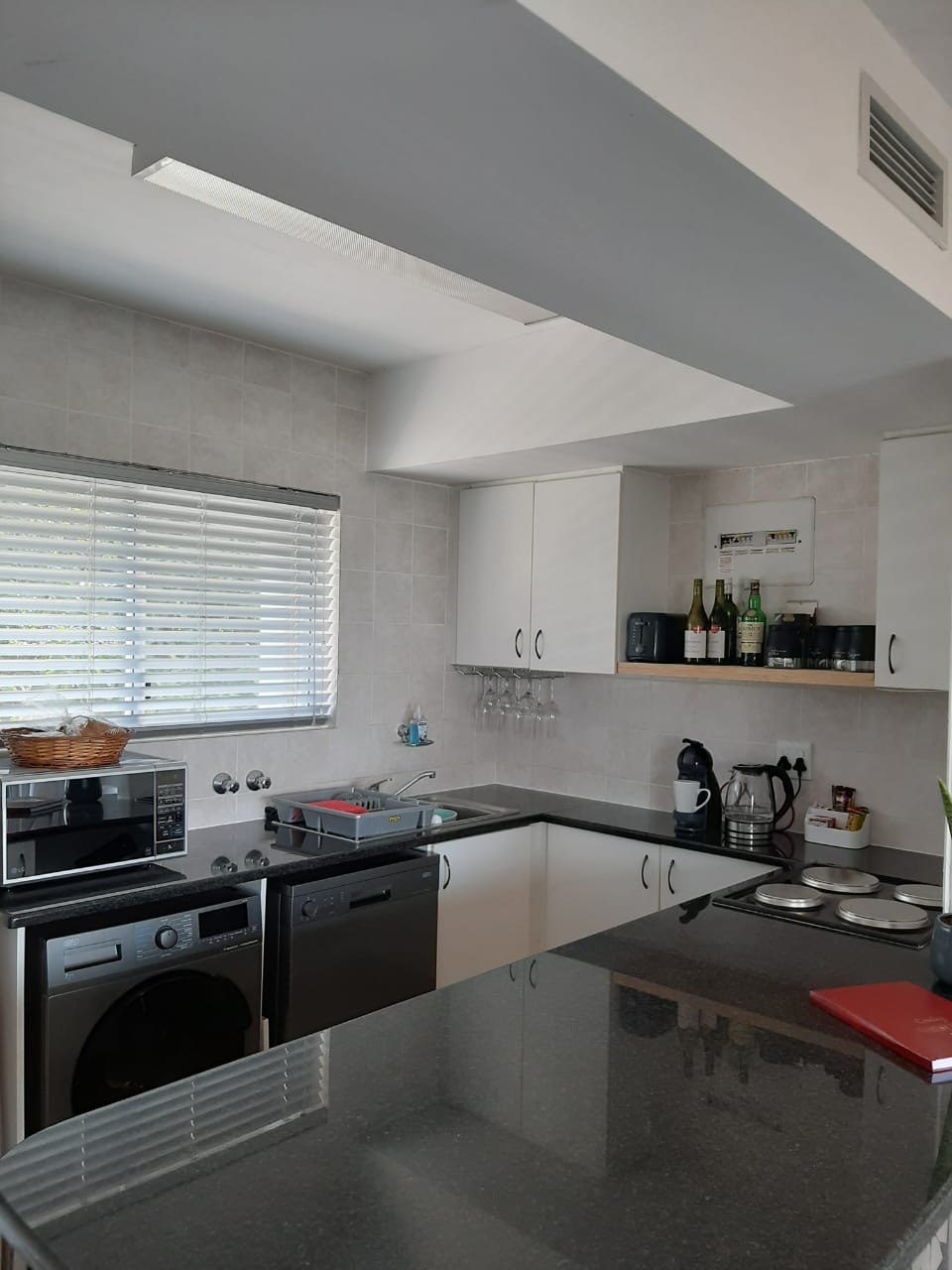 The kitchen is equipped with a fridge, a microwave, and a stove, as well as a dishwasher and washing machine for guests convenience. Off the dining area is a private balcony that looks onto the beach. Guests have access to private braai facilities.