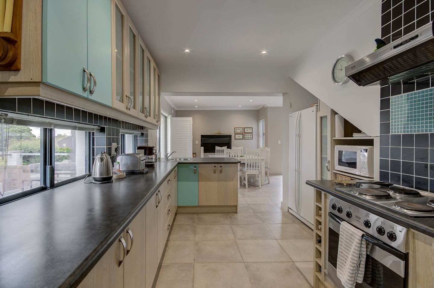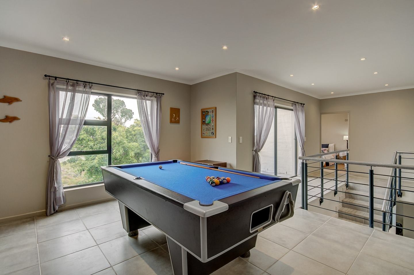 Die oopplan-kombuis op die onderste verdieping is met 'n yskas-vrieskas, elektriese stoof en oond, 'n mikrogolfoond, broodrooster, basiese eetgerei, breekware en tee- en koffiemaakgeriewe toegerus. Daar is ook 'n etenstafel met sitplek. Die leefarea het 'n sitkamerstel, 'n platskerm-TV met DStv en 'n binnebraai. Gratis WiFi is beskikbaar. Daar is ook 'n pooltafel op die boonste verdieping. Die skuifdeure lei na 'n stoep met 'n piekniektafel en 'n uitsig oor die tuin bied. Gaste kan in die plonspoel afkoel en daar is veilige parkeerplek op die perseel. LED-ligte word vir beurtkrag voorsien.
