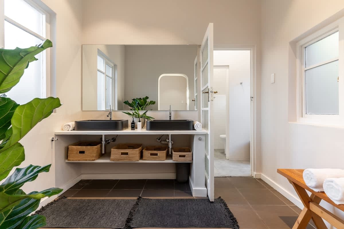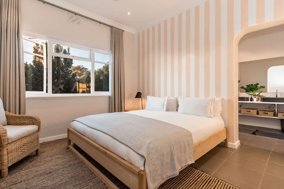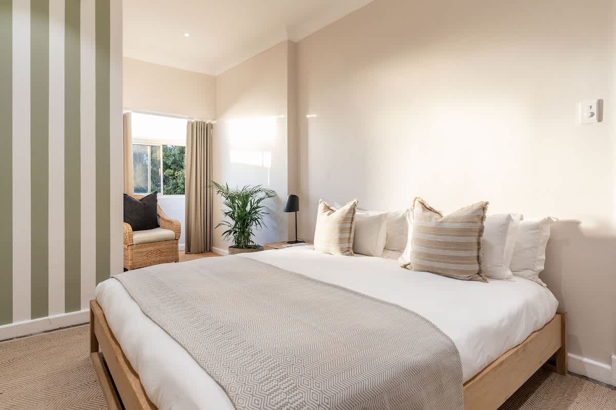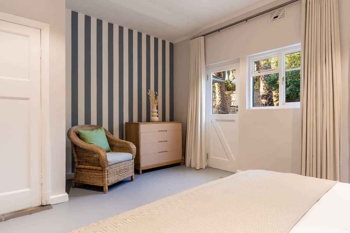 Hierdie eiendom kan tot 9 gaste akkommodeer en bestaan uit 'n hoofhuis en 'n tuinwoonstel. Die hoofhuis beskik oor 3 slaapkamers en 3 badkamers, terwyl die woonstel 2 slaapkamers en 1 badkamer het. Die eerste slaapkamer in die hoofhuis is gemeubileer met 'n koninggrootte bed en ruim kasruimte en beskik oor 'n en suite-badkamer met 'n stort. Die tweede slaapkamer het ook 'n koninggrootte bed en 'n knus alkoof met pragtige uitsigte, asook 'n en suite-badkamer met 'n stort. Die derde slaapkamer het 'n koninggrootte bed en maak gebruik van 'n aparte badkamer met 'n bad en 'n stort. In die woonstel het die eerste slaapkamer 'n dubbelbed en 'n en suite-badkamer met 'n stort, terwyl die tweede slaapkamer 'n driekwartbed en ruim stoorplek het. Linne en badhanddoeke word voorsien.
