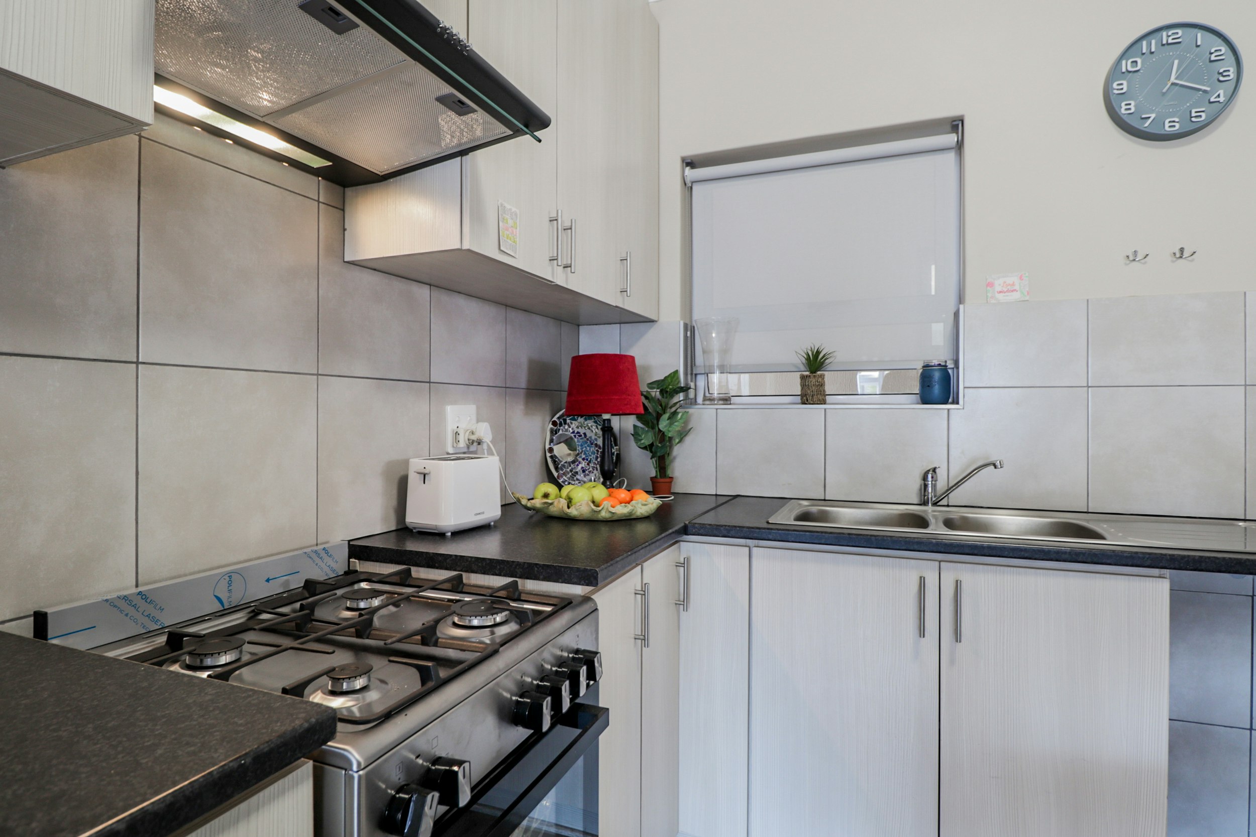 The kitchen is fully equipped for self-catering and contains a stove, oven, fridge-freezer, microwave, washing machine, cutlery, crockery, and a breakfast nook. The open-plan living area features an indoor braai and a comfortable couch.