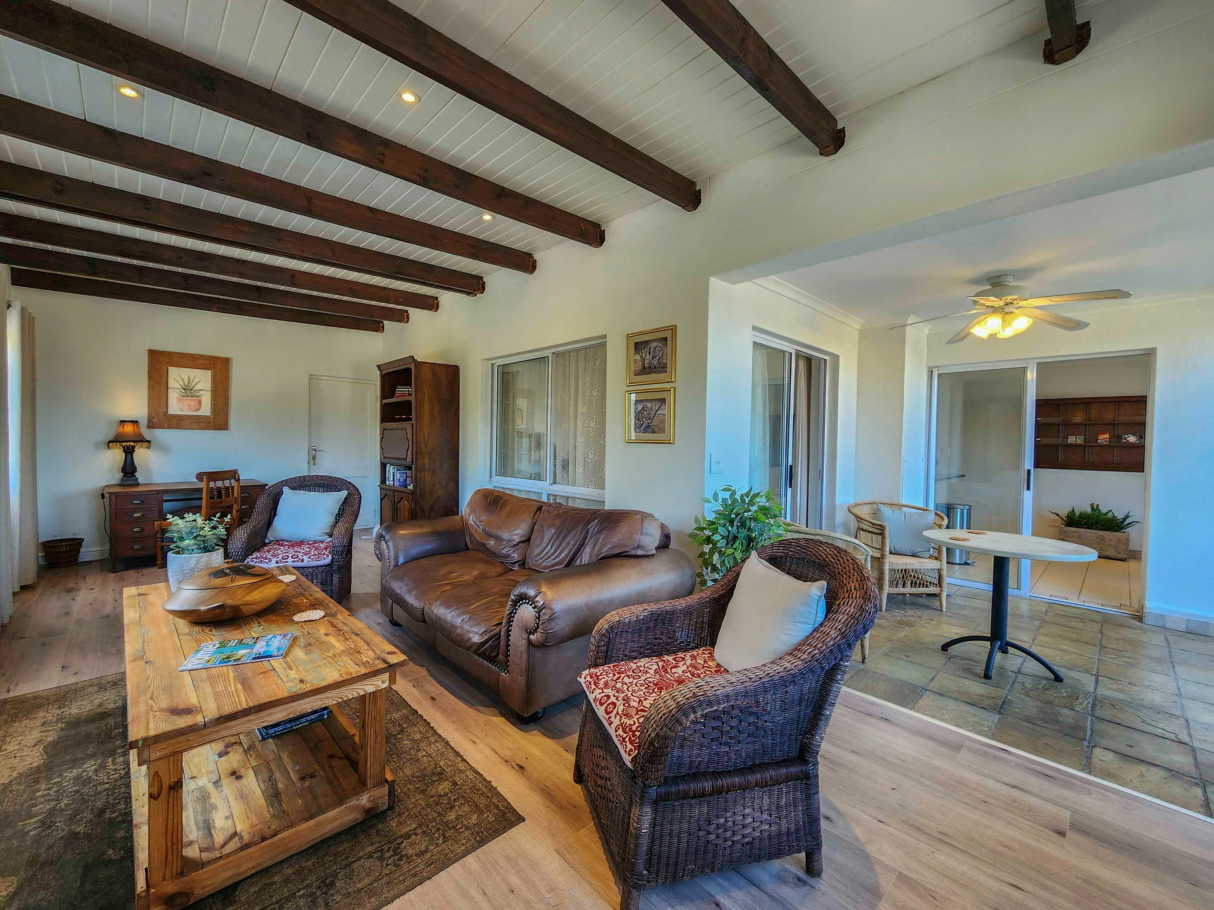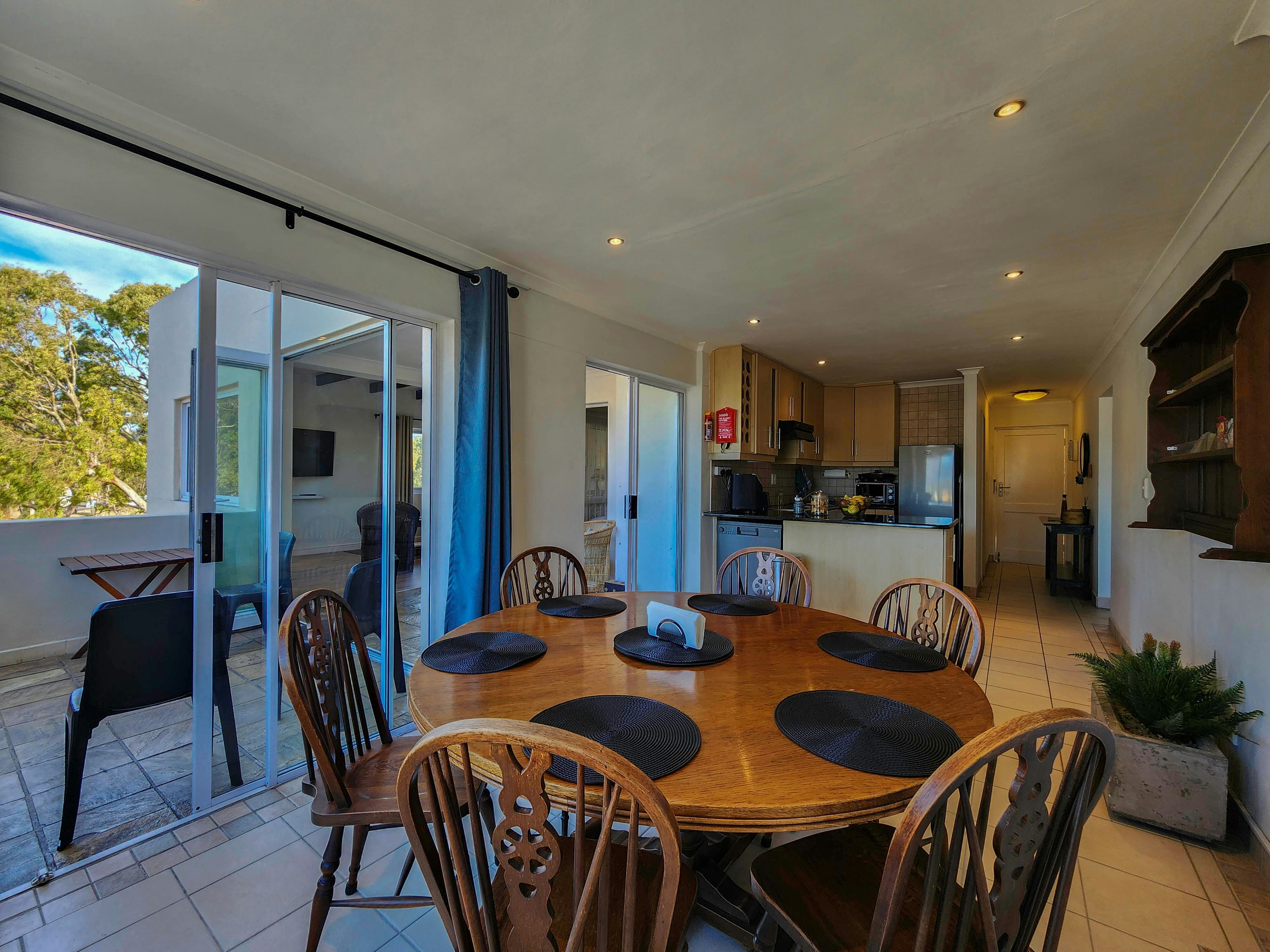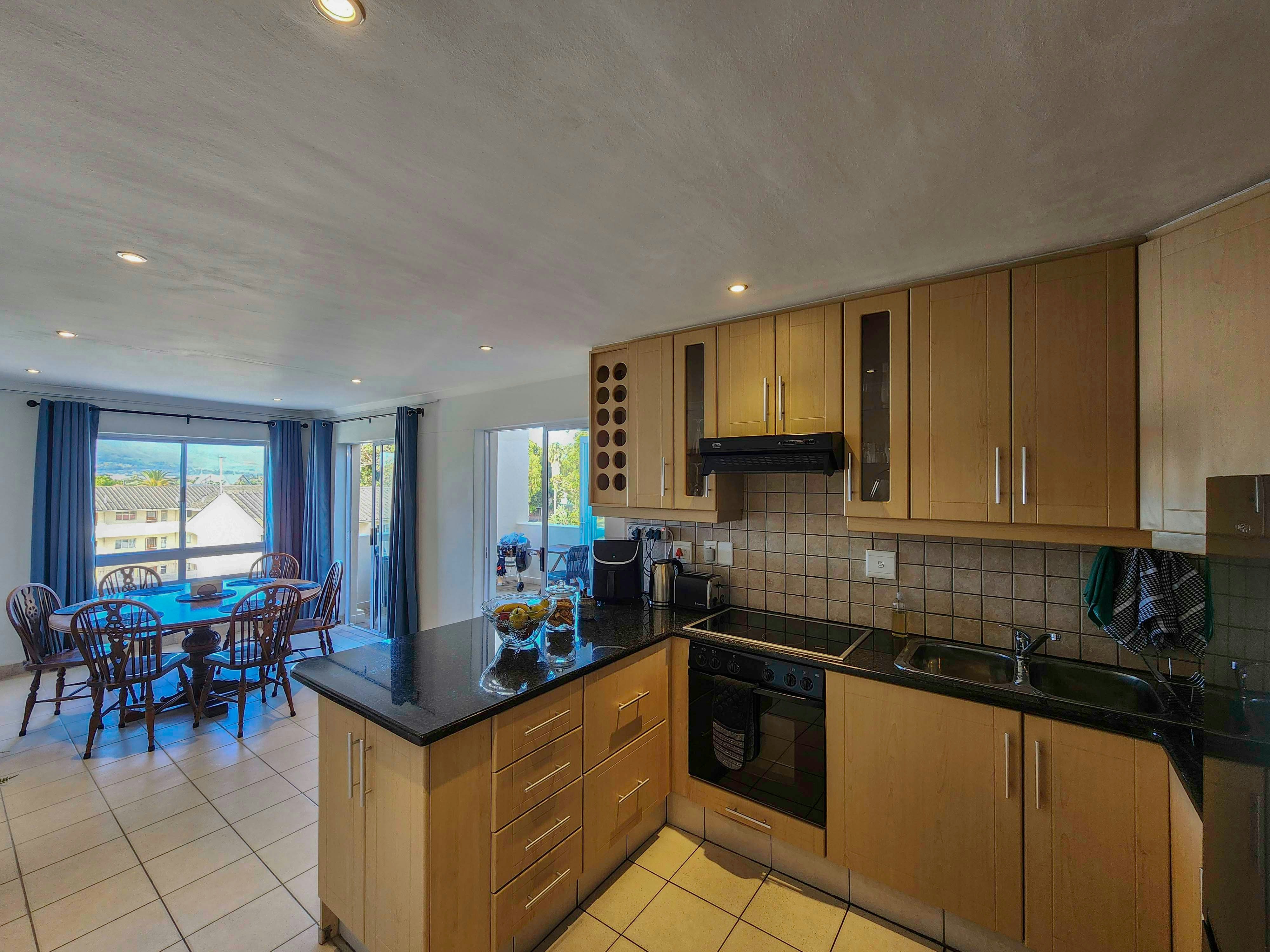 Die oopplan-leefarea beskik oor 'n kombuis wat volledig toegerus is met 'n stoof, oond, lugbraaier, mikrogolfoond, yskas-vrieskas, eetgerei en breekware, asook tee- en koffiemaakgeriewe. Vir gaste se gerief is 'n skottelgoedwasser ook beskikbaar. Vanuit hierdie kombuis is 'n eetkamertafel waar gaste hul maaltye saam kan geniet. Die sitkamer het gemaklike sitplek en 'n TV.