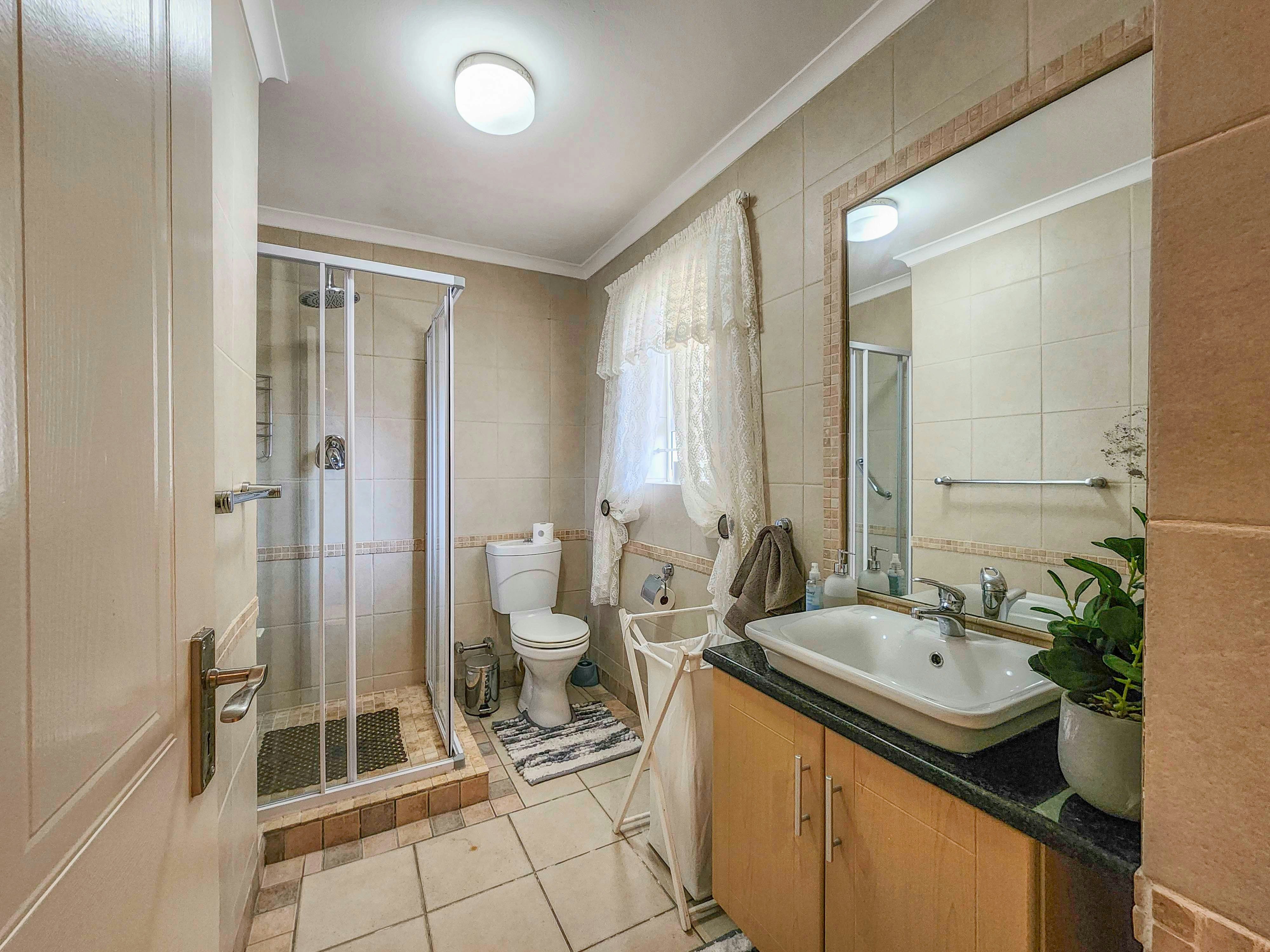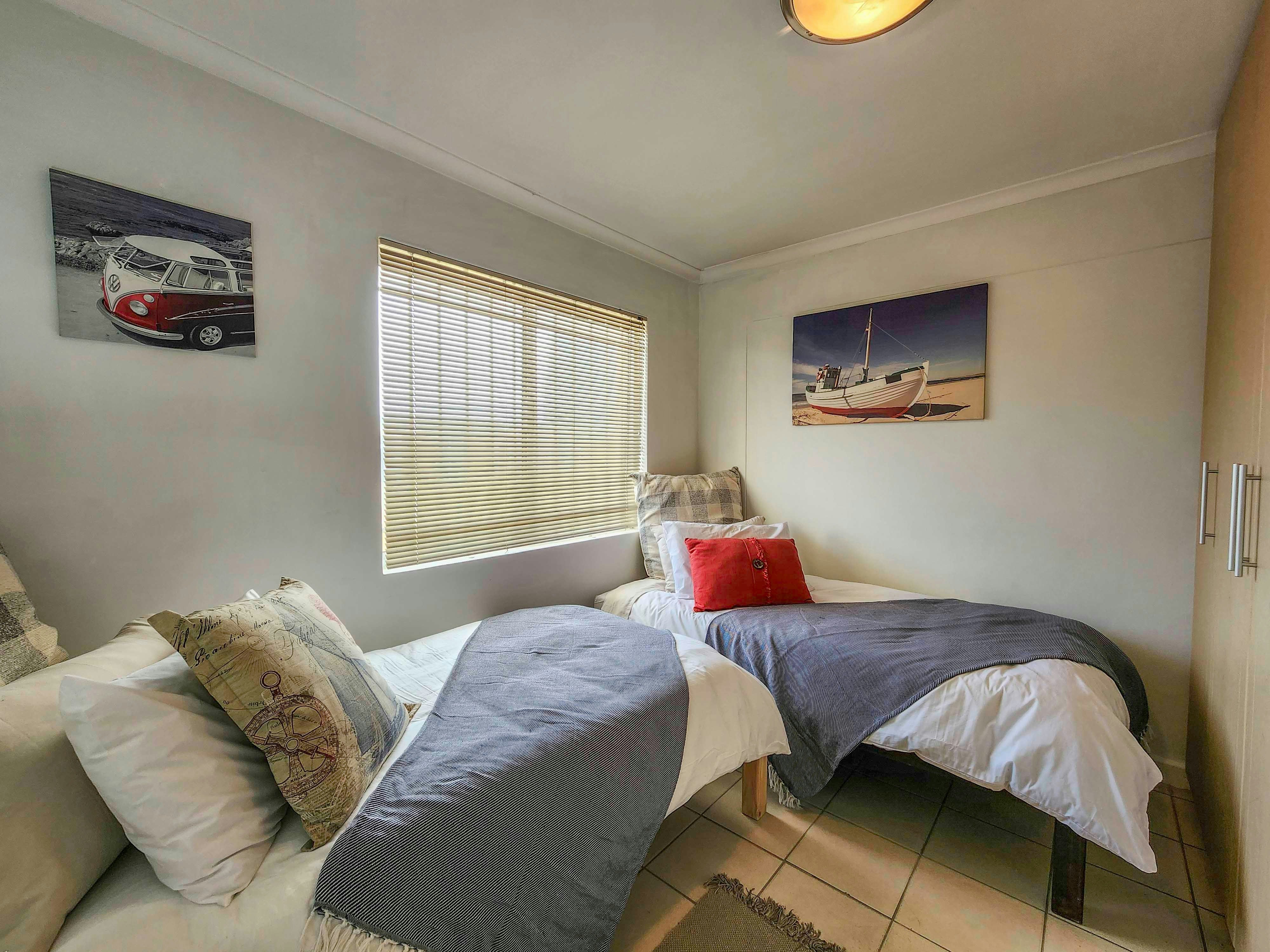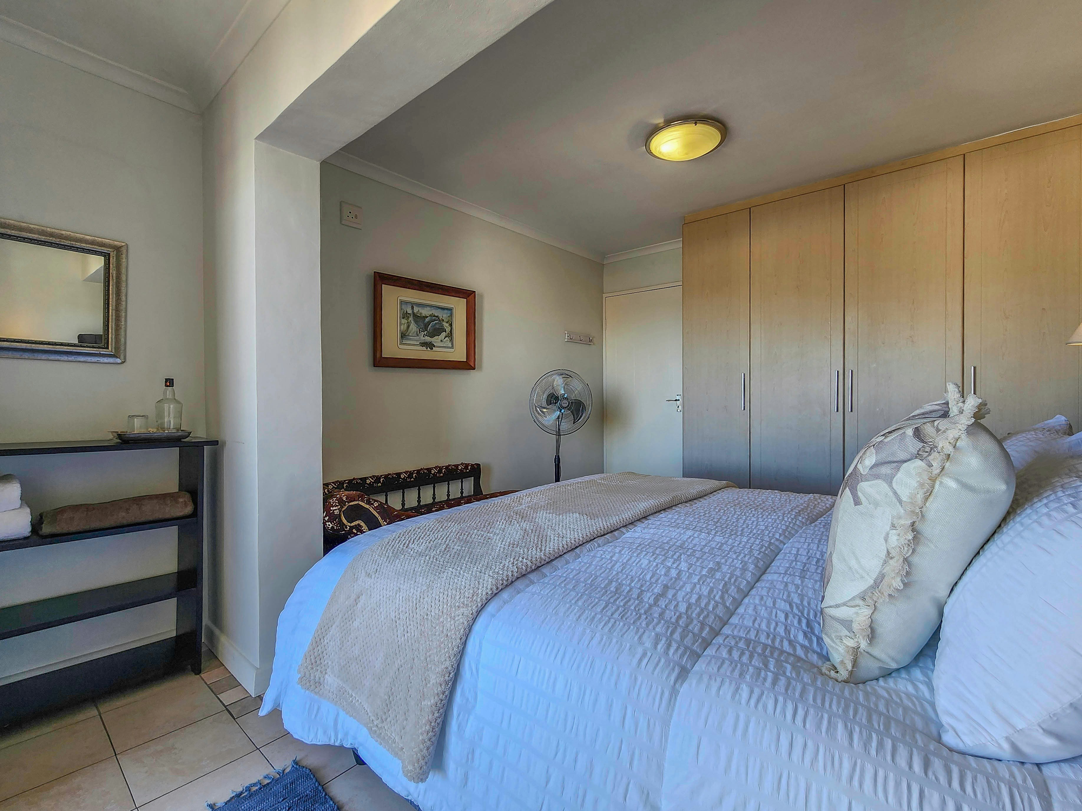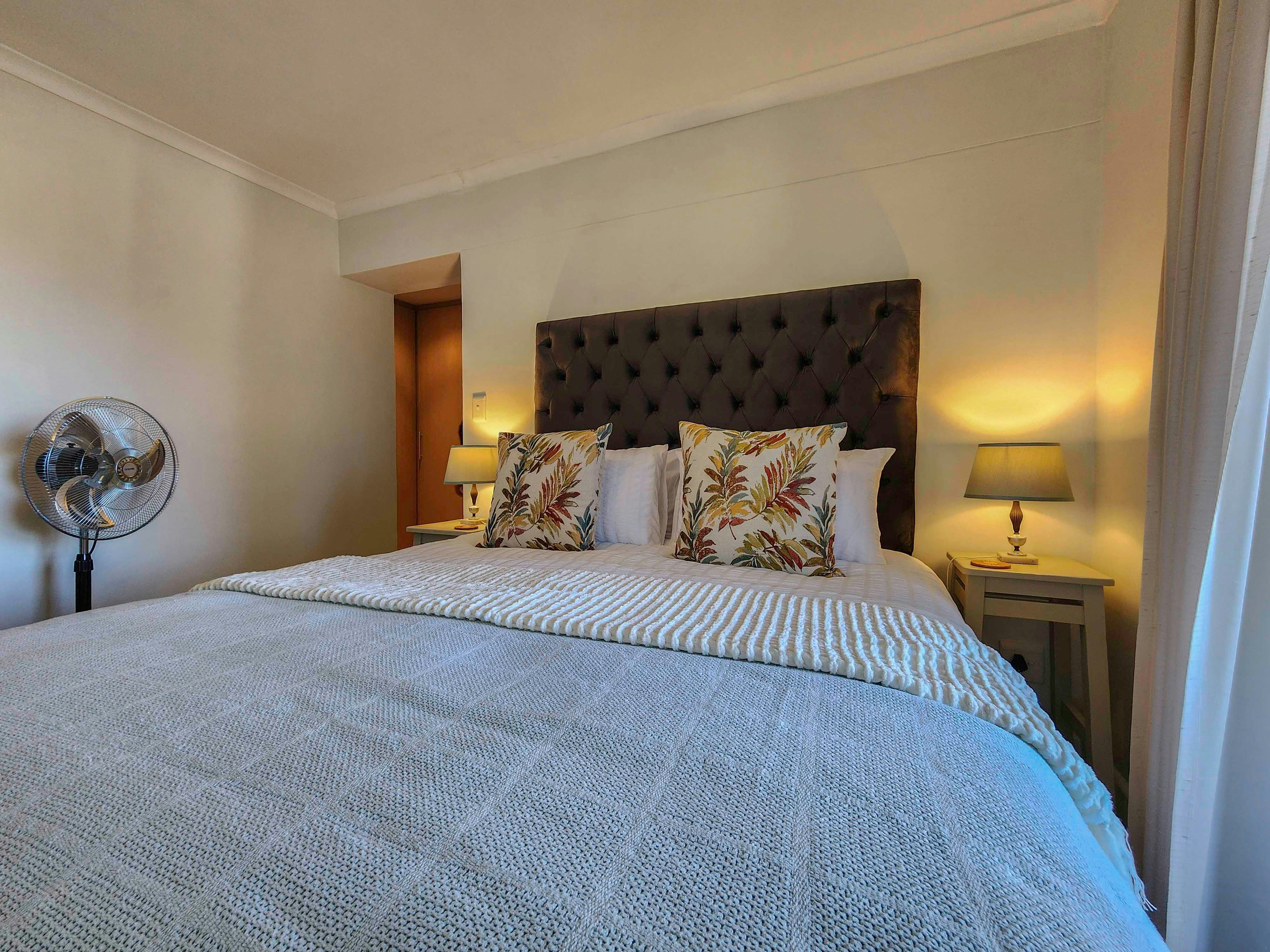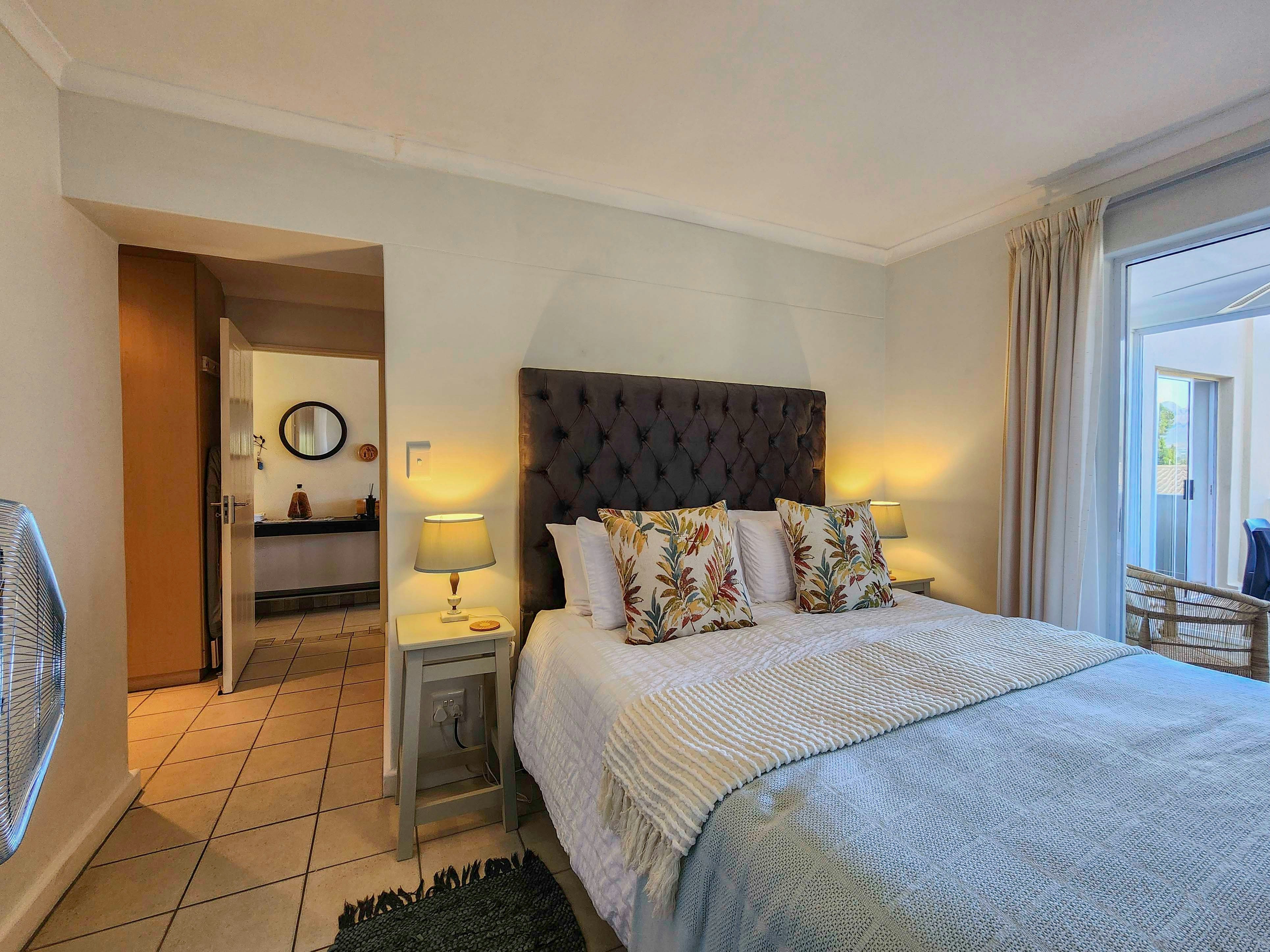 Hierdie woonstel kan gemaklik altesaam 6 gaste akkommodeer, met 3 slaapkamers en 2 badkamers. Die eerste 2 slaapkamers is albei ingerig met 'n koningingrootte-bed, waarvan een 'n balkon het en die ander na 'n patio lei, en die derde slaapkamer het 2 enkelbeddens. Die eerste badkamer is en suite met die hoofslaapkamer en is toegerus met 'n bad, toilet en wasbak, en die tweede gedeelde badkamer is toegerus met 'n stort, toilet en wasbak.