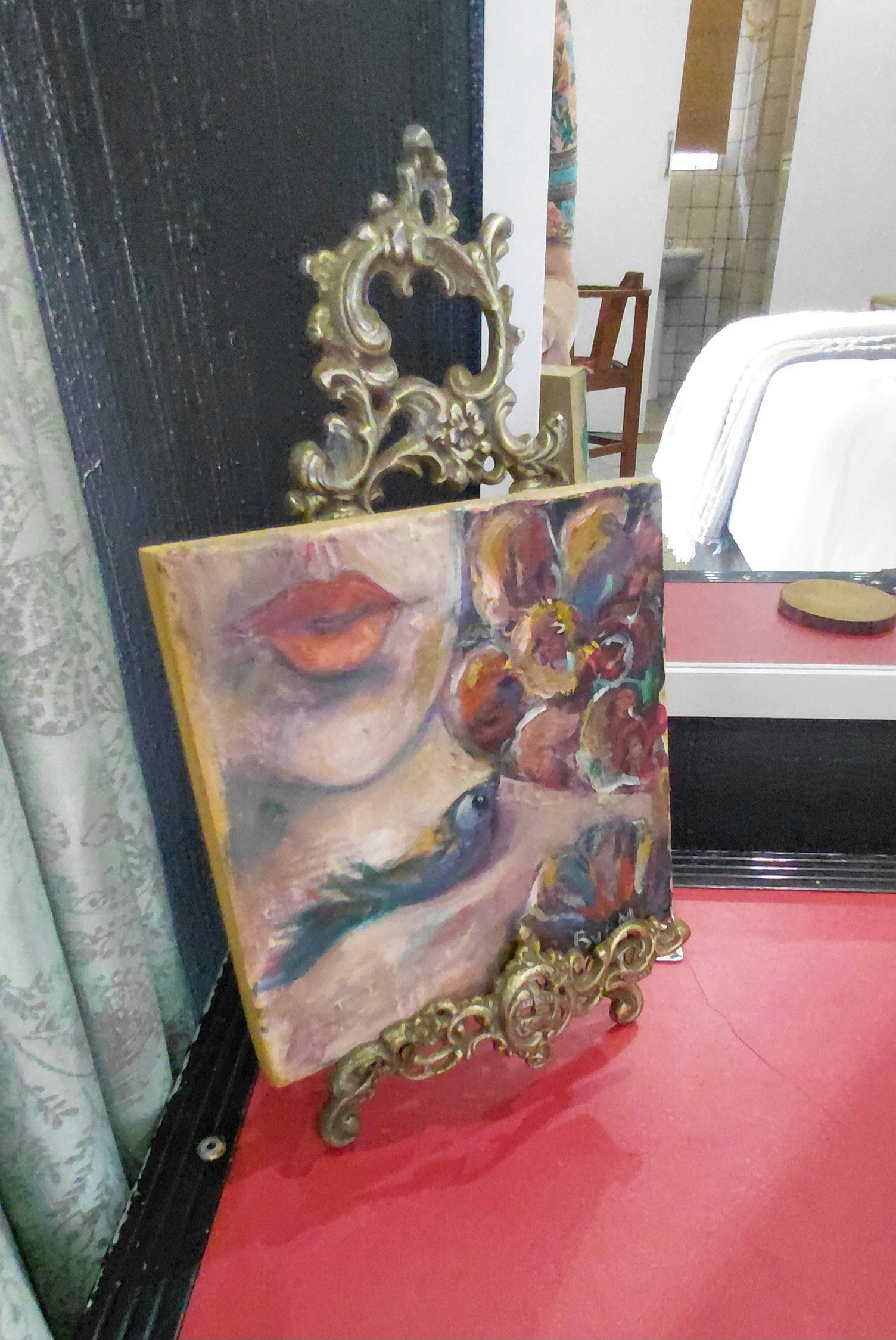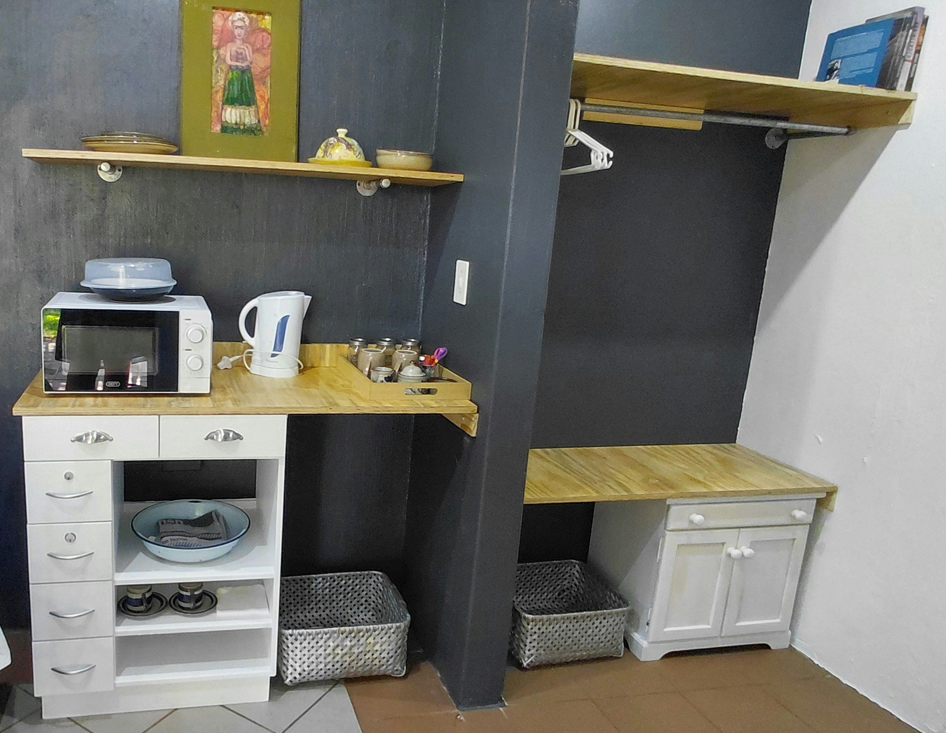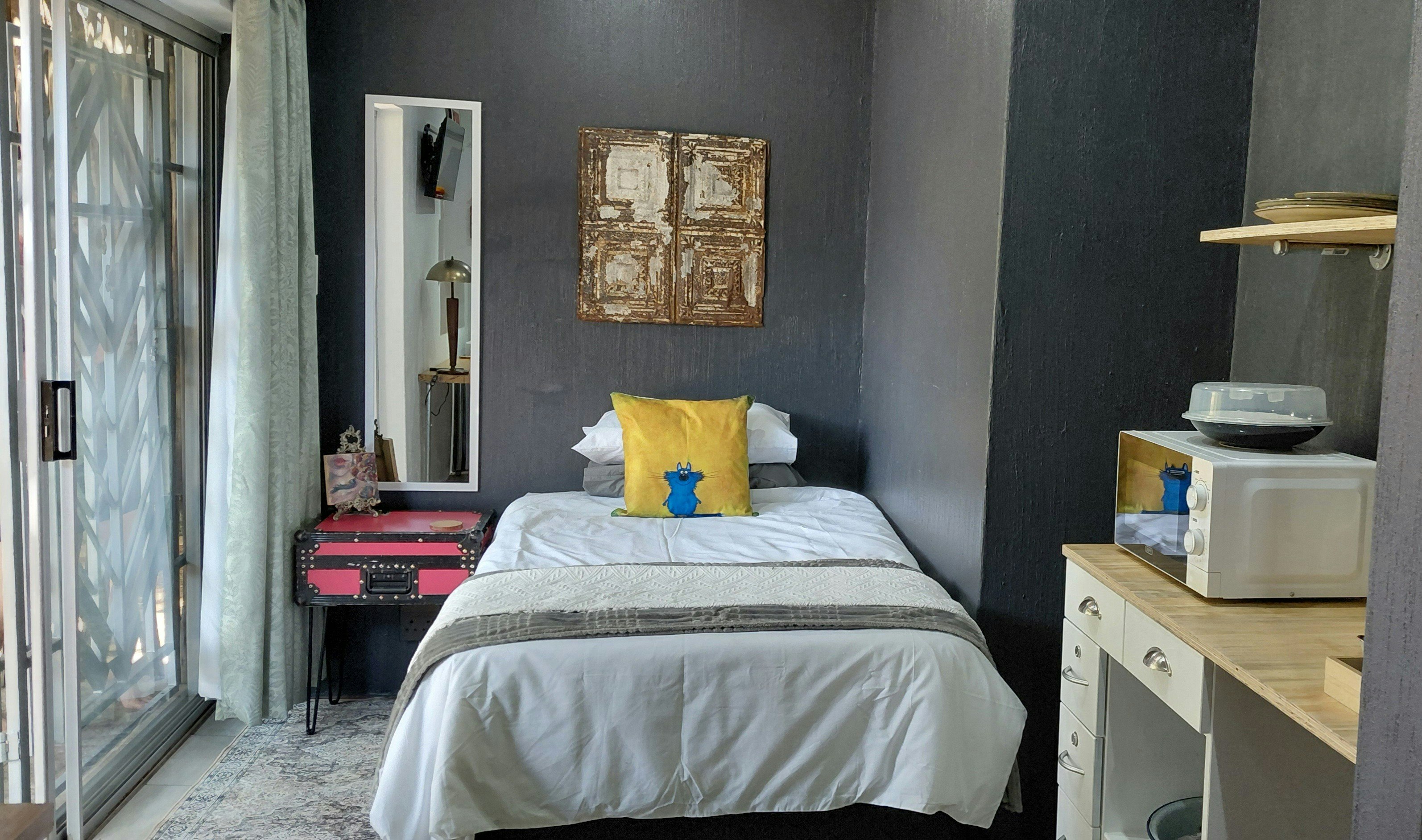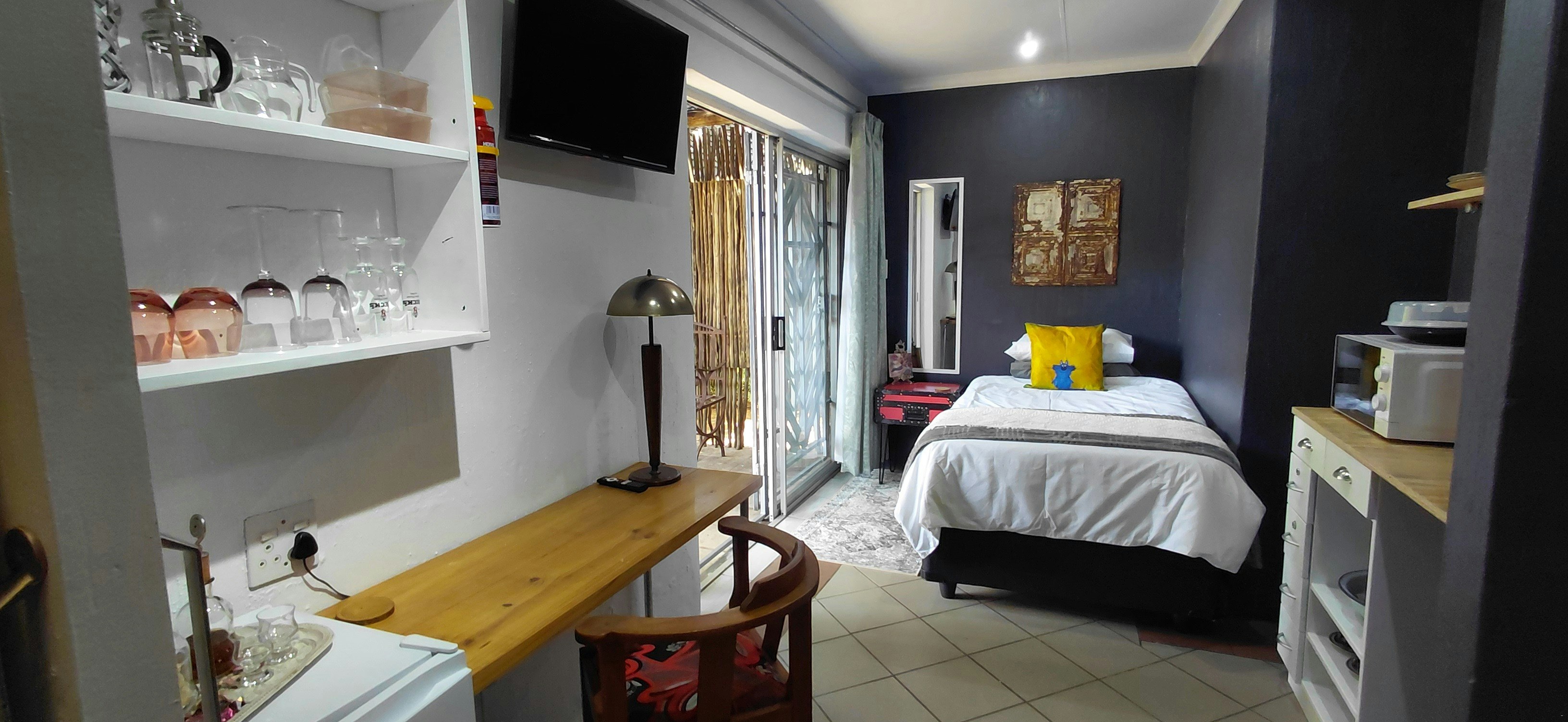 Die ateljee is kompak gemeubileer met 'n 3/4 bed, 'n kombuisie wat verhit-en-eetgeriewe, 'n lessenaar, 'n klein yskas, 'n mikrogolfoond en 'n ketel insluit. Daar is 'n en suite-stort, toilet en wasbak. Daar is 'n stoepie wat op die tuin uitkyk.