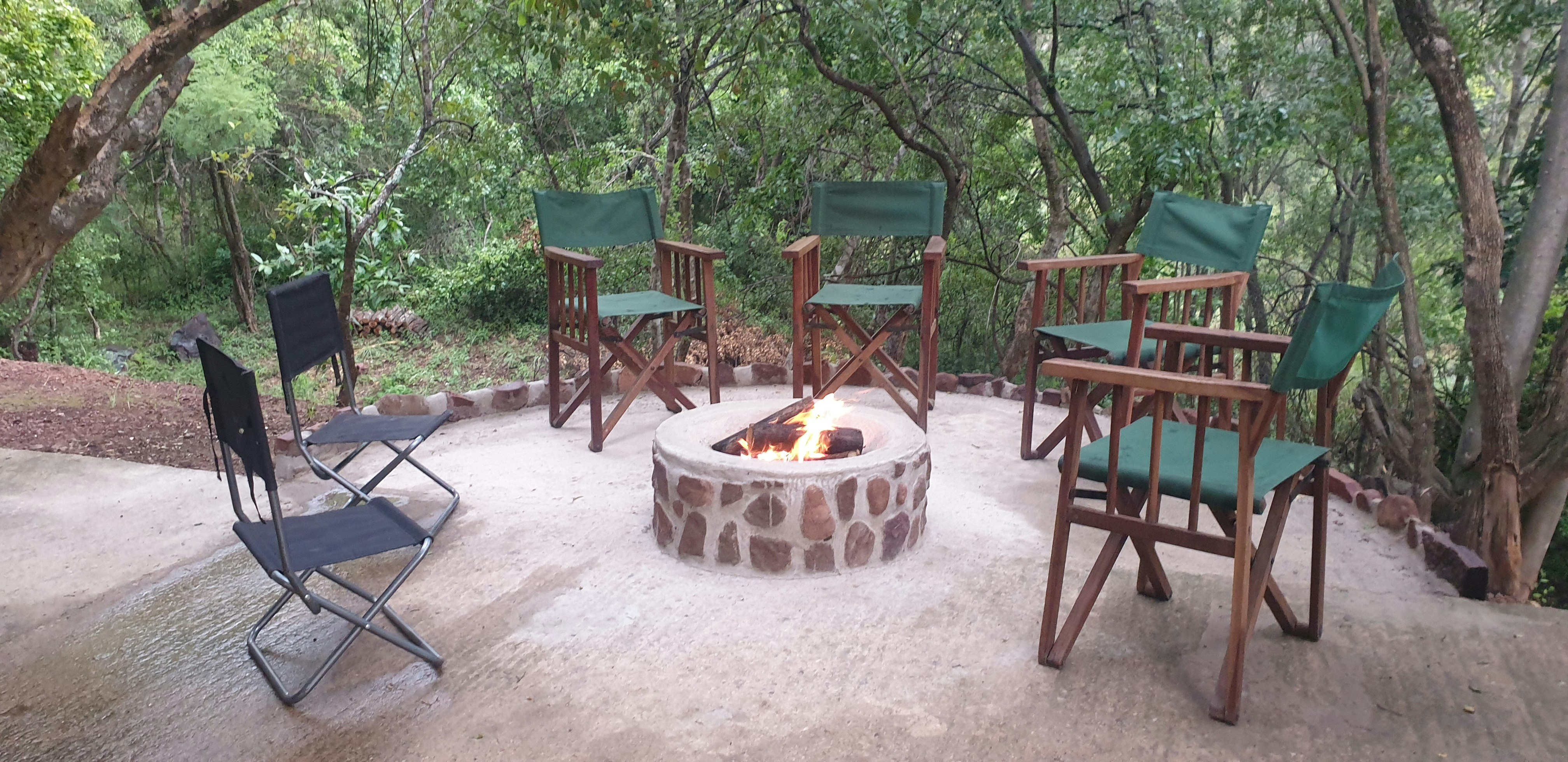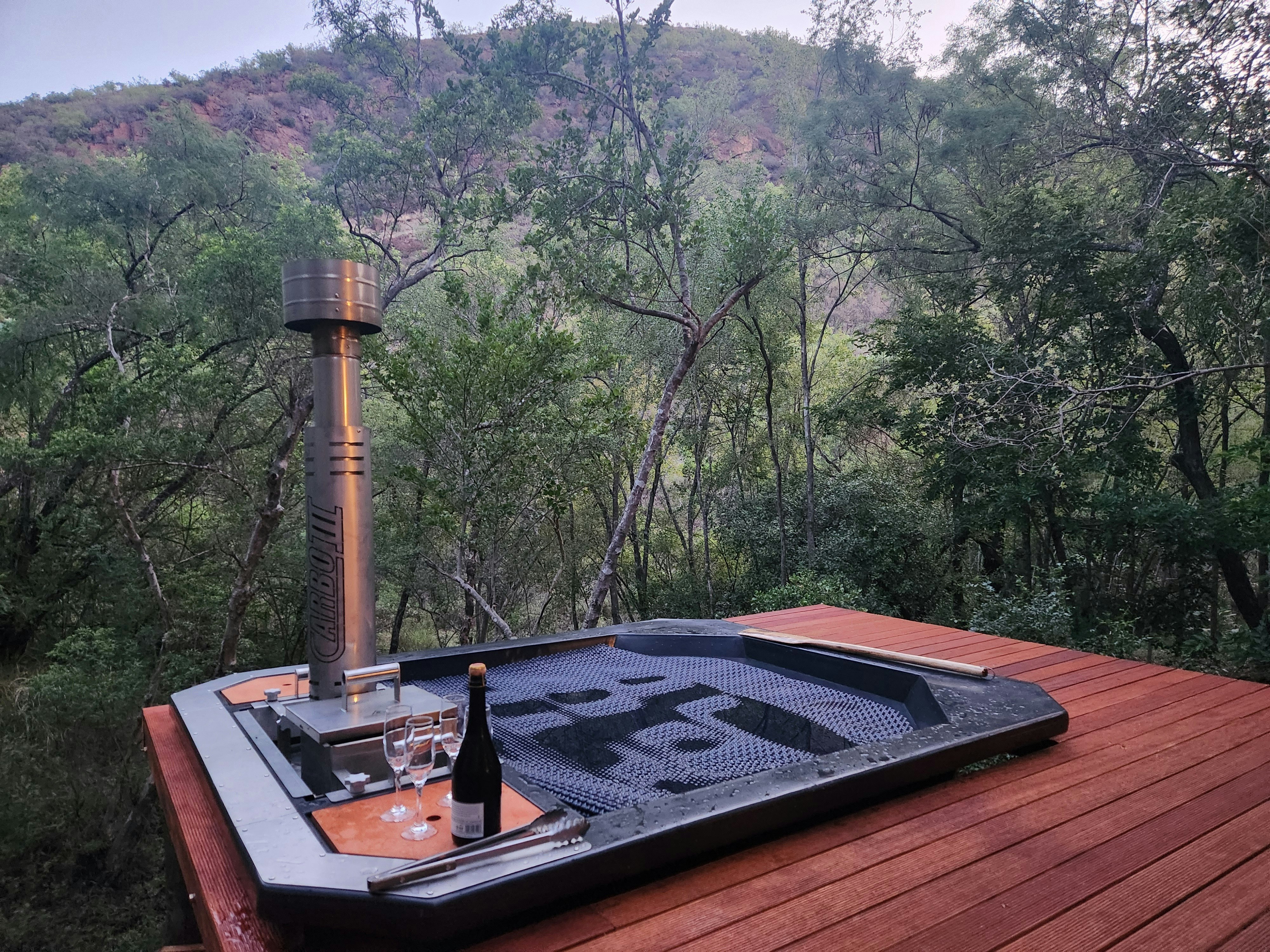 Buite het gaste toegang tot 'n patio, braai en vuurput-area, ideaal vir skemerkelkies sowel as wandelings op die pragtige en eksklusiewe 66 ha bosplaas met kloof en watervalle.