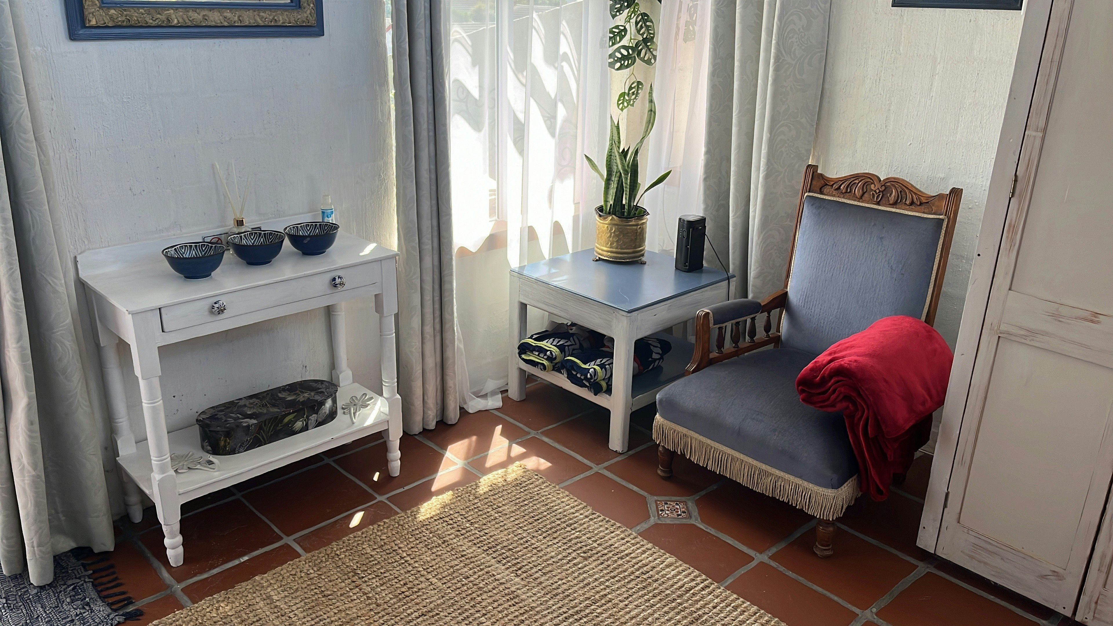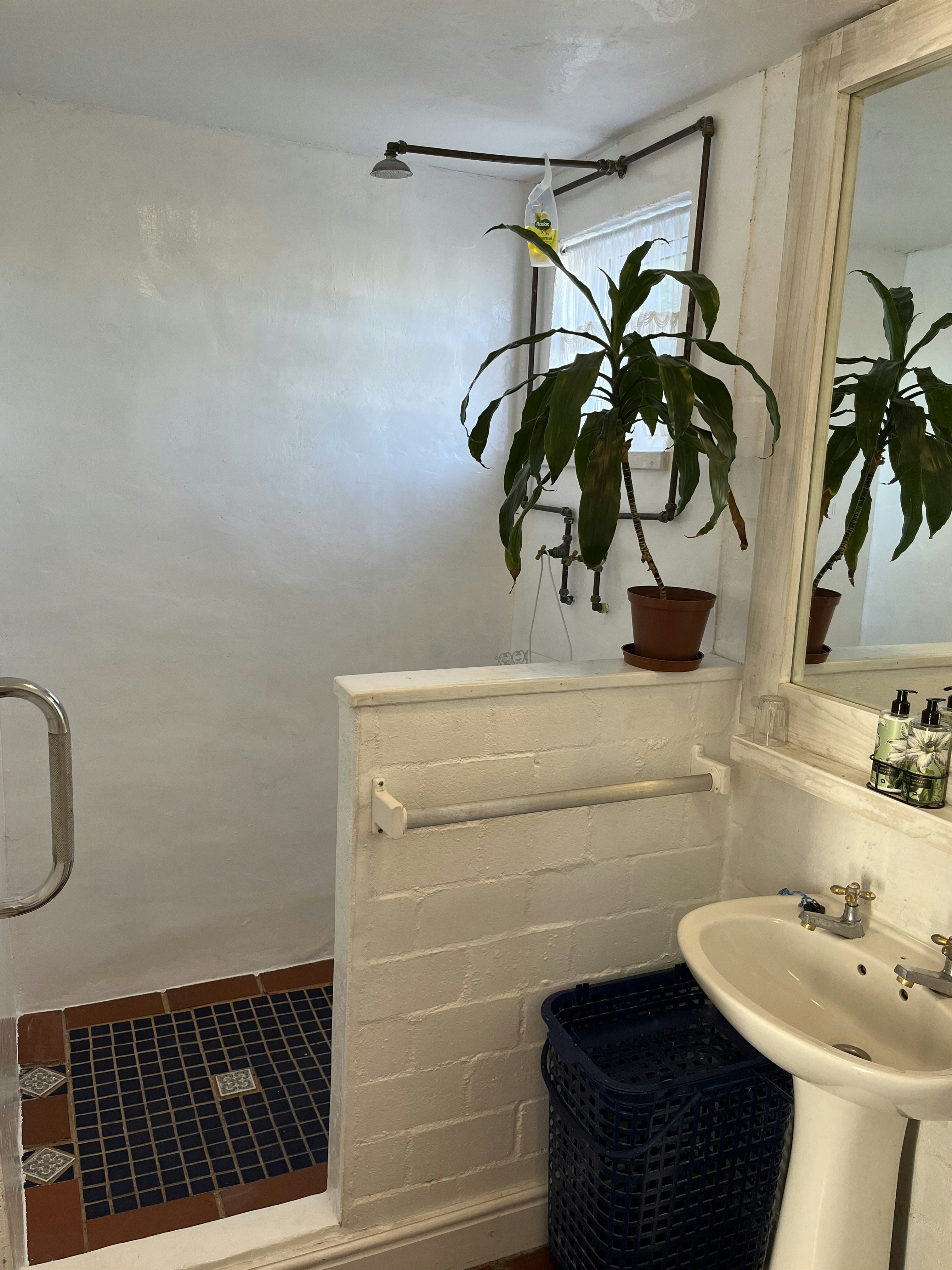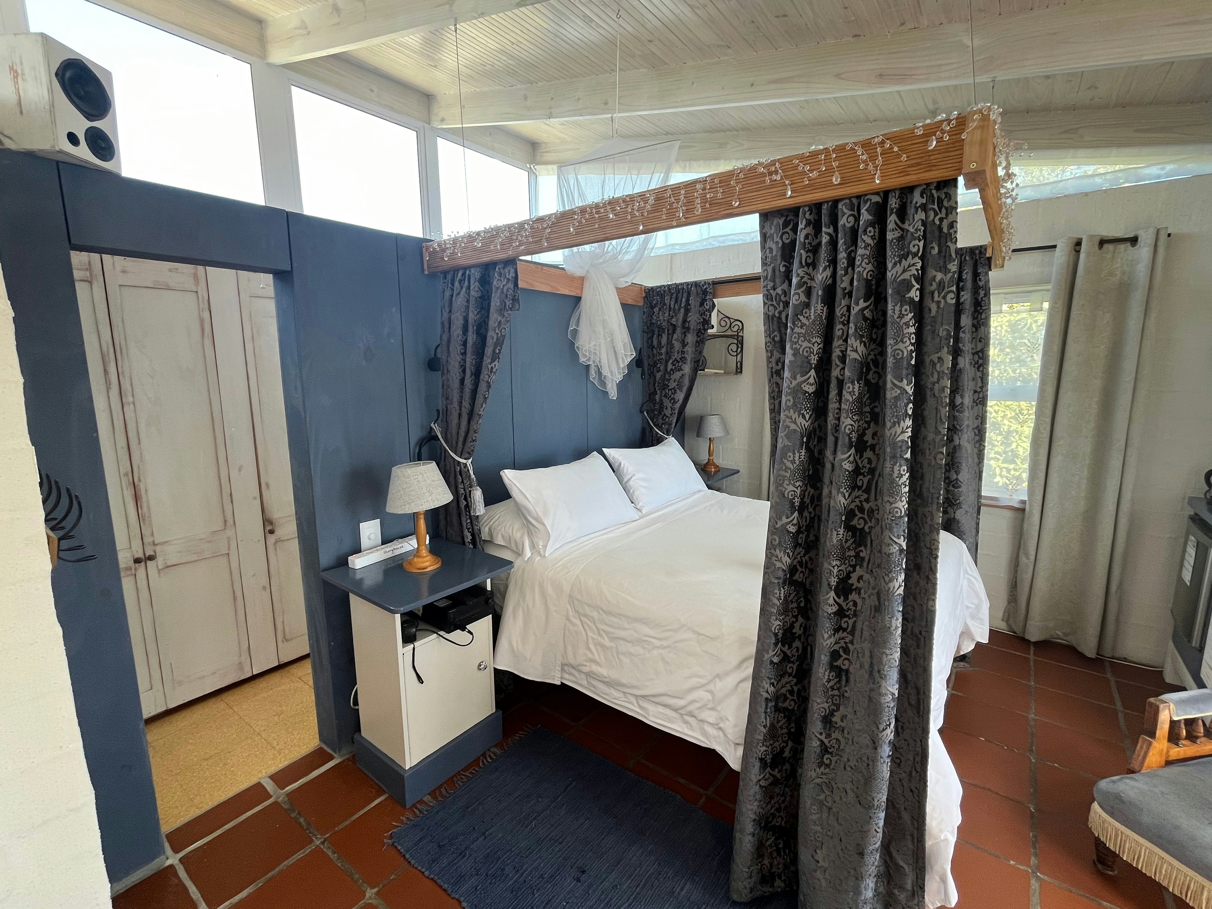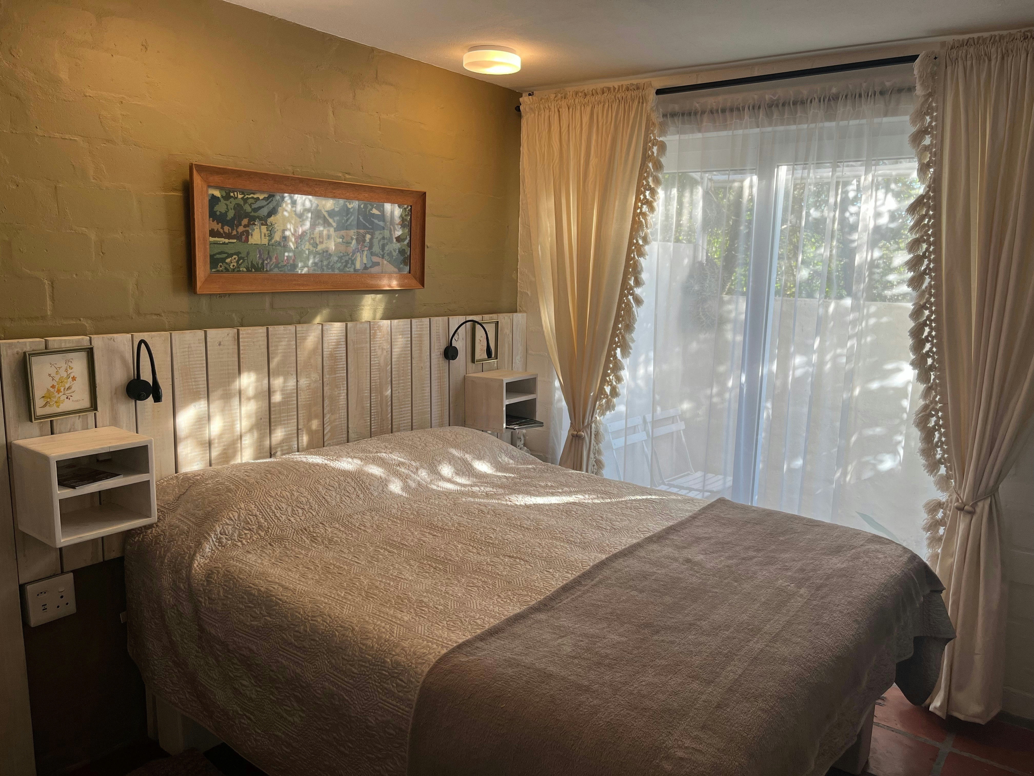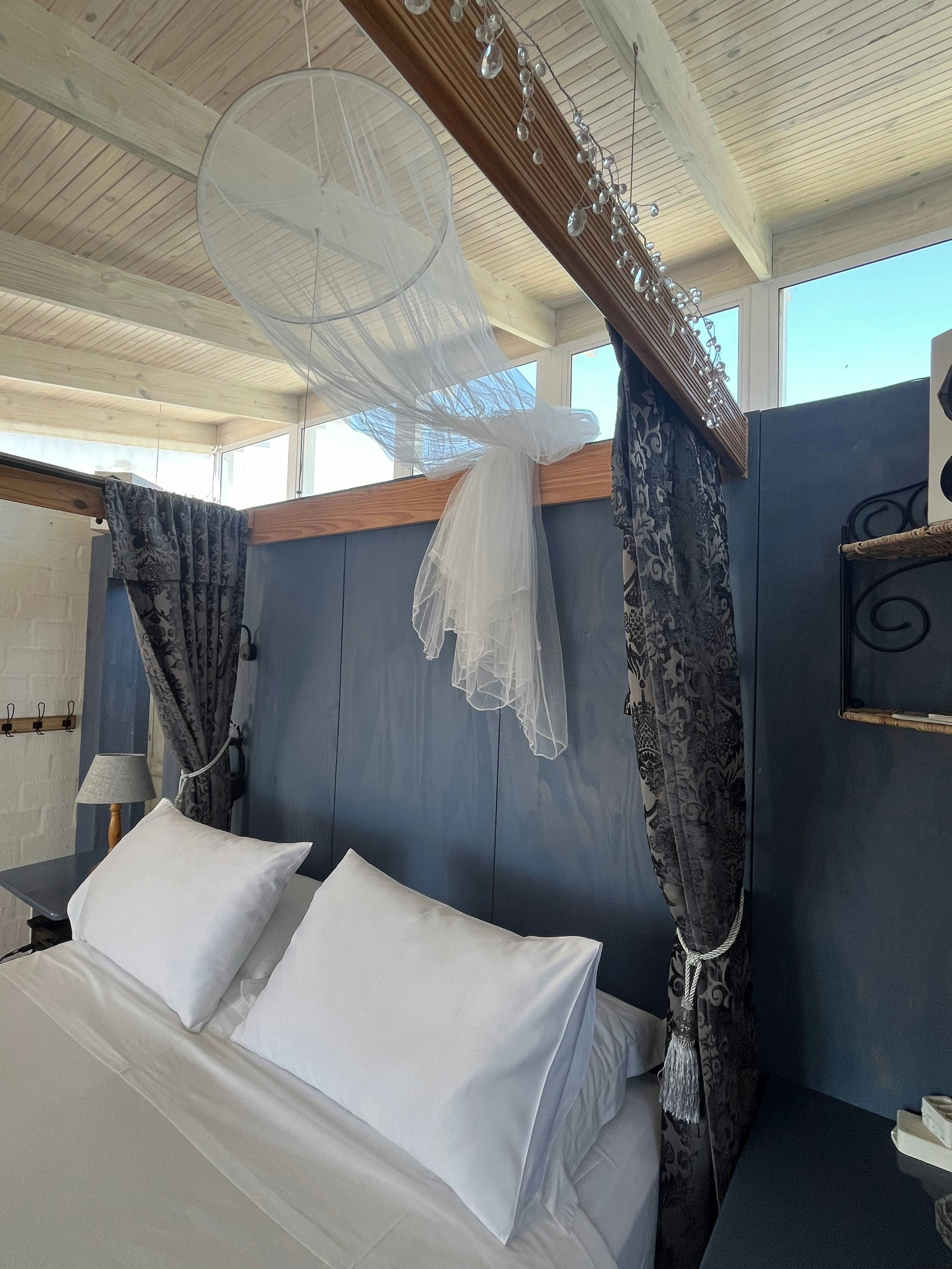 Die B&B-kamer met Juliette-balkon het 'n koningingrootte-bed, 'n hoekbad met 'n stort-oor-bad, toilet en wasbak.