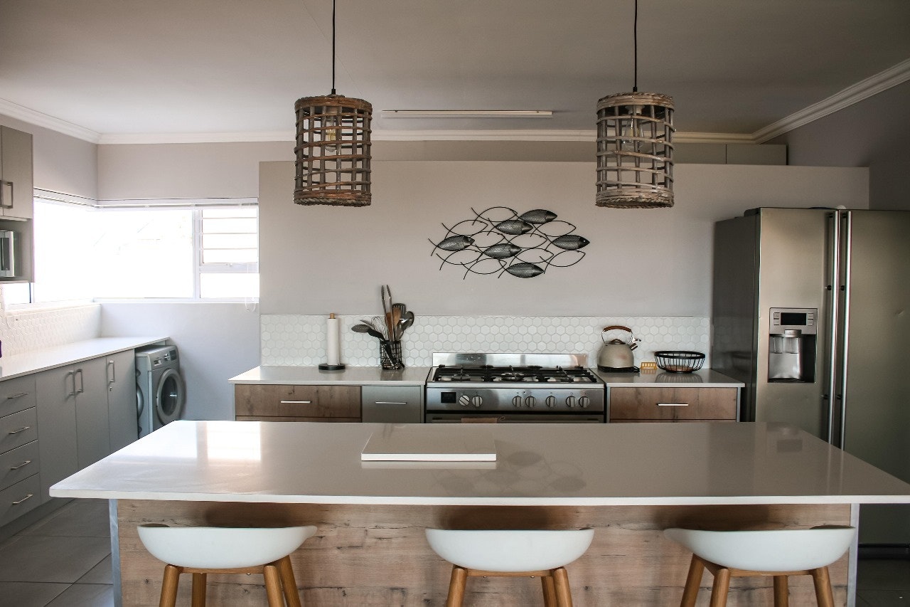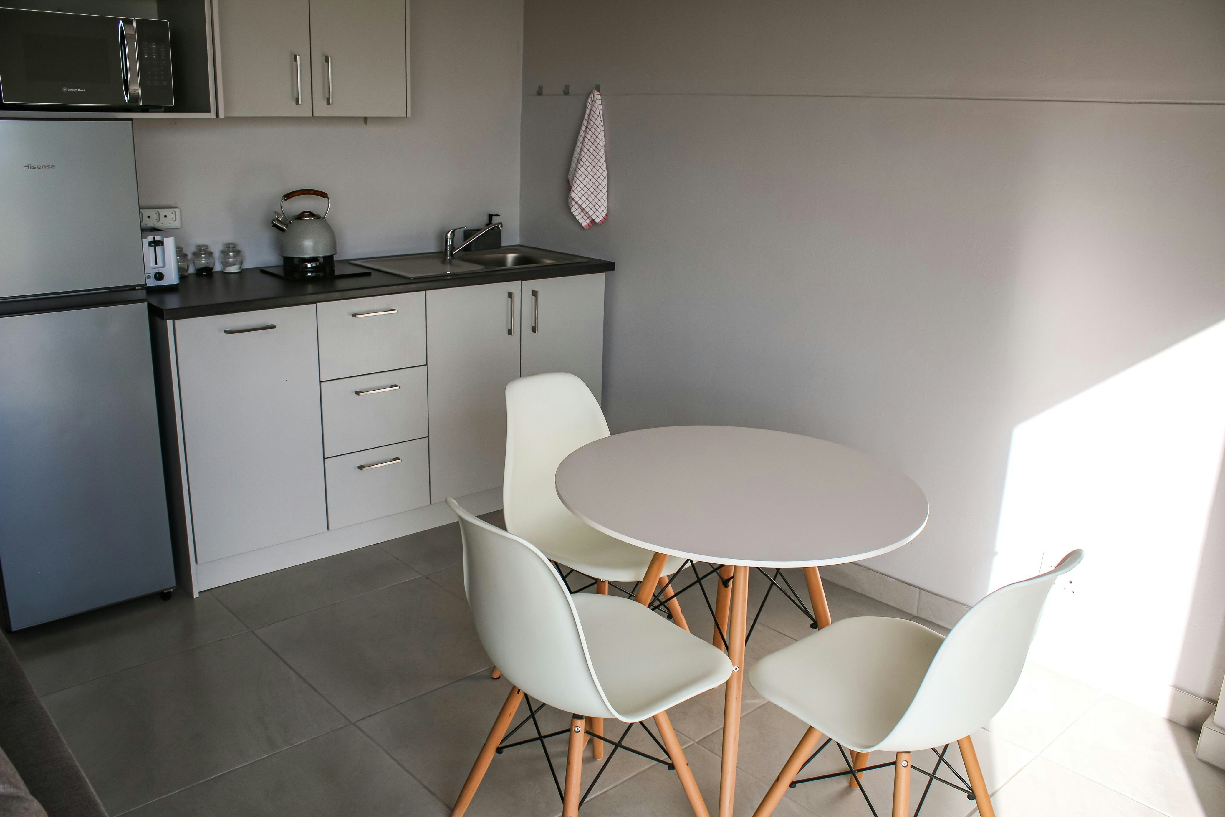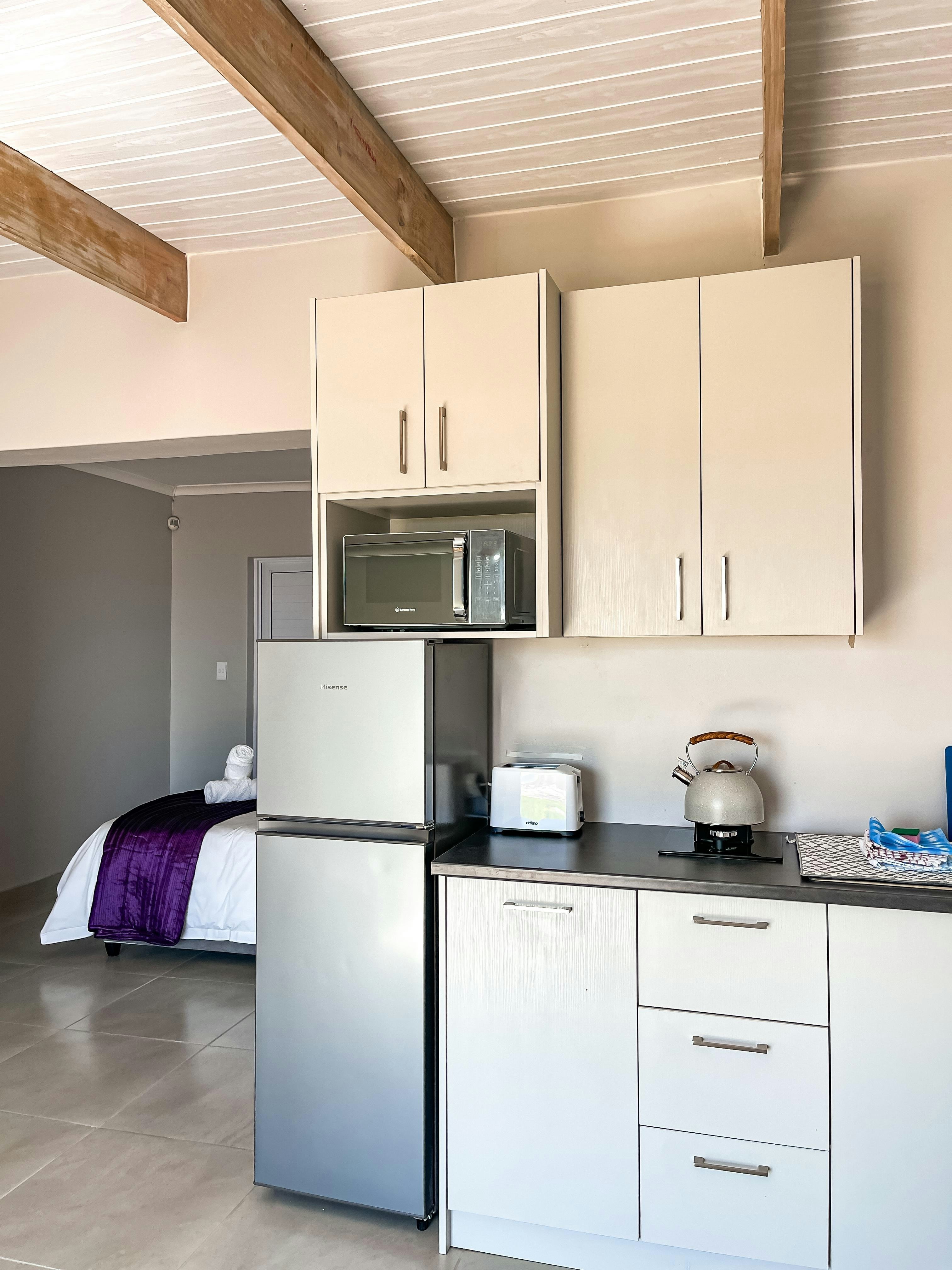 Die oopplan-leefarea sluit 'n volledig toegeruste kombuis in met 'n gasstoof, oond, mikrogolfoond, kookplaat, ketel, yskas-vrieskas, broodrooster, skottelgoedwasser, wasmasjien, en alle nodige eetgerei en breekware. Daar is ook 'n ontbyttoonbank met stoele vir informele etes.