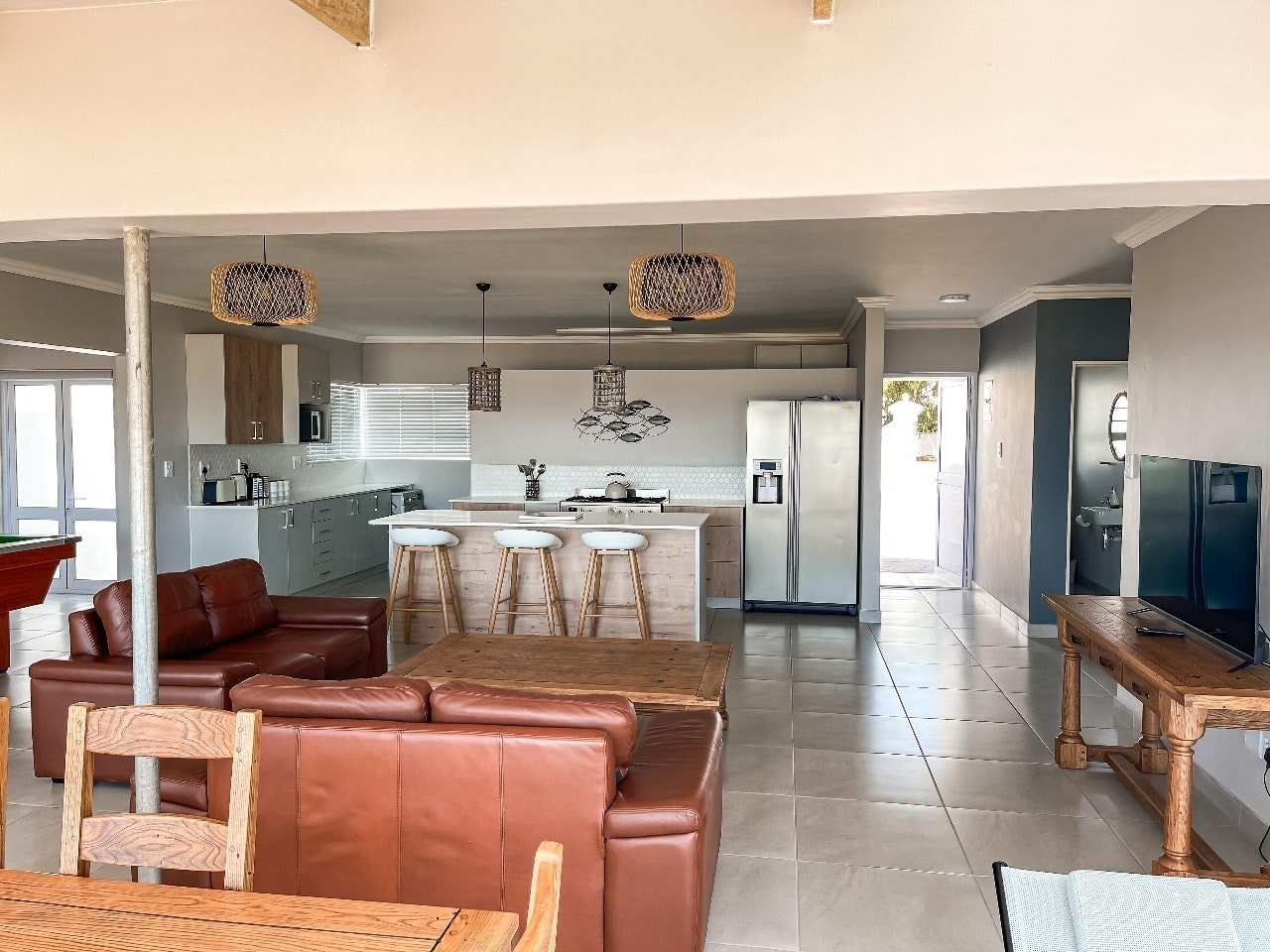 Die oopplan-leefarea en -eetarea bied sitplek vir ontspanning en etes, en beskik oor 'n knus binnenshuise kaggel/ingeboude braai-area, sowel as 'n biljartkamer vir vermaak. 'n TV is in die sitkamer beskikbaar vir ekstra gerief.