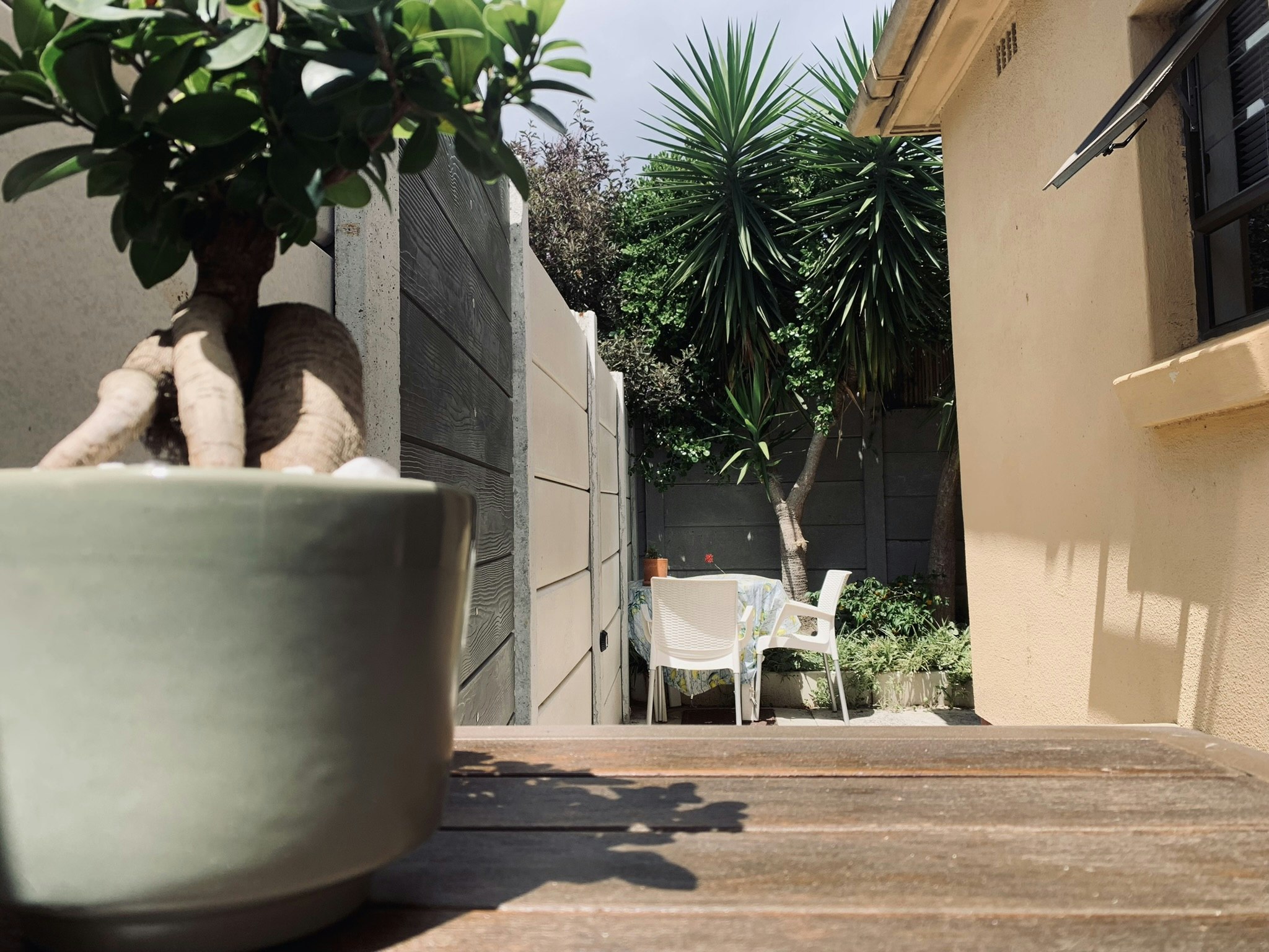 Buite is daar 'n klein, privaat area met 2 buite-etenstafels en stoele. Veilige, aangewese parkeerplek word agter 'n afstandbeheerde hek voorsien.