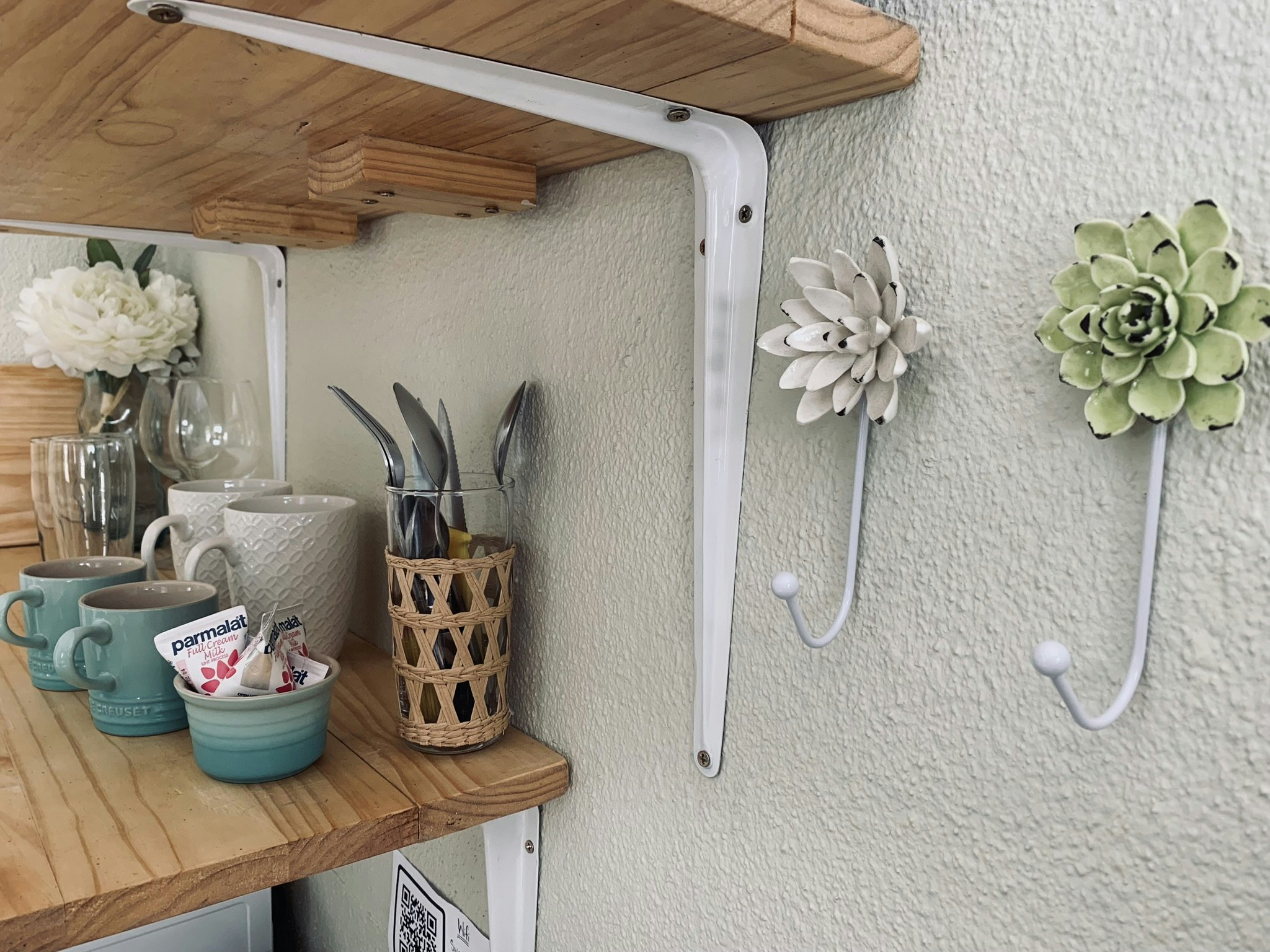 Die kombuisie is met 'n yskassie, mikrogolfoond, ketel, broodrooster en eetgerei toegerus.