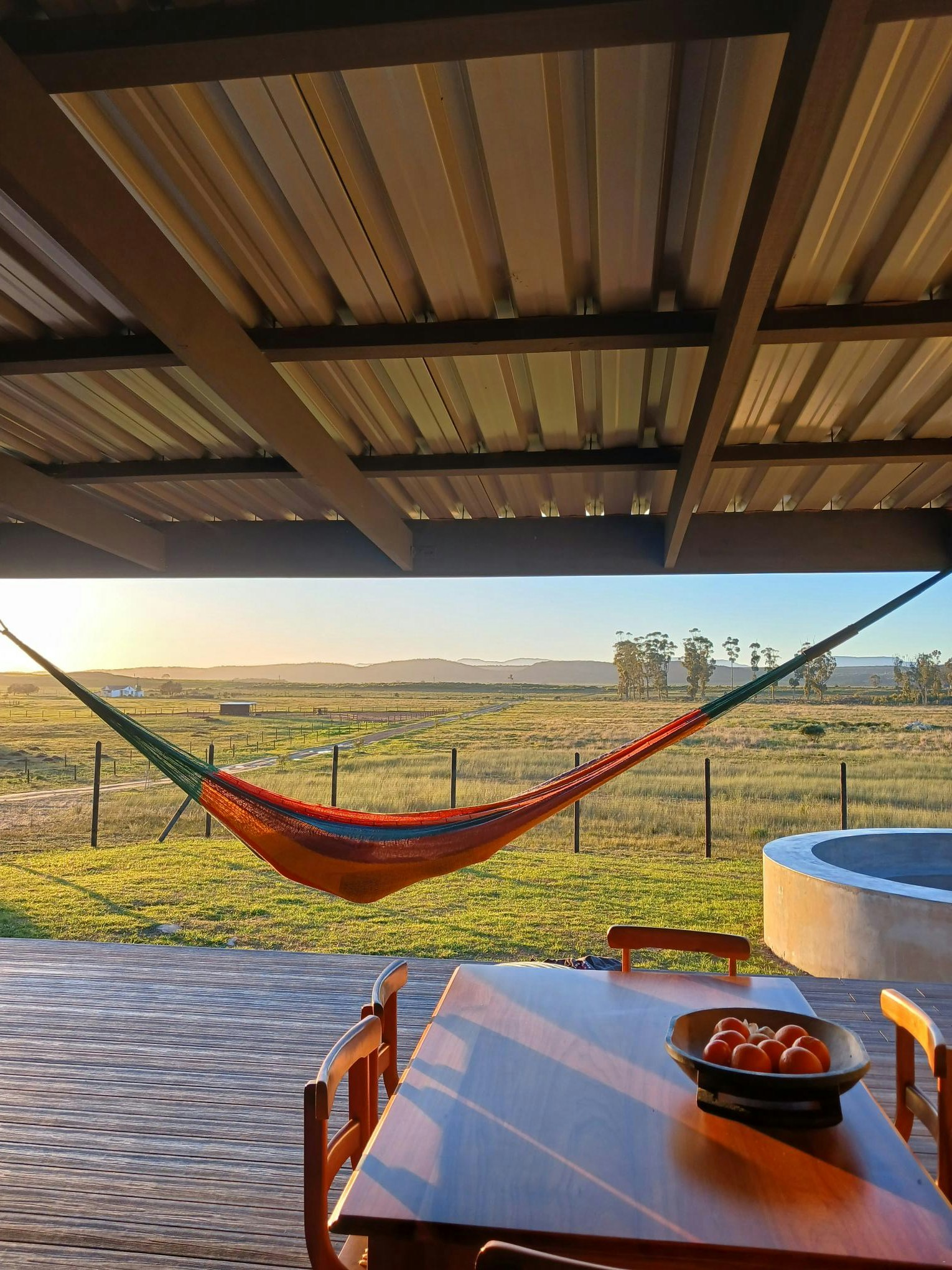Die leefarea lei na 'n dek met sitplek. Daar is ook 'n ingeboude braai en 'n vuurput met sitplek in die tuin. Veilige parkeerplek is vir 3 voertuie op die perseel beskikbaar.