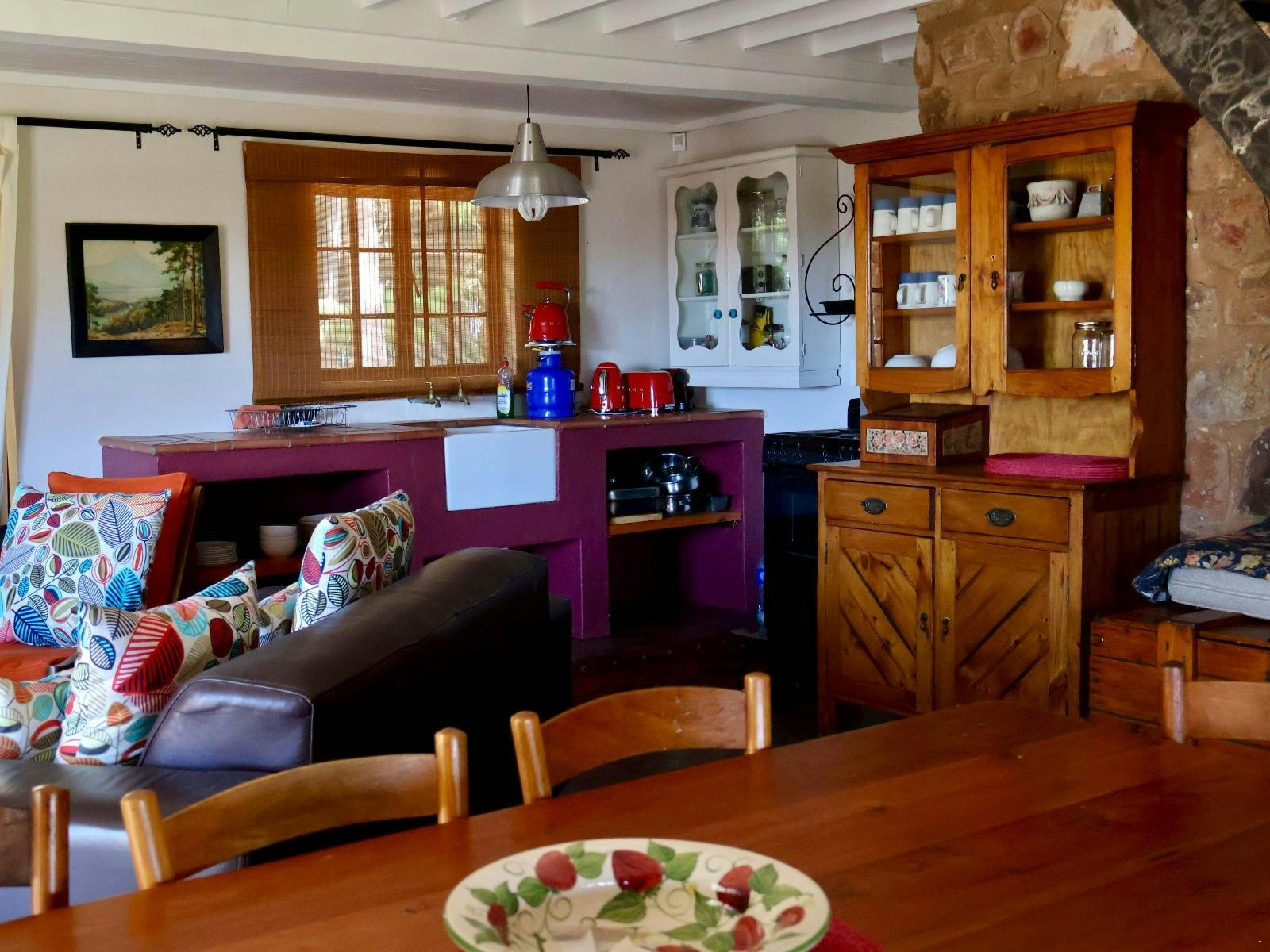 The open-plan kitchen is equipped with a fridge, stove, oven, microwave, cutlery, crockery, and tea- and coffee-making facilities, and opens to the lounge furnished with comfy seating and a lovely fireplace. There is also a lovely dining space where guests can enjoy their meals.