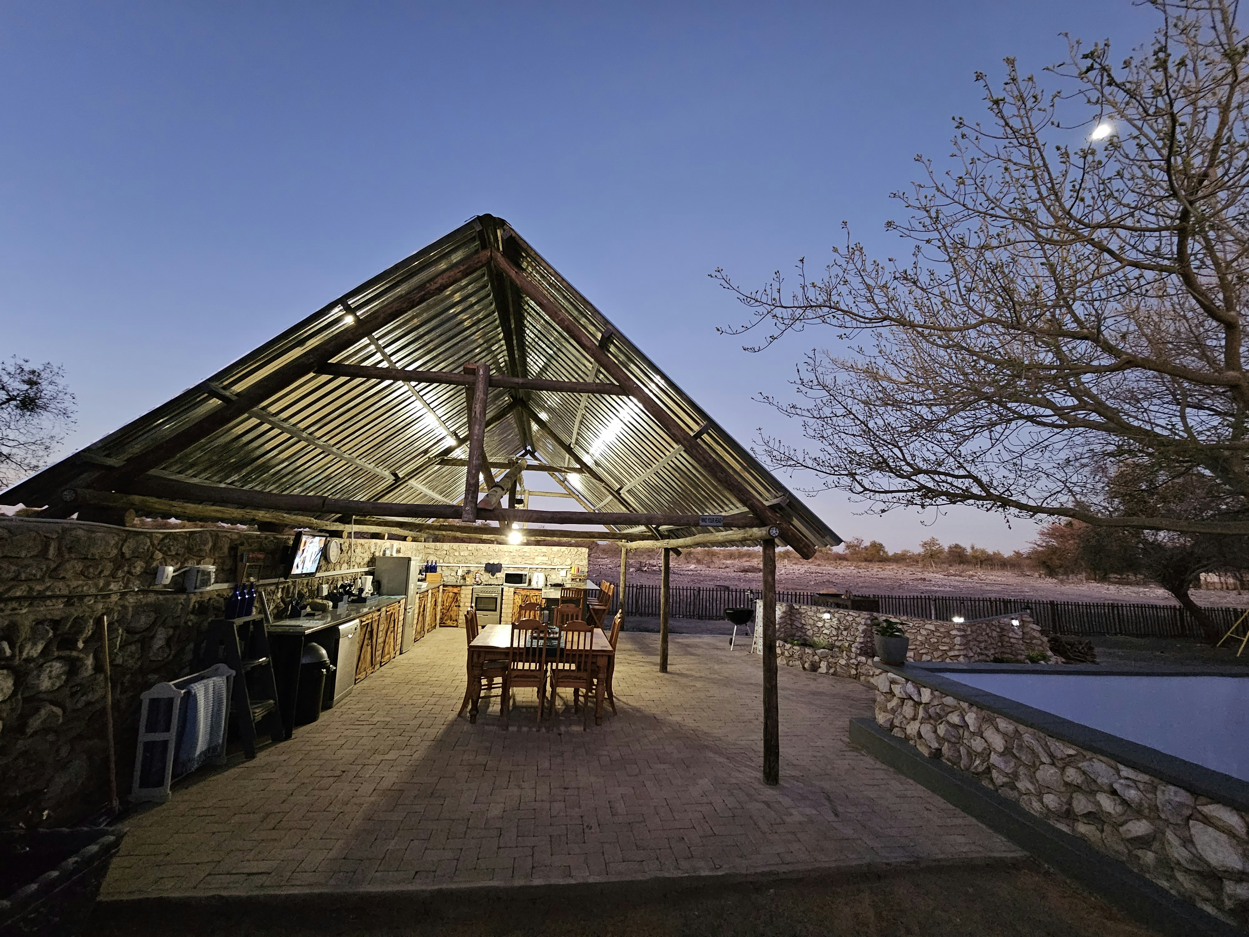 Alle gaste het toegang tot 'n volledig toegeruste gemeenskaplike buitekombuis en -eetarea. Dit is toegerus met 'n oond, mikrogolfoond, yskas-vrieskas, lugbraaier, broodrooster, eetgerei en breekware. Daarbenewens is daar 'n plonspoel en 'n boma waar gaste snags kan bymekaarkom. Hierdie eiendom beskik ook oor 'n Sundowner-dek met 'n houtvuur-warmbad beskikbaar vir gaste se gebruik.