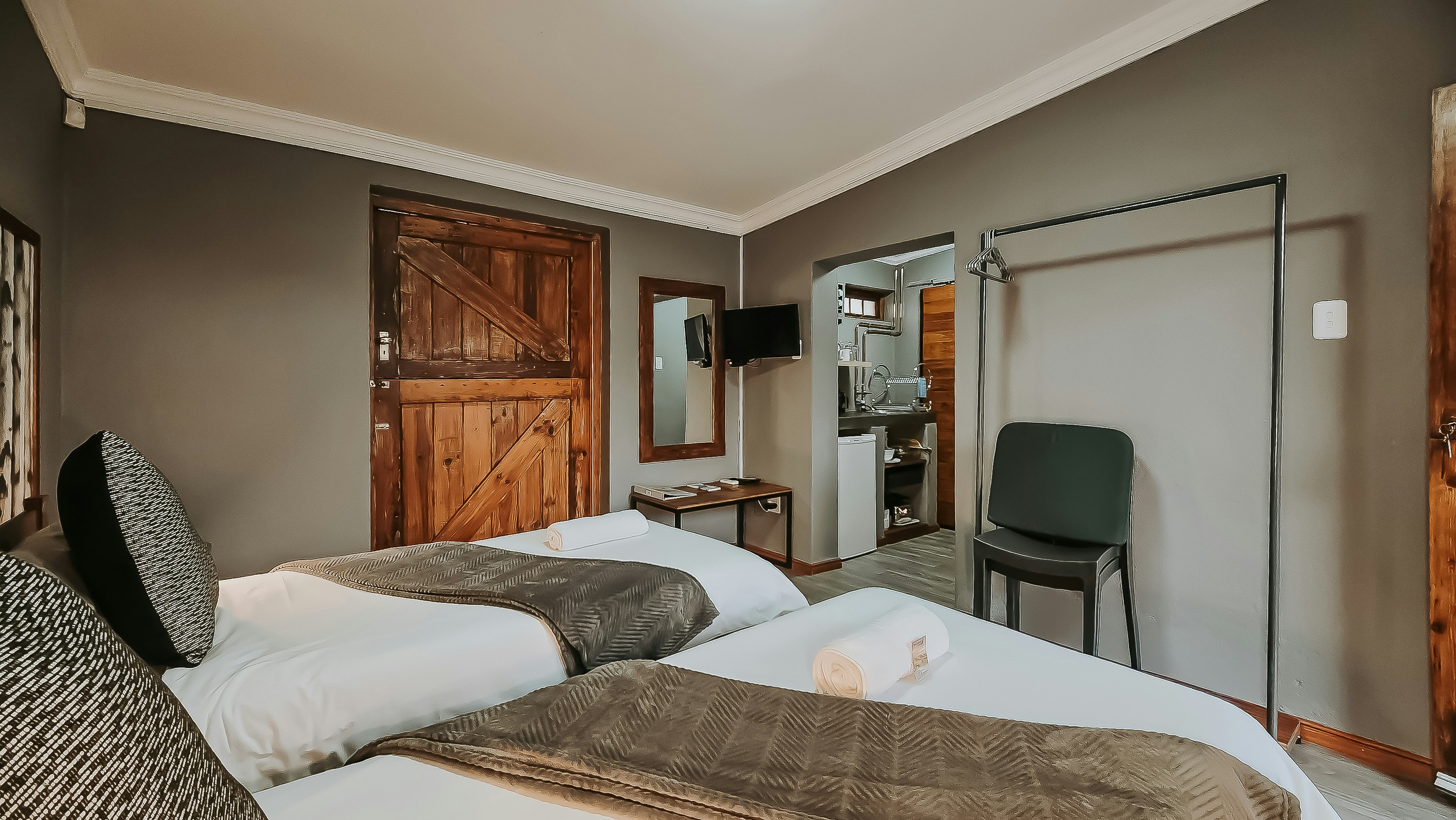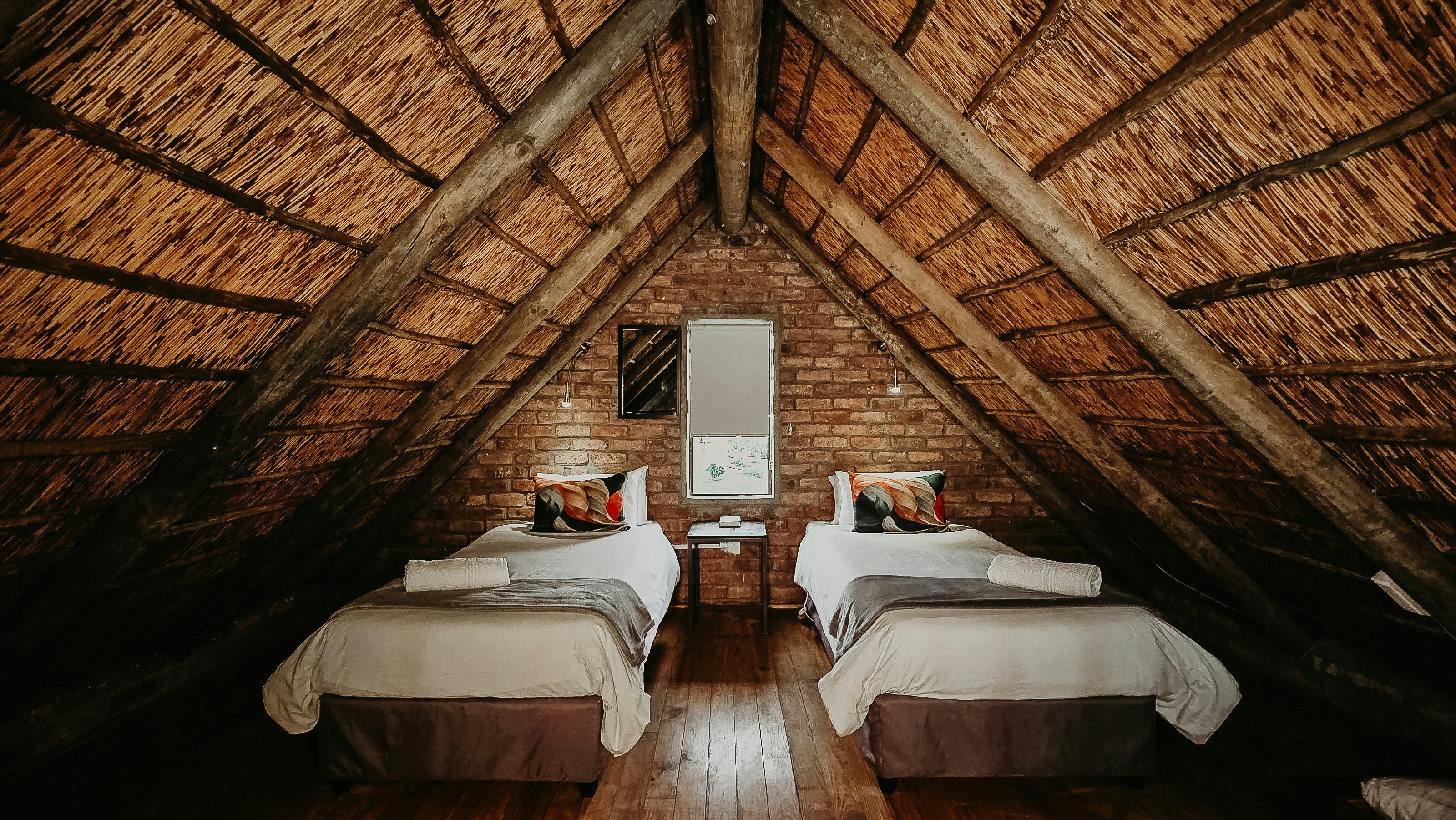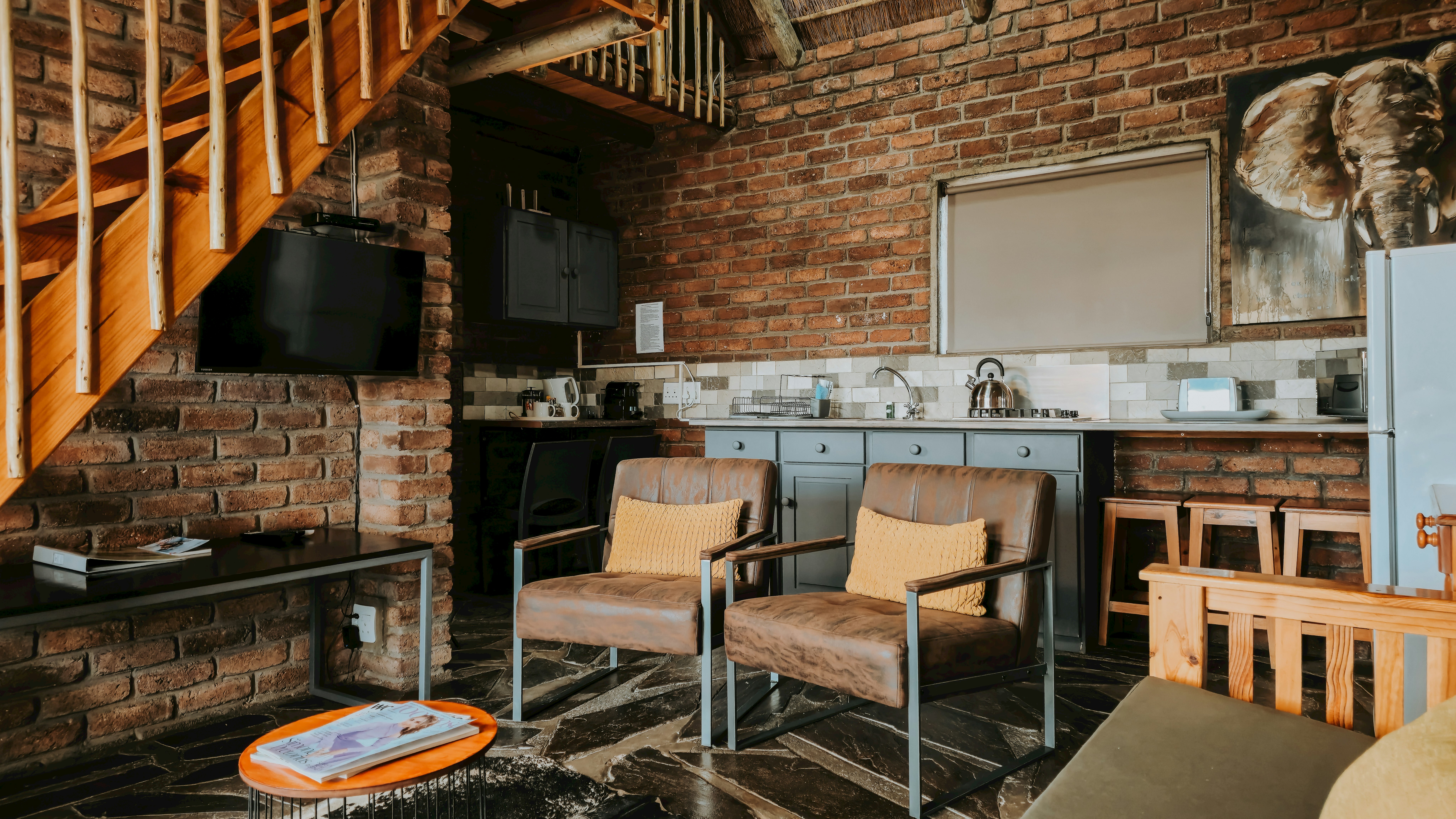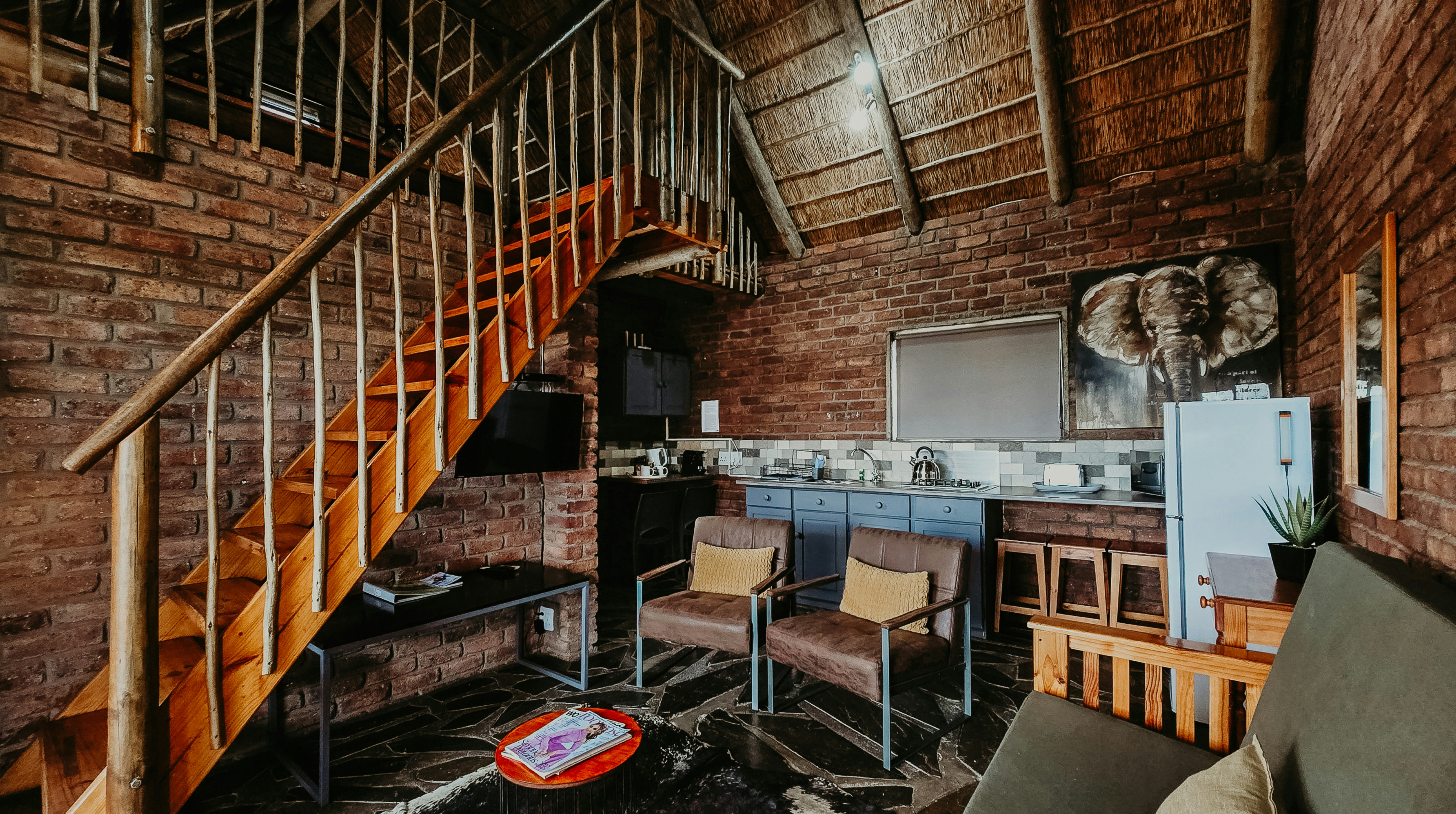Accommodation comprises fully-equipped chalets close to the main building, each with twin or double beds, a fold-out double sleeper couch, 2 single beds in the loft and private bathrooms, with either a bath and/or shower. Amenities include a smart TV and free Wi-Fi access. DStv is also available in the chalets. Air-conditioning in all rooms/units. Up to 6 people can be accommodated per self-catering chalet.