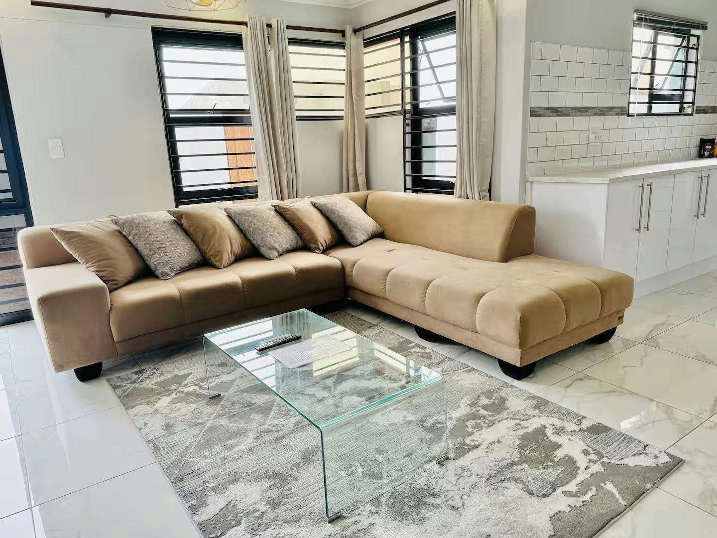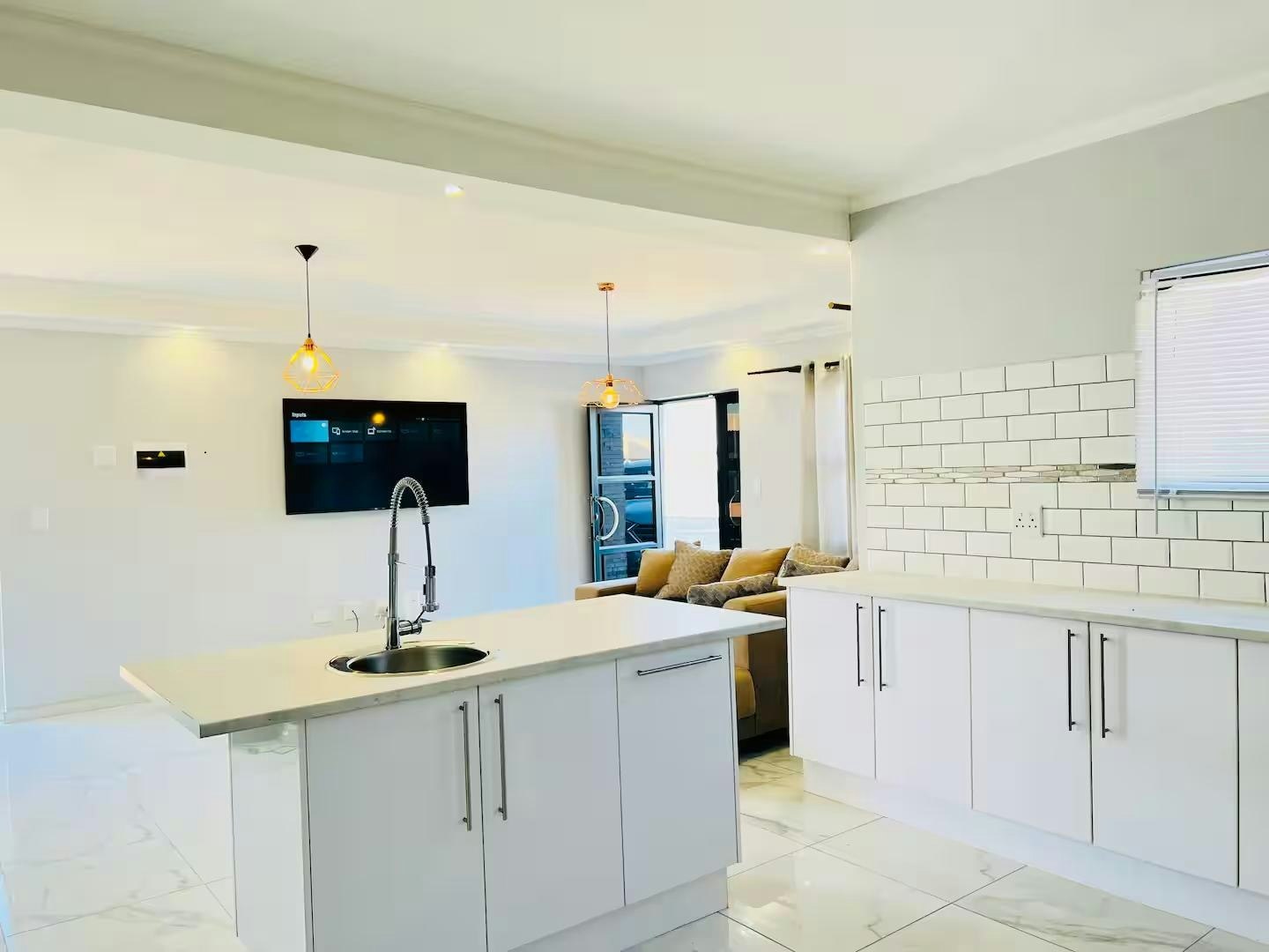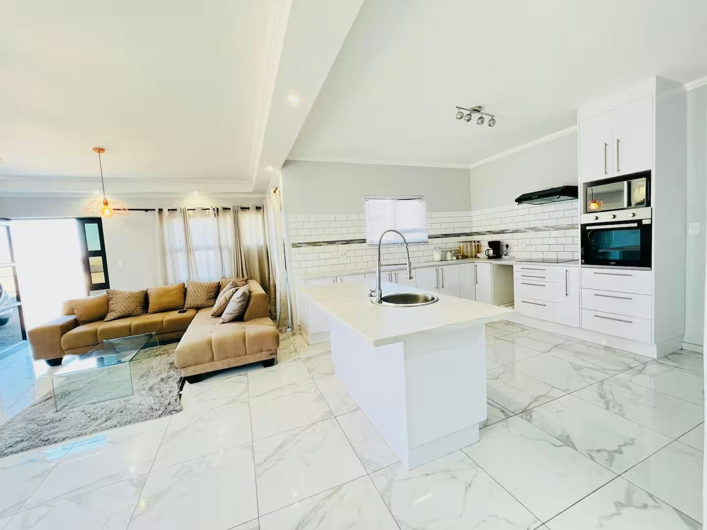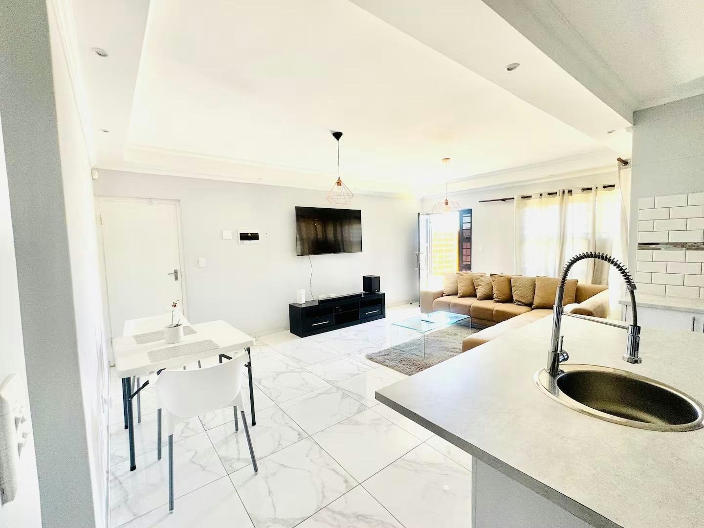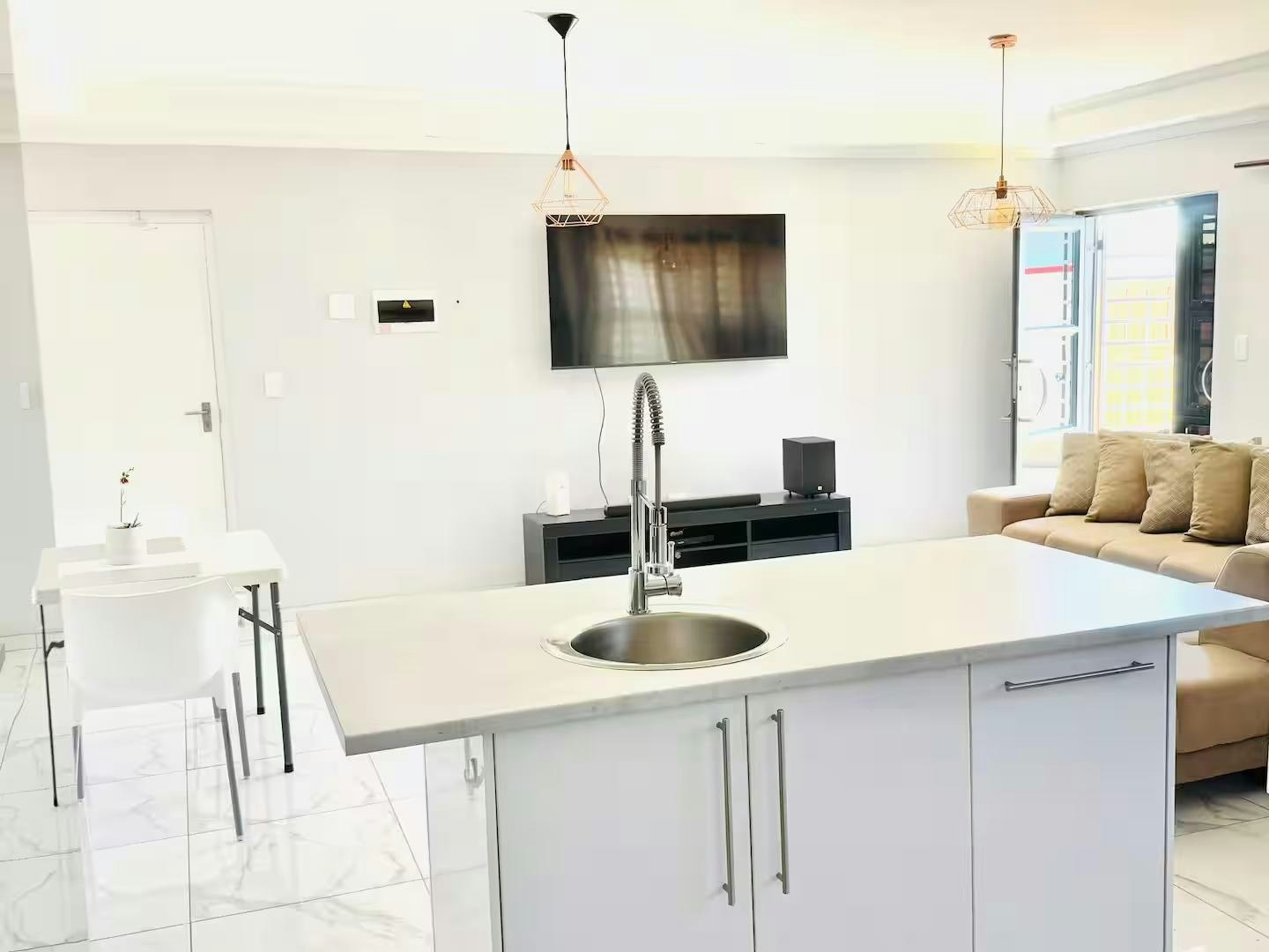 Die oopplan-leefruimte beskik oor 'n aangewese werkstasie, 'n eetarea en 'n sitkamer met 'n slim-TV gelaai met Netflix en 'n gemaklike rusbank. Die kombuis is volledig toegerus met 'n yskas-vrieskas, stoof, oond en mikrogolfoond.