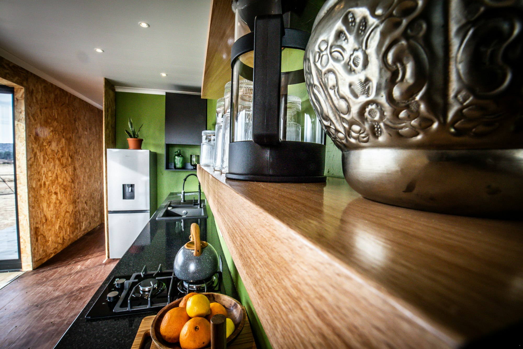 Die kombuis is met 'n yskas, tweeplaatgasstoof, mikrogolf en koffie- en teemaakgeriewe toegerus. Die toonbank dien ook as 'n ontbythoekie en die sitarea het 'n rusbank.