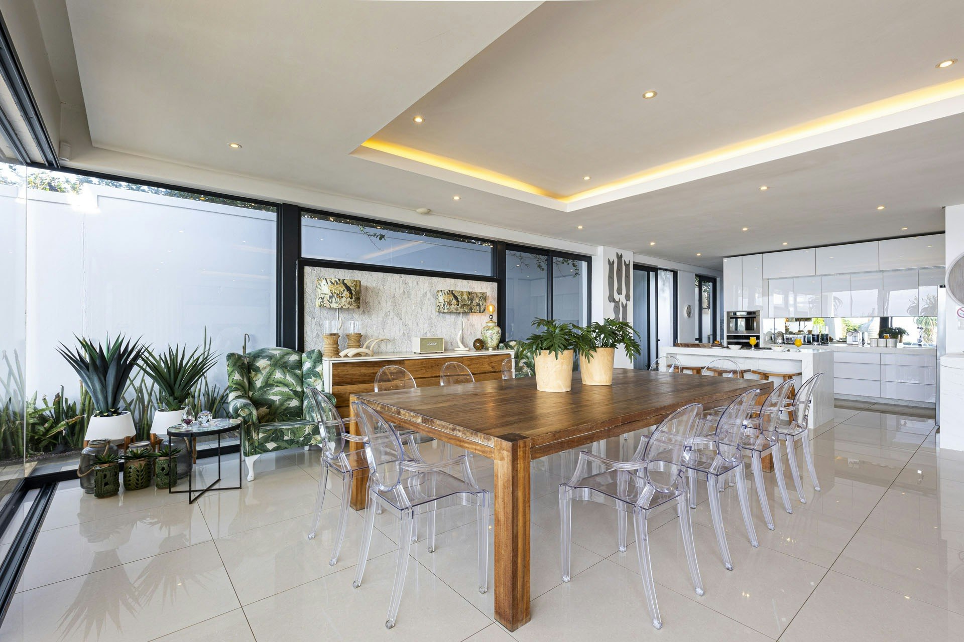 The modern kitchen is equipped with a stove, oven, fridge-freezer, microwave, coffee- and tea-making facilities, crockery and cutlery. It also features a washing machine, dishwasher, and tumble dryer for guests' convenience. The open-plan lounge has comfortable couches as well as a TV with DStv, and a 12-seater dining area with ample seating where guests can enjoy their meals together. Guests can also enjoy complimentary Wi-Fi access.