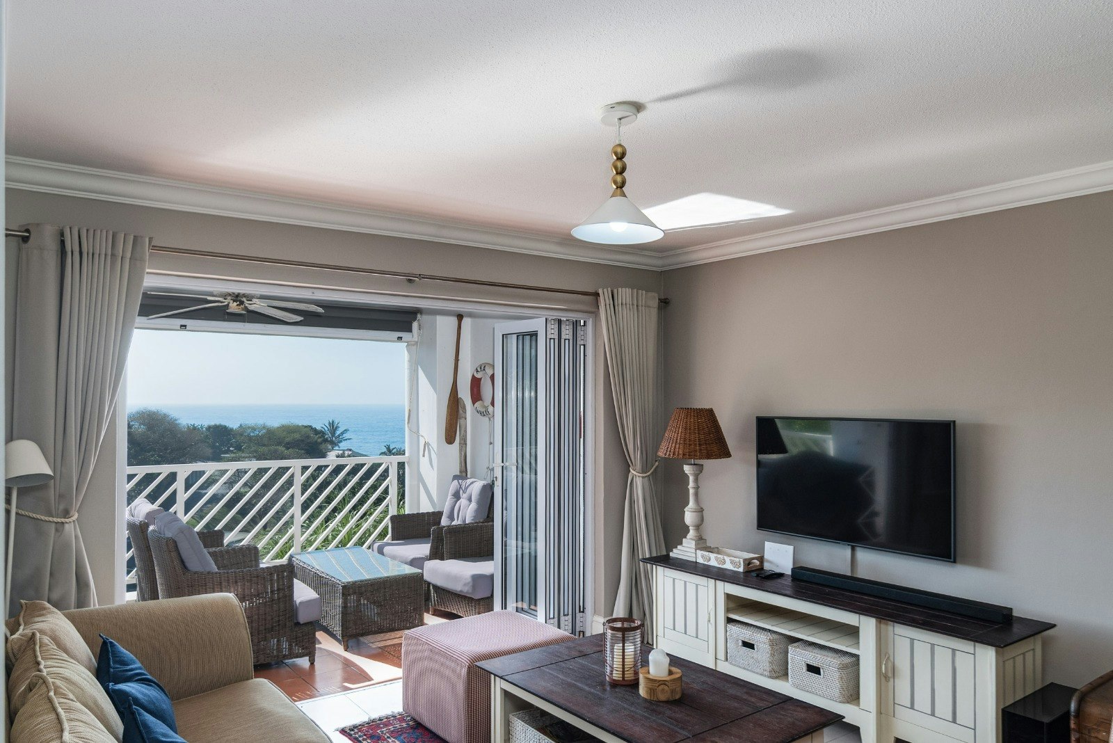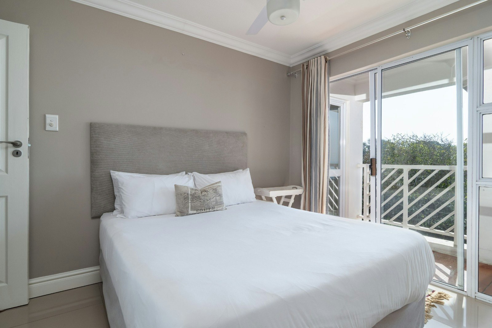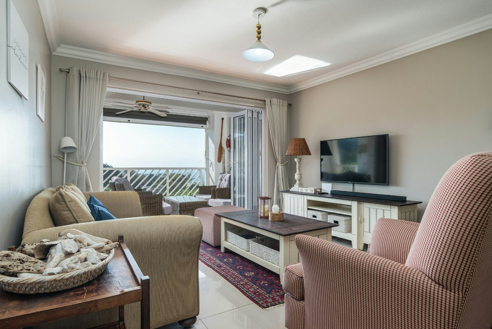 The living area opens onto a covered patio with seating and gas braai facilities, overlooking the breathtaking Indian Ocean. It offers a partial sea view and provides a tranquil setting, perfect for unwinding. Guests also have access to a communal swimming pool, a well maintained garden, a tennis court, and secure on-site parking within the complex.