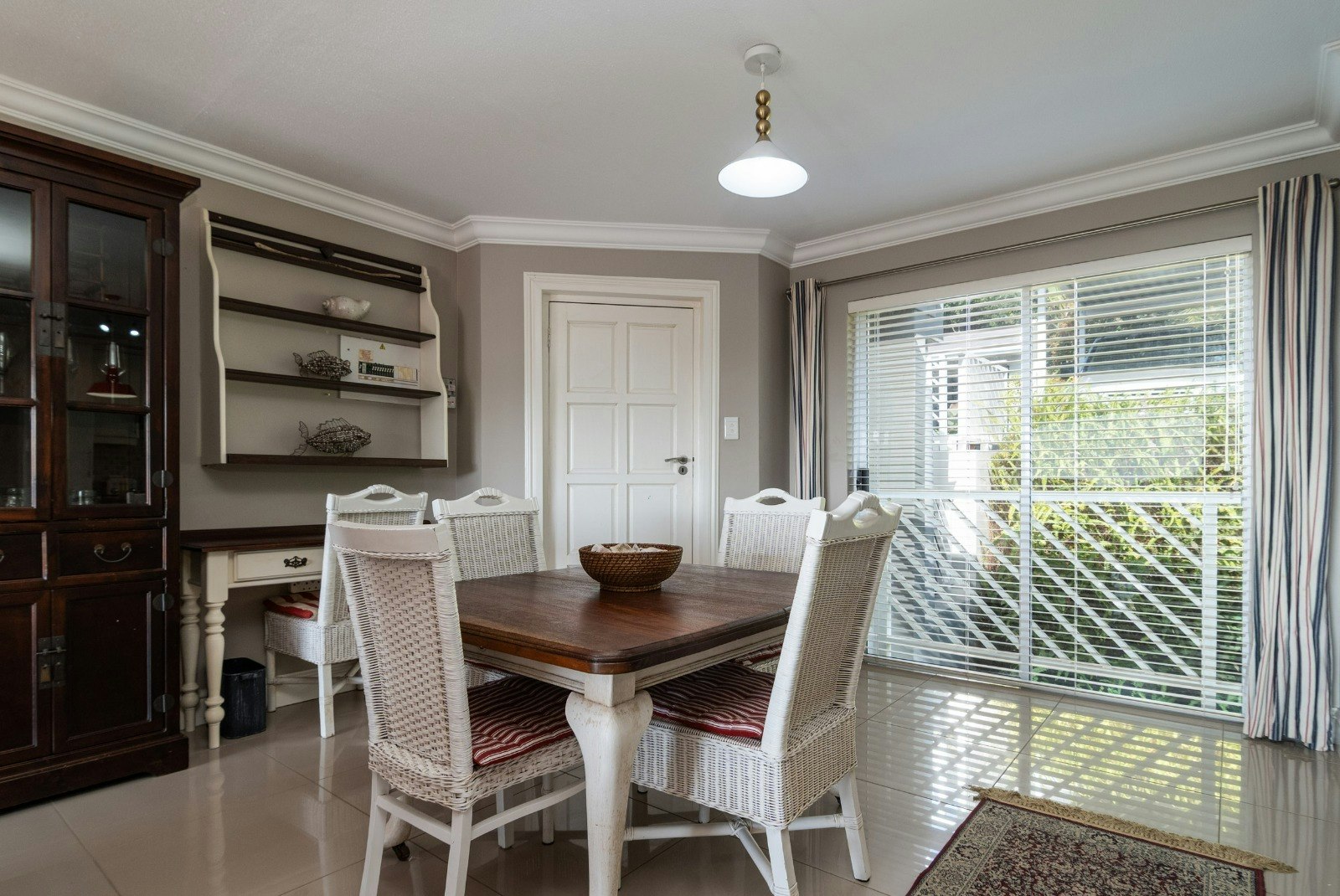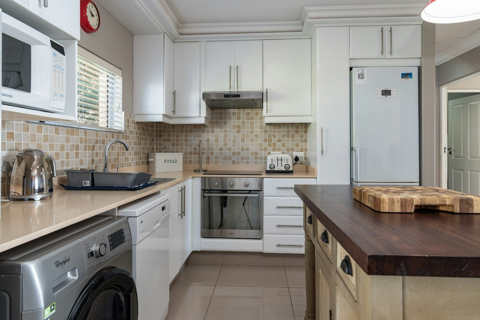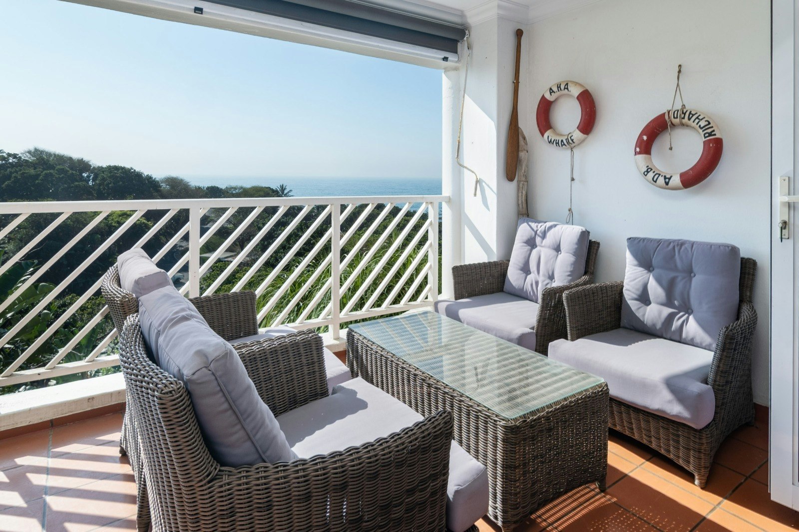 The living area opens onto a covered patio with seating and gas braai facilities, overlooking the breathtaking Indian Ocean. It offers a partial sea view and provides a tranquil setting, perfect for unwinding. Guests also have access to a communal swimming pool, a well maintained garden, a tennis court, and secure on-site parking within the complex.