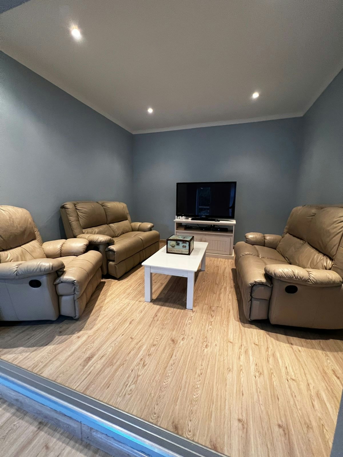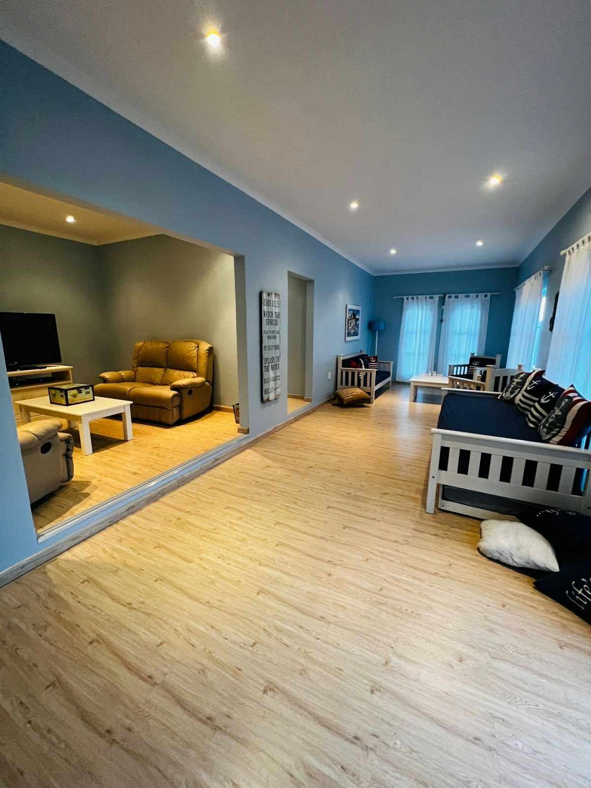 The open-plan kitchen is equipped with a fridge-freezer, microwave, oven, stove, cutlery, crockery, and tea- and coffee-making facilities. The living area includes a TV and comfortable couches. This area extends to a second living area with ample couches and a built-in braai.