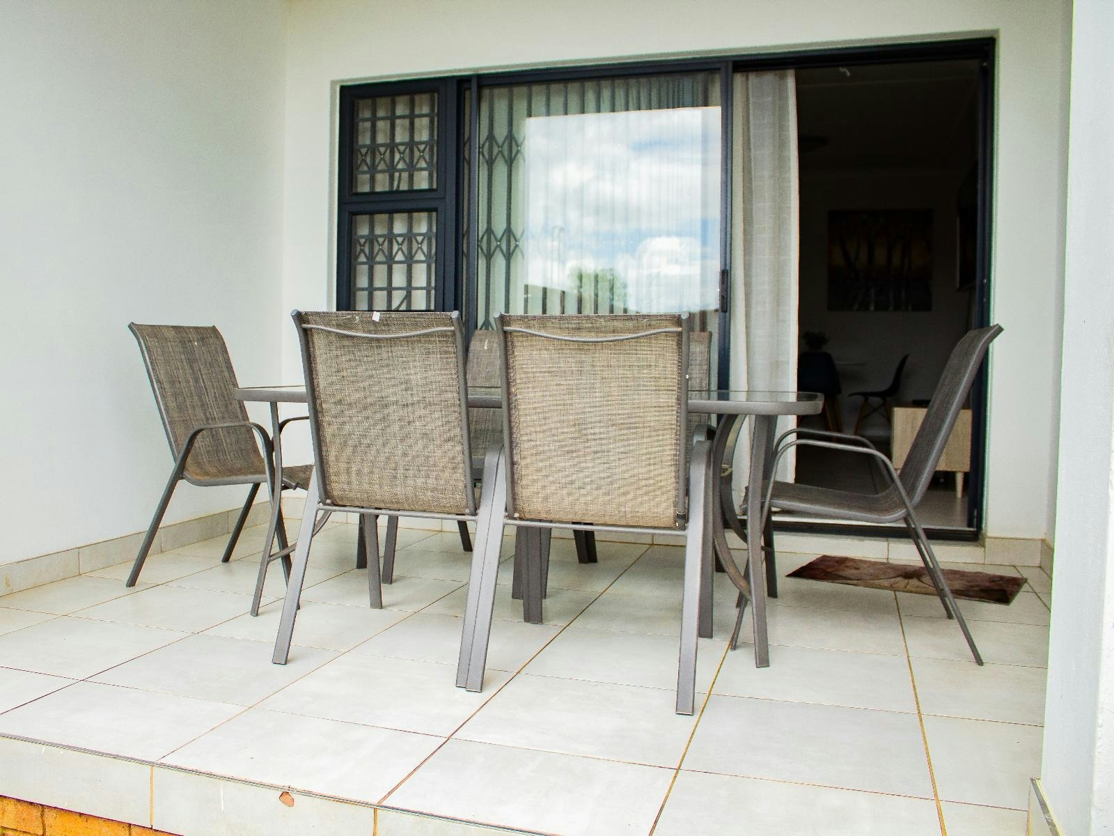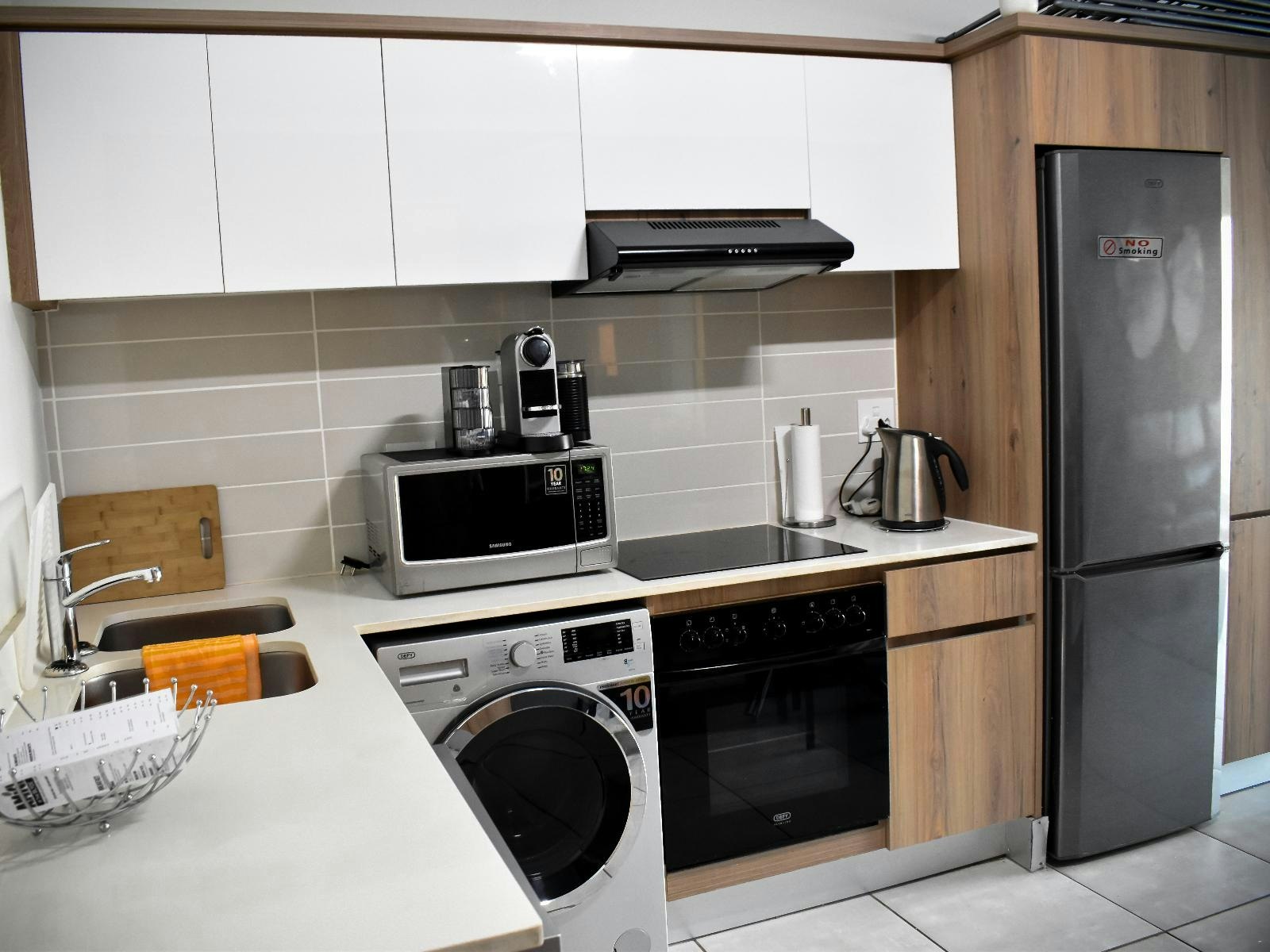 Die oopplan-leefarea sluit 'n volledig toegeruste kombuis in met 'n stoof, oond, mikrogolfoond, yskas-vrieskas, broodrooster, eetgerei, breekware en tee- en koffiemaakgeriewe. 'n Wasmasjien en skottelgoedwasser is ook beskikbaar. Vanuit die kombuis is 'n eetkamertafel met stoele en die sitkamer met 'n gemaklike rusbank en 'n TV. Skuifdeure maak oop na 'n privaat patio met buitemeubels, met uitsig oor die welige tuin en braai-area.