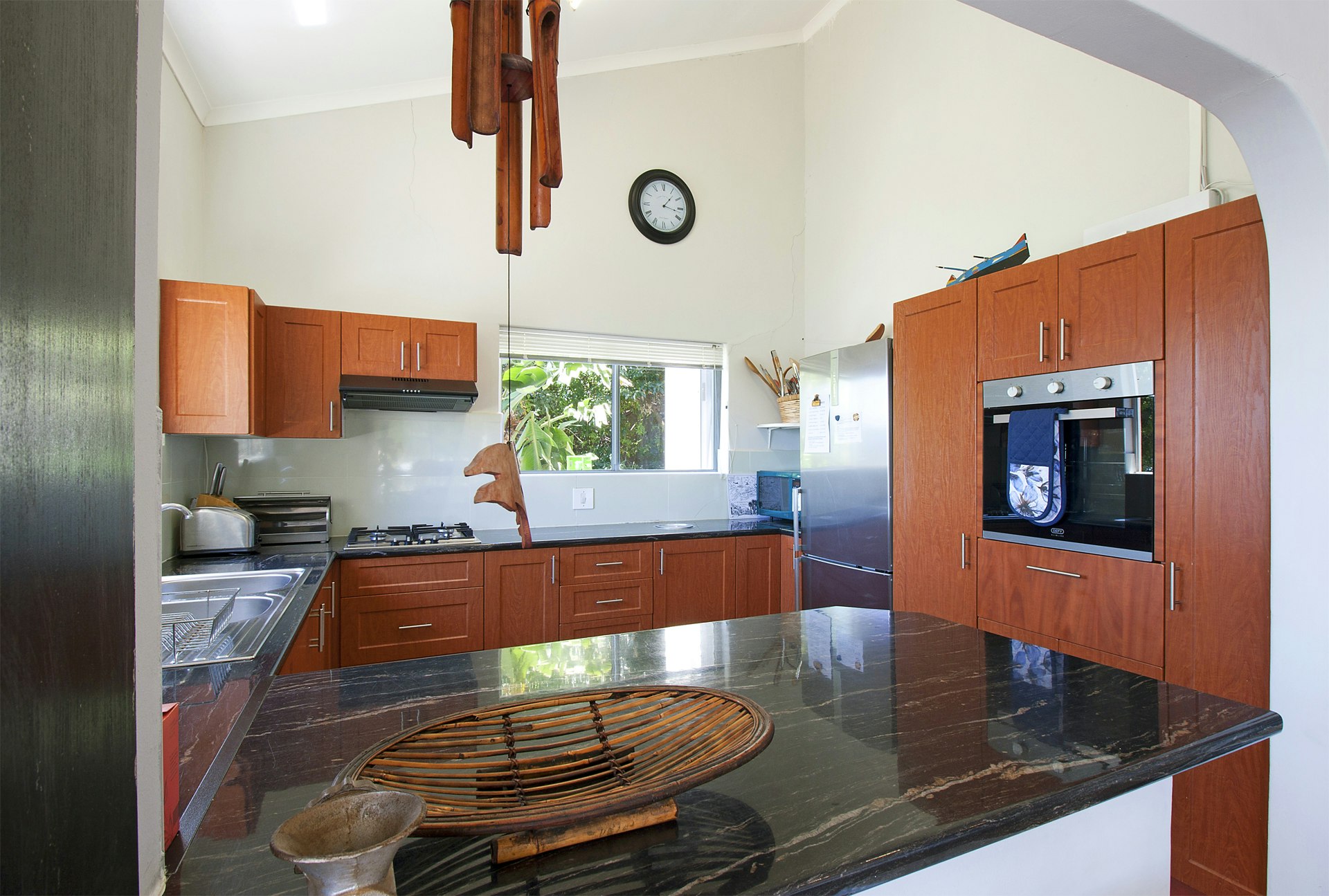 The kitchen is equipped with a fridge-freezer, gas stove, oven, microwave, and dishwasher. The open-plan living area features a 6-seater dining table, a comfy lounge suite, and a TV. The balcony outside offers braai facilities and sea views, leading to a garden with a swimming pool where guests can relax and unwind.