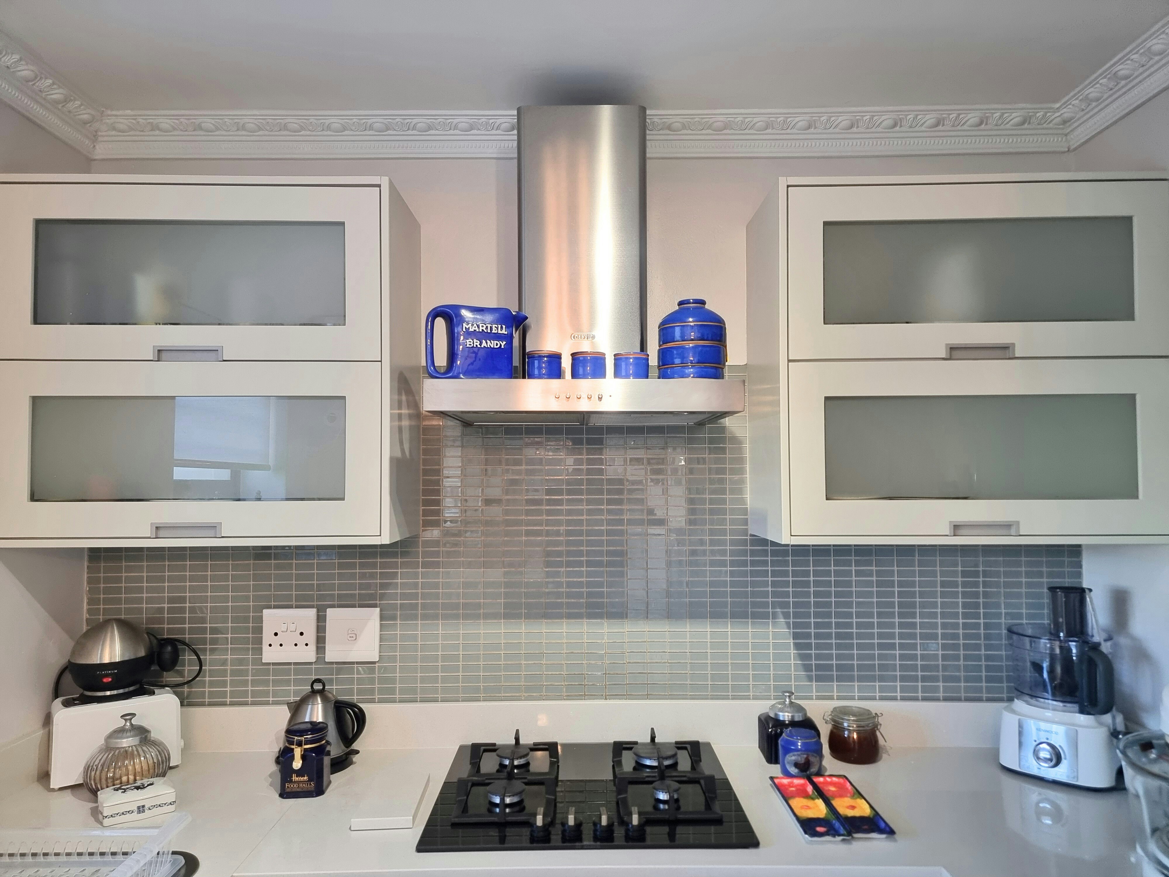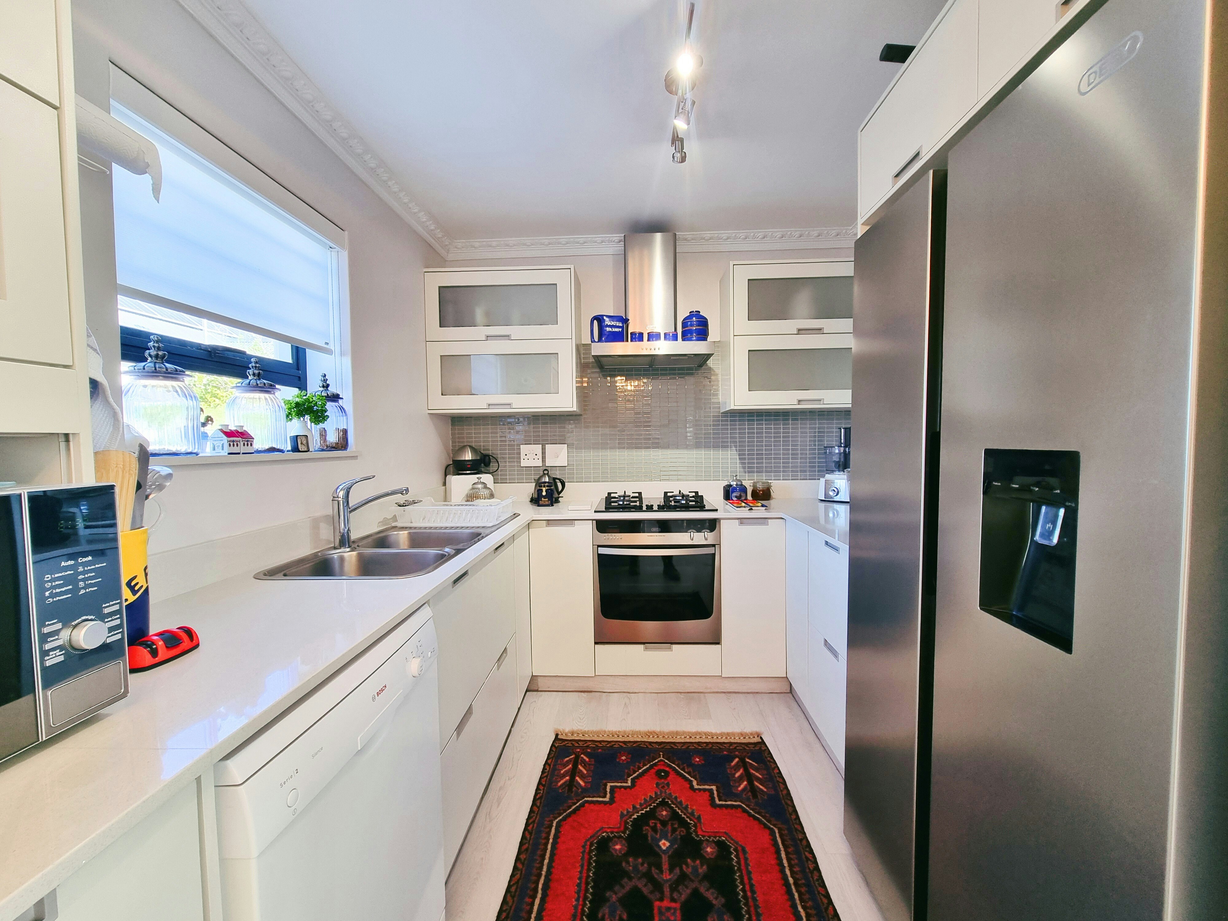 Die volledig toegeruste kombuis bevat 'n stoof, oond, yskas-vrieskas, mikrogolfoond, ketel, broodrooster, eetgerei en breekware. Die oopplan-leefarea bied gemaklike sitplek en eetarea.