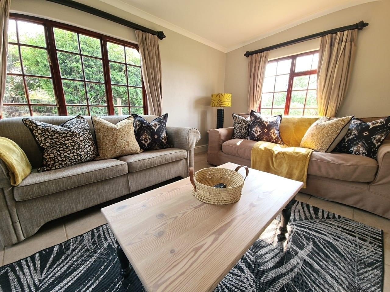The Serendipity Cottage can sleep up to 4 guests and comprises 1 bedroom, 1 bathroom, a kitchen and a living area. The bedroom is furnished with a queen-size bed and features an en-suite bathroom fitted with a bath, toilet and washbasin. The kitchen is equipped with self-catering amenities. The living area is furnished with 2 couches, one of which converts into a double sleeper couch. The cottage also has a fireplace and a flat-screen TV. The dining room has a dining table and chairs where guests can enjoy their meals together. Leading outdoors is a private patio with outdoor furniture, braai facilities, and an enclosed garden.