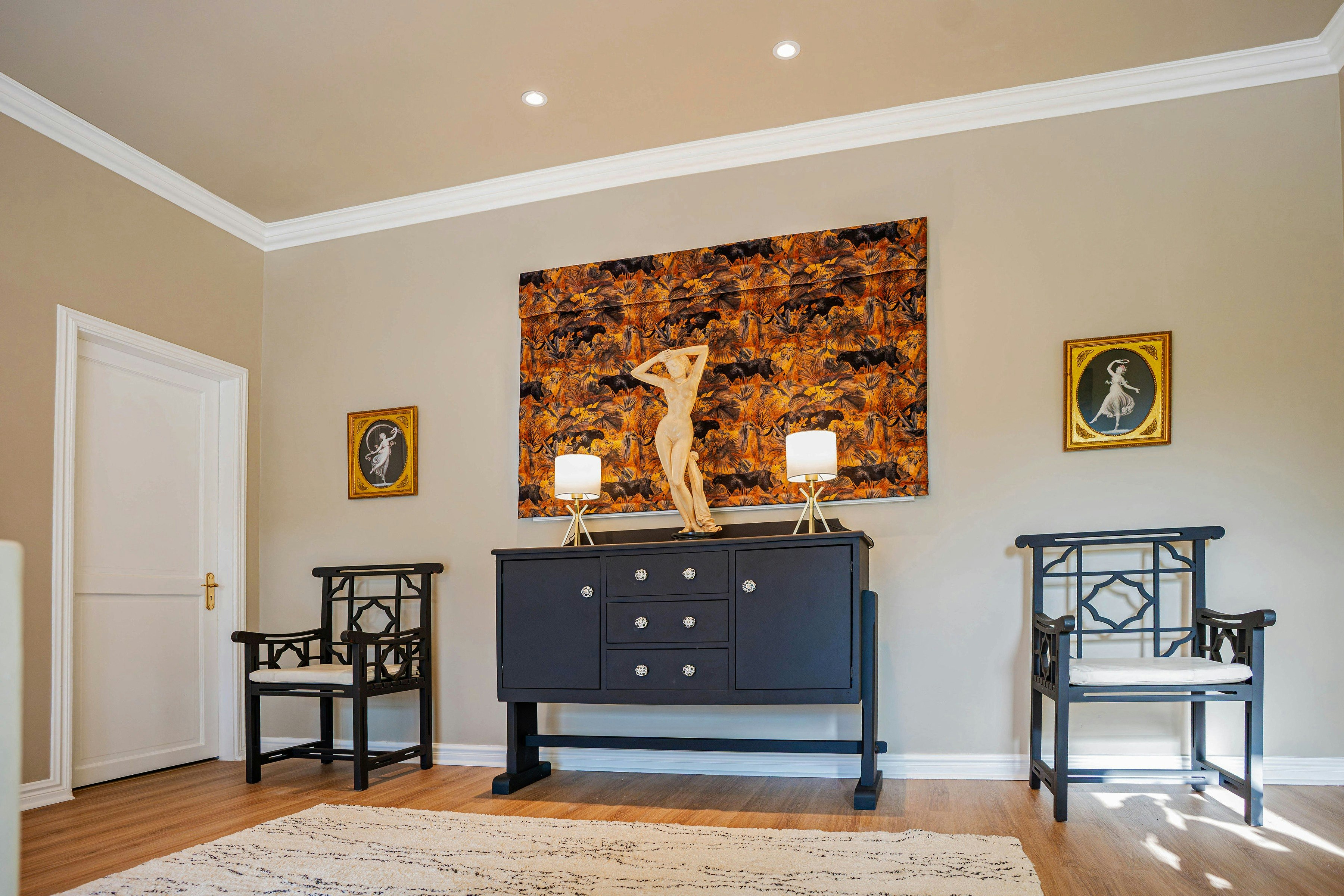 Die huis bestaan uit 3 en suite-slaapkamers bo; die hoofslaapkamer is gemeubileer met 'n koninggrootte-bed en 'n en suite-badkamer met 'n stort, bad, toilet en wasbak. Die tweede slaapkamer is gemeubileer met 'n koninggrootte-bed en 'n en suite-badkamer met 'n stort, toilet en wasbak. Die derde slaapkamer is gemeubileer met 'n koningingrootte-bed en 'n en suite-badkamer met 'n stort, toilet en wasbak. Die balkon kyk uit oor die landgoed en bied gemaklike sitplek om 'n oggendkoffie te geniet.