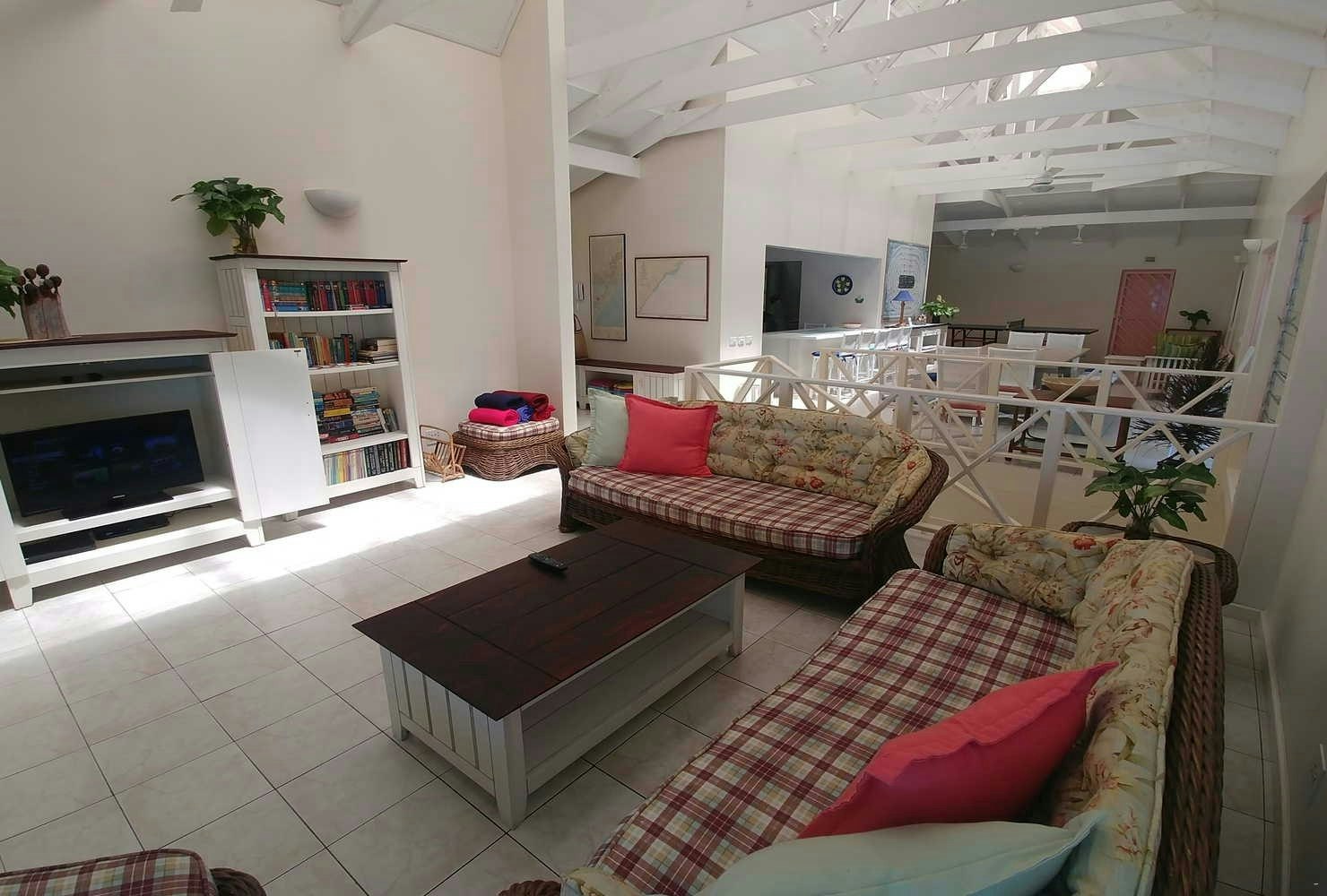 The kitchen is equipped with a 2 fridge-freezers, stove, oven, microwave, cutlery and crockery, dishwasher, tea- and coffee-making facilities and a breakfast bar with stools. The large open-plan living area is furnished with a dining table, a table tennis table, ample comfortable furniture and a TV with DStv. The living room opens onto the covered wrap-around balcony that is furnished with outdoor furniture, a dining table and a braai. Access to Wi-Fi is available.
