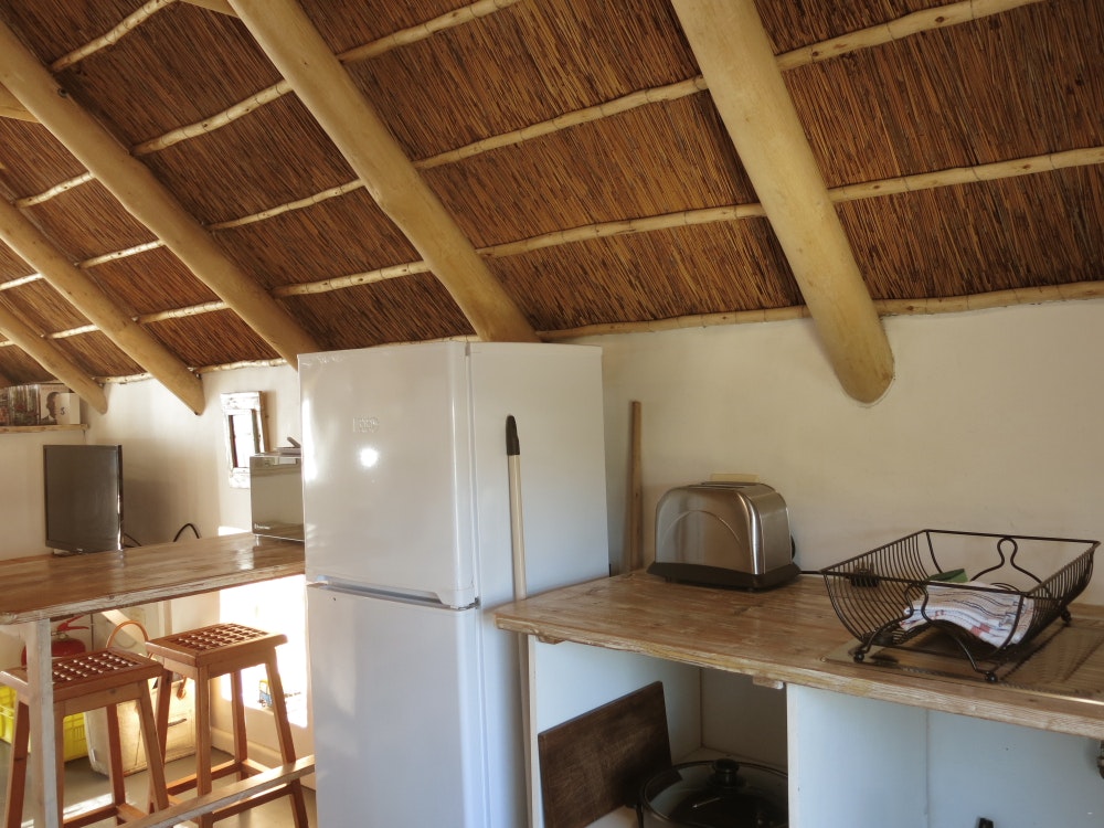 There is a kitchenette area which has an electric frying pan, 1 electric stove plate, 1 plate gas stove, kettle, toaster, microwave and fridge. Outside on the balcony, there is a portable braai and a table with 2 chairs where guests can enjoy the view of the ocean between the houses.