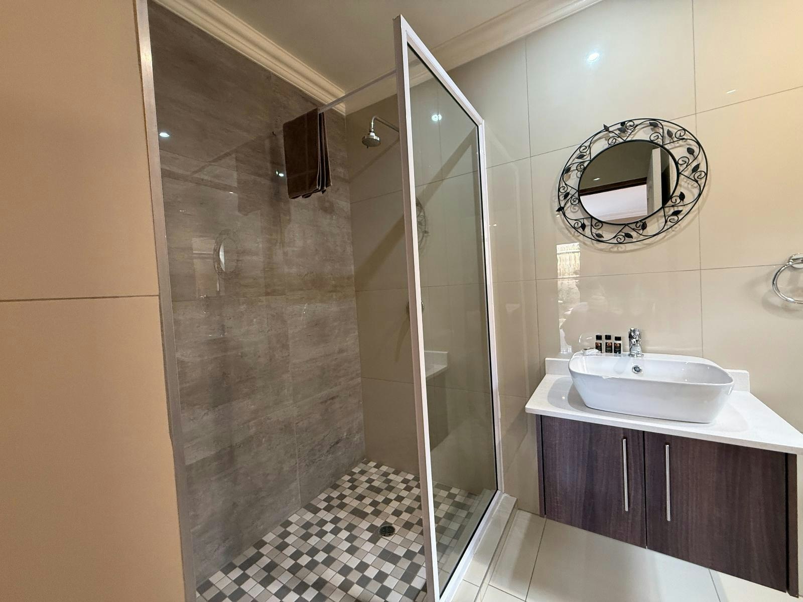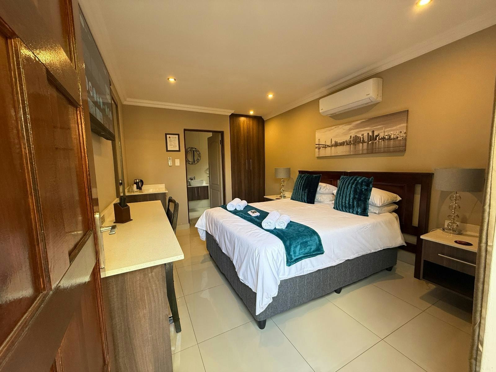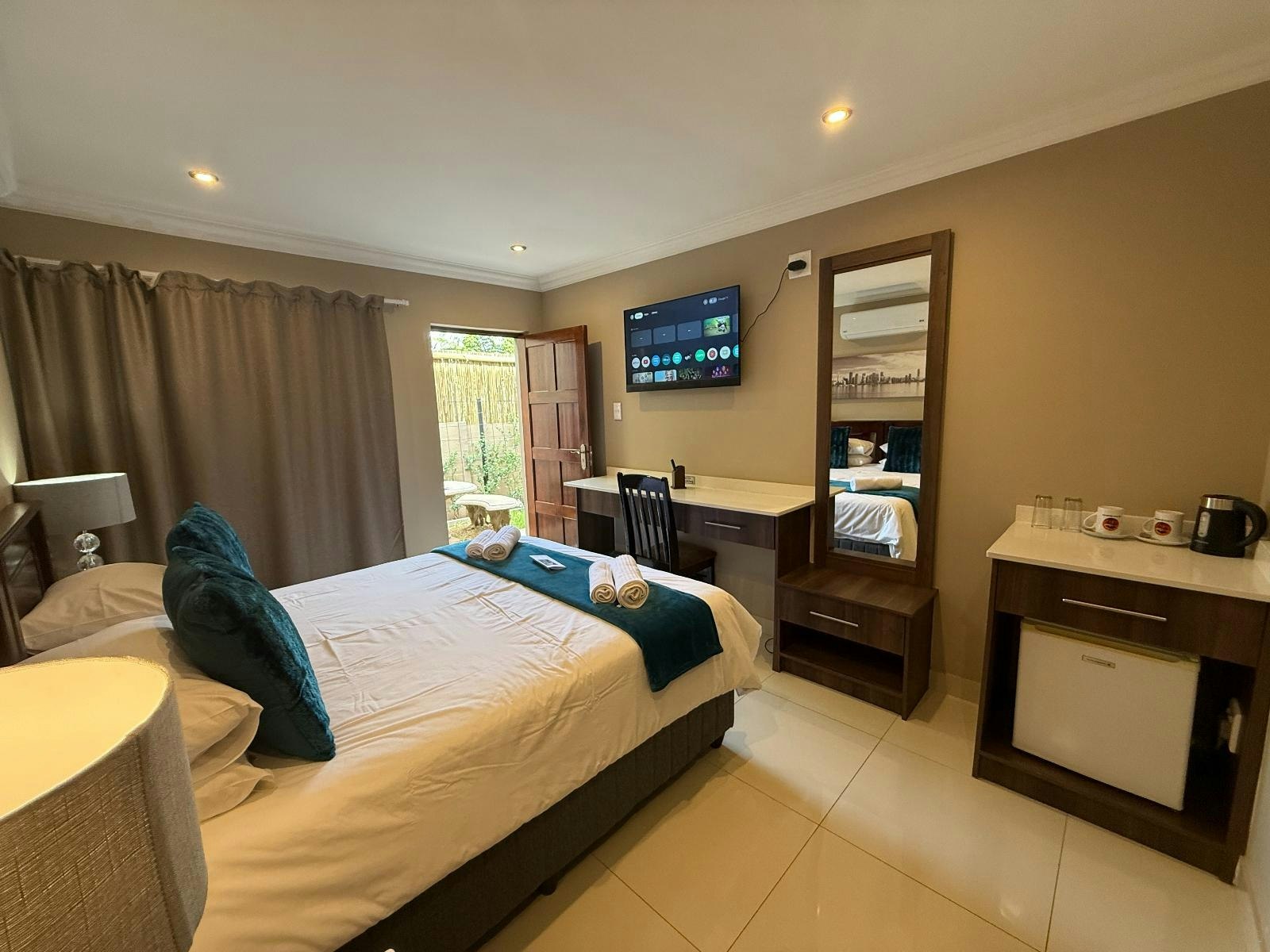 Hierdie kamer het 'n ekstra lang koningingrootte-bed en 'n en suite-badkamer met 'n spa-bad, wasbak en toilet. Geriewe in die kamer sluit lugversorging, 'n TV met DStv Essential-pakket en 'n yskas met verversings in.
