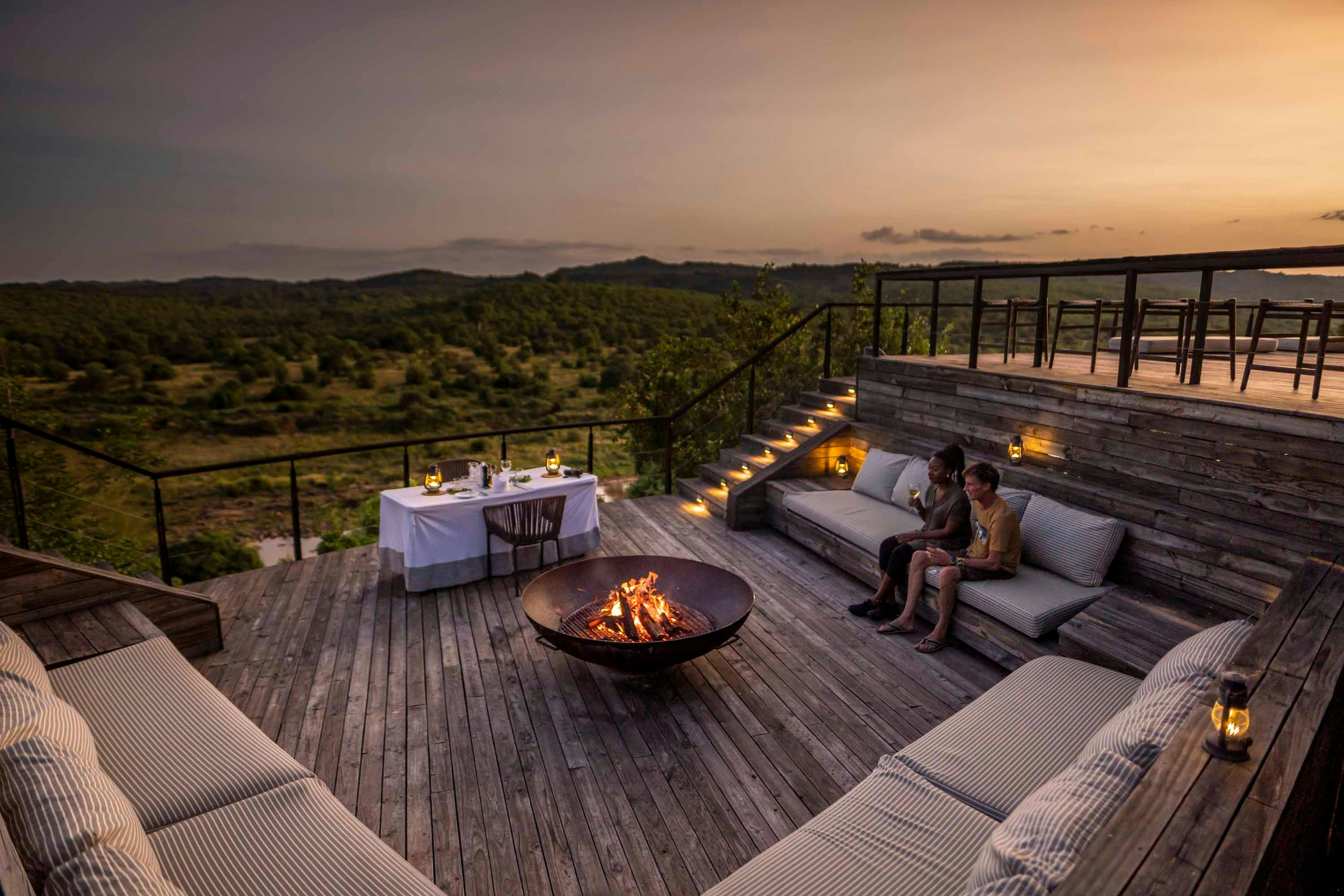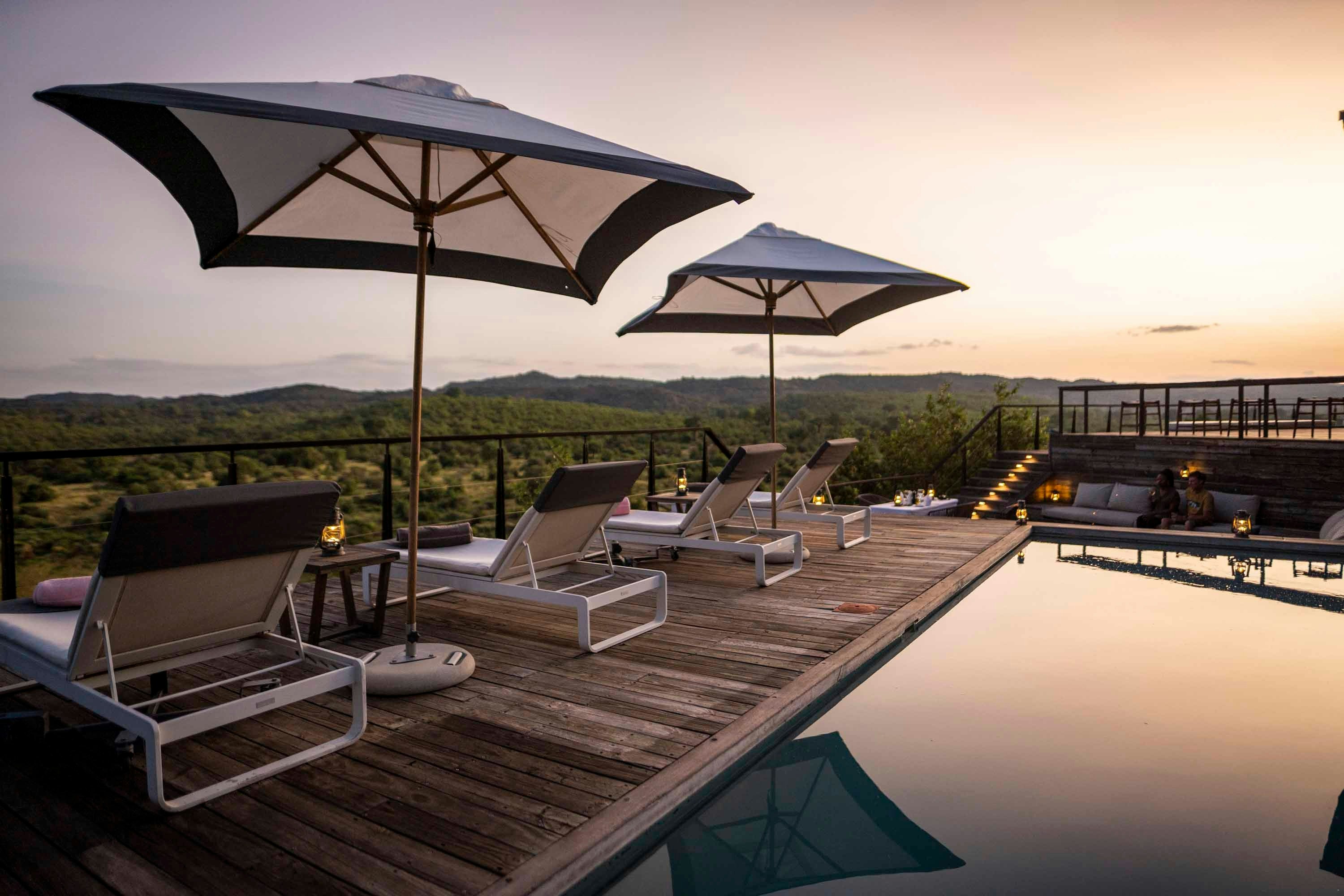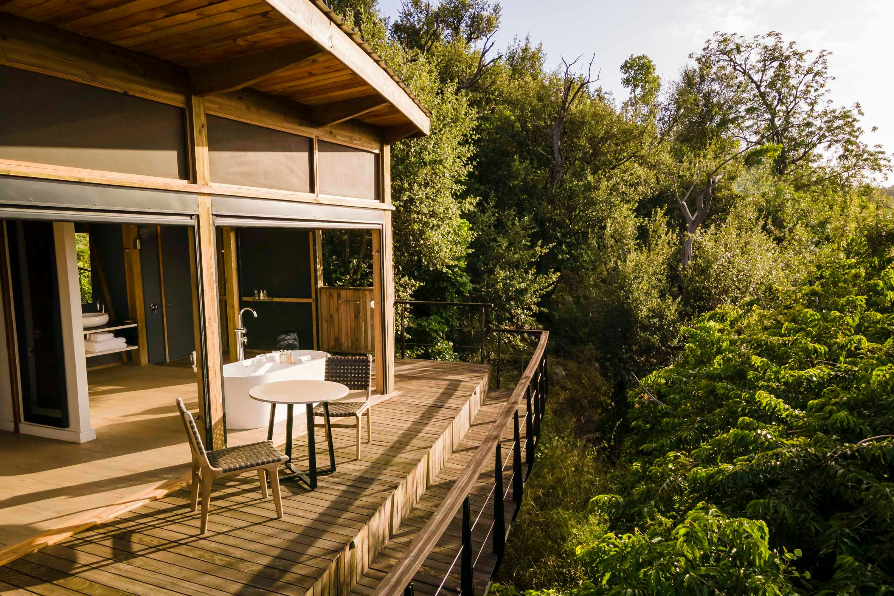 Elke oopplan-suite het 'n sitarea en buiteterras met 'n dubbeldagbed. Elke badkamer het 'n rotsbad en 'n oop stort met 'n asemrowende uitsig.
